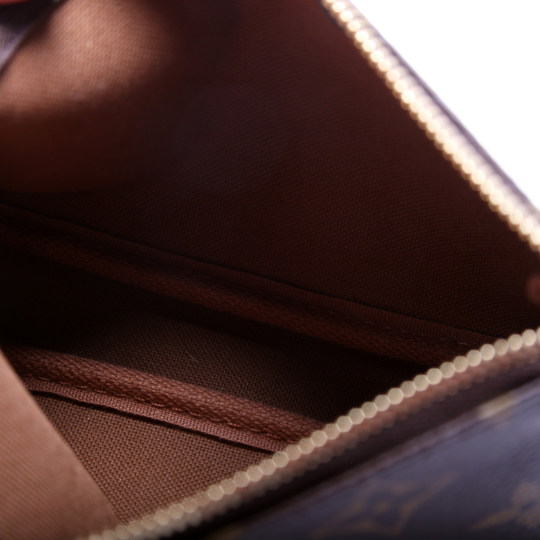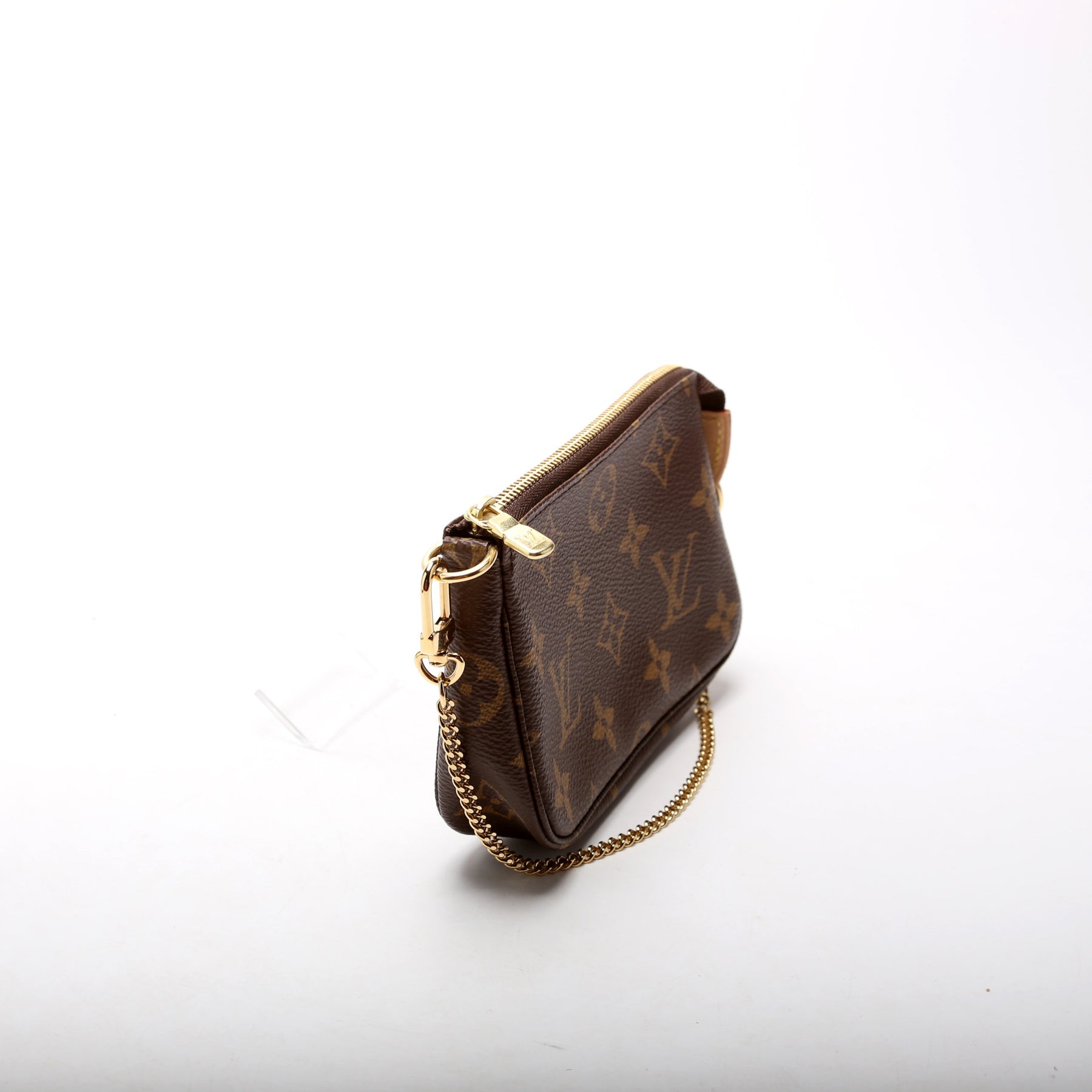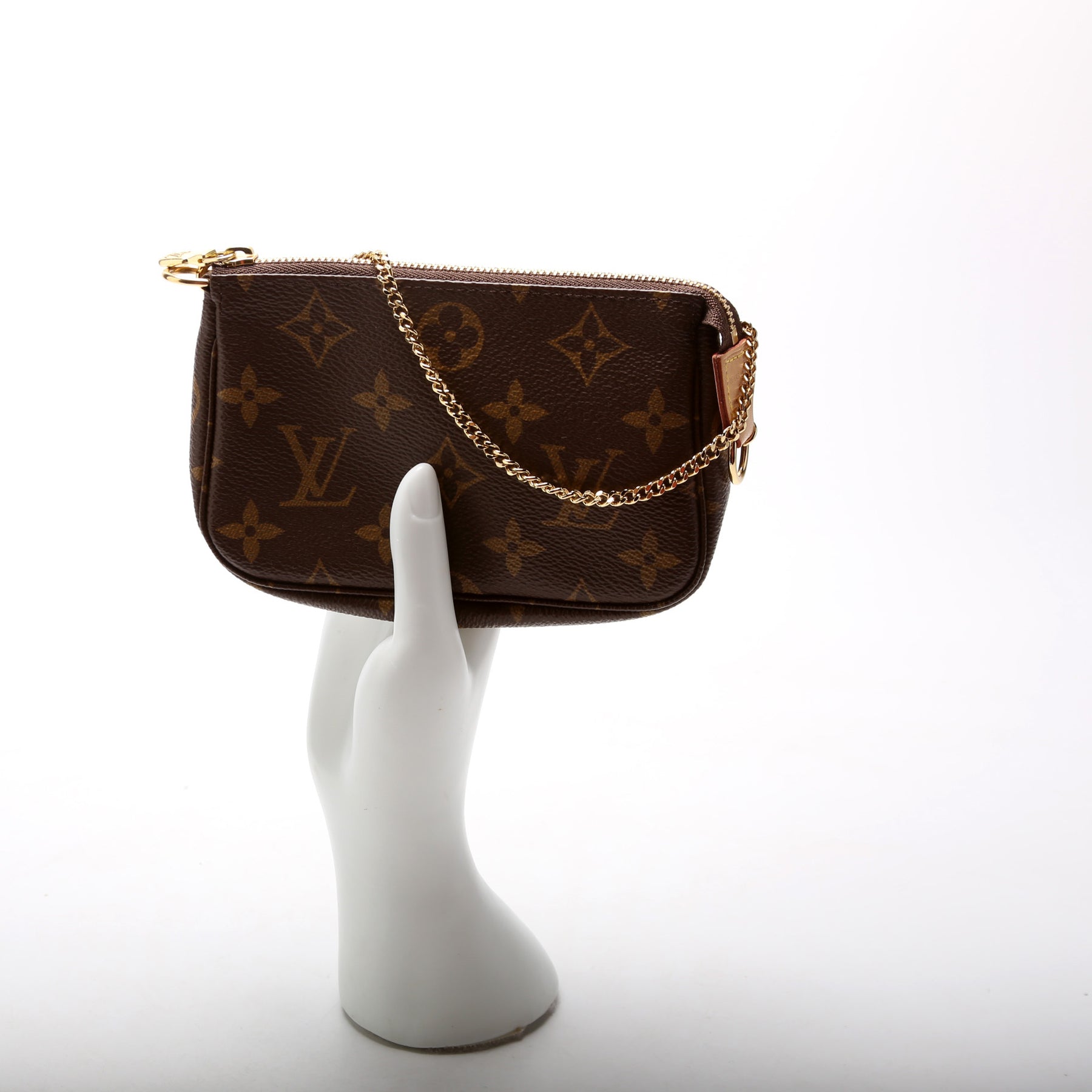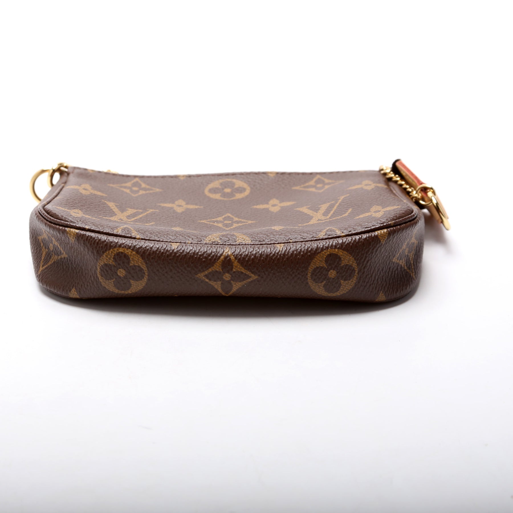 This pre-owned Louis Vuitton Pochette Accessories Mini is guaranteed 100% authentic. The exterior is in the classic Louis Vuitton Monogram coated canvas.
