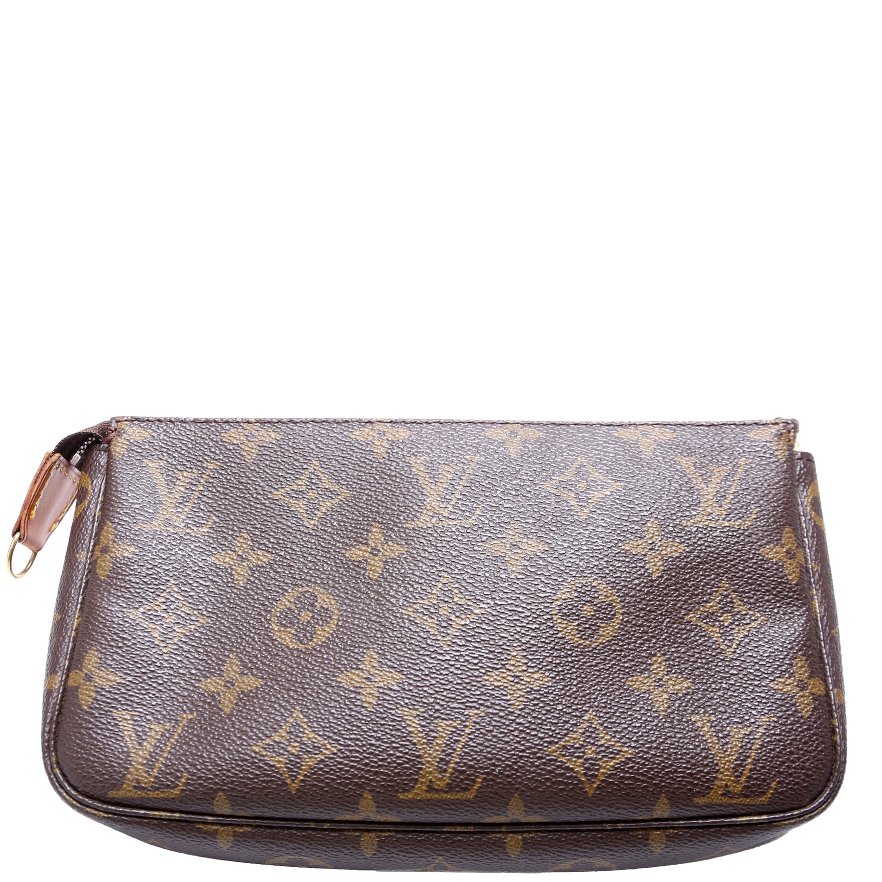 This pre-owned Louis Vuitton Pochette Accessories is guaranteed 100% authentic. The exterior is in the classic Louis Vuitton Monogram coated canvas.