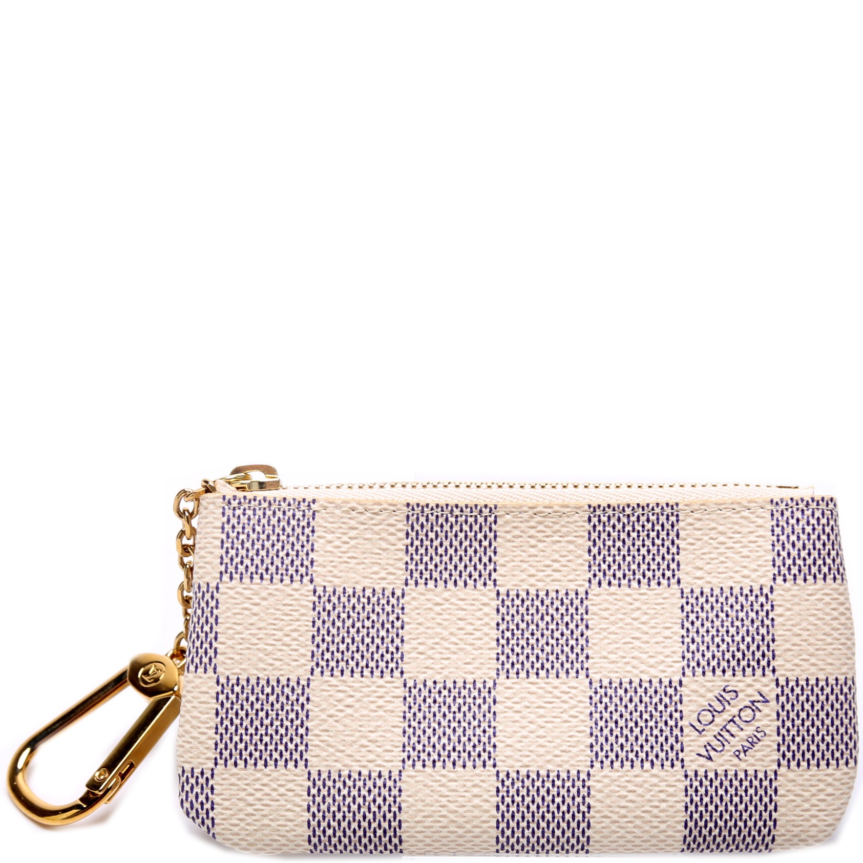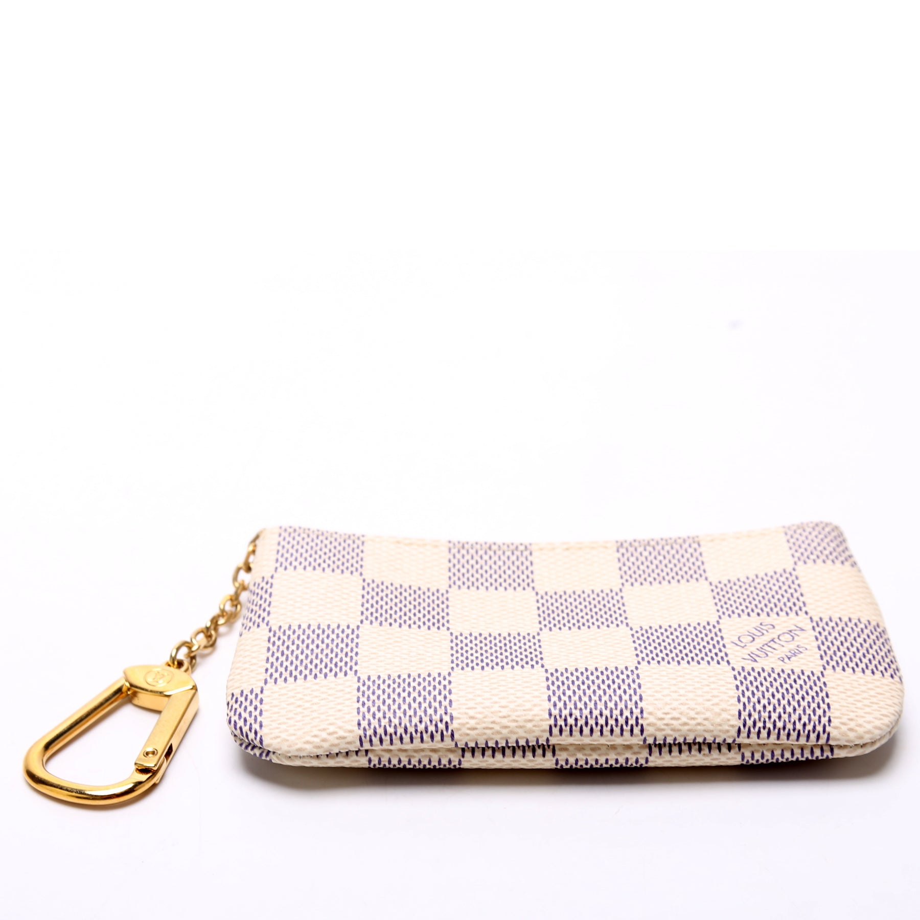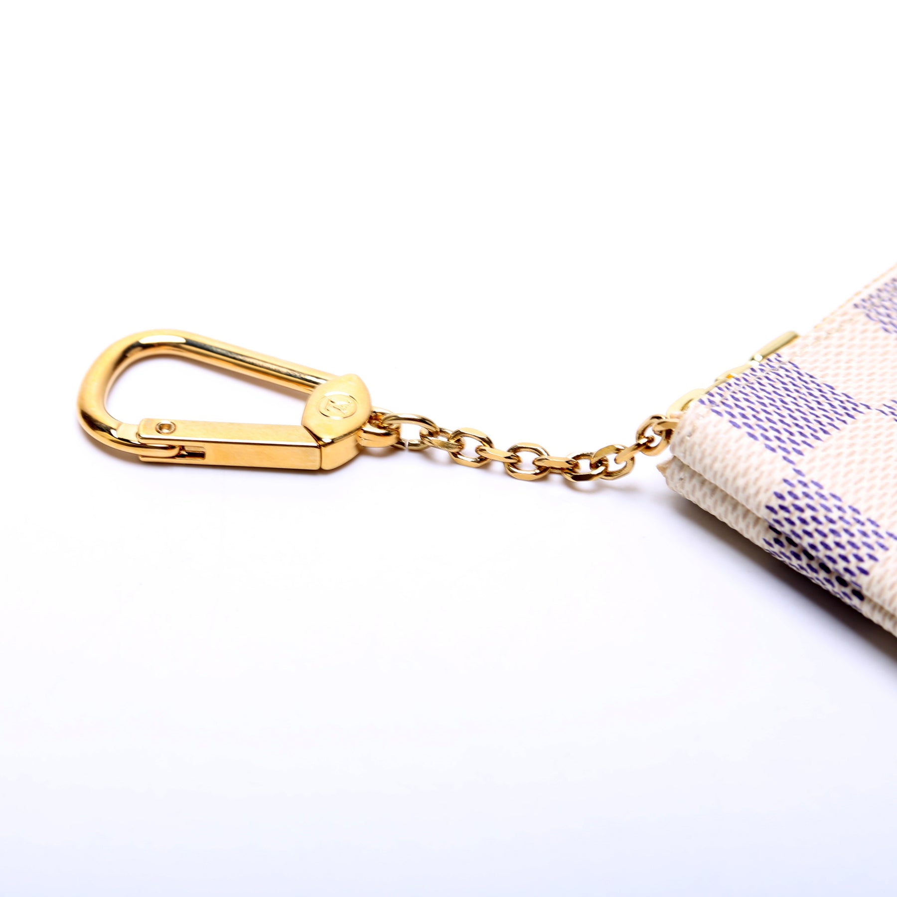 This pre-owned Louis Vuitton Pochette Cles is guaranteed 100% authentic. The exterior is in the classic Louis Vuitton Damier Azur coated canvas.