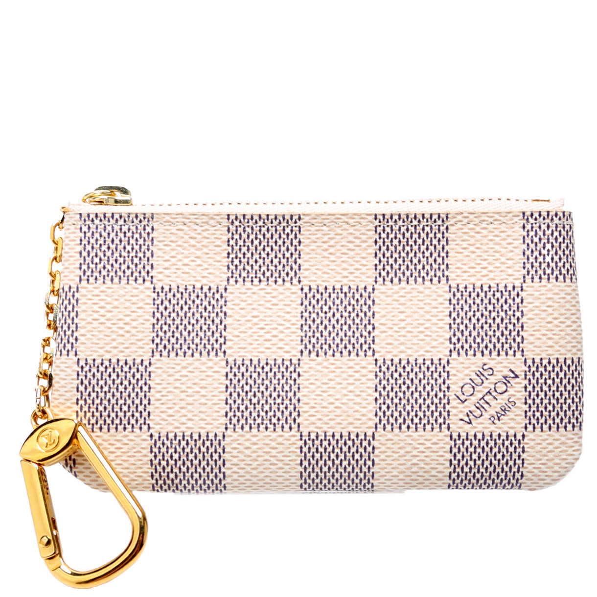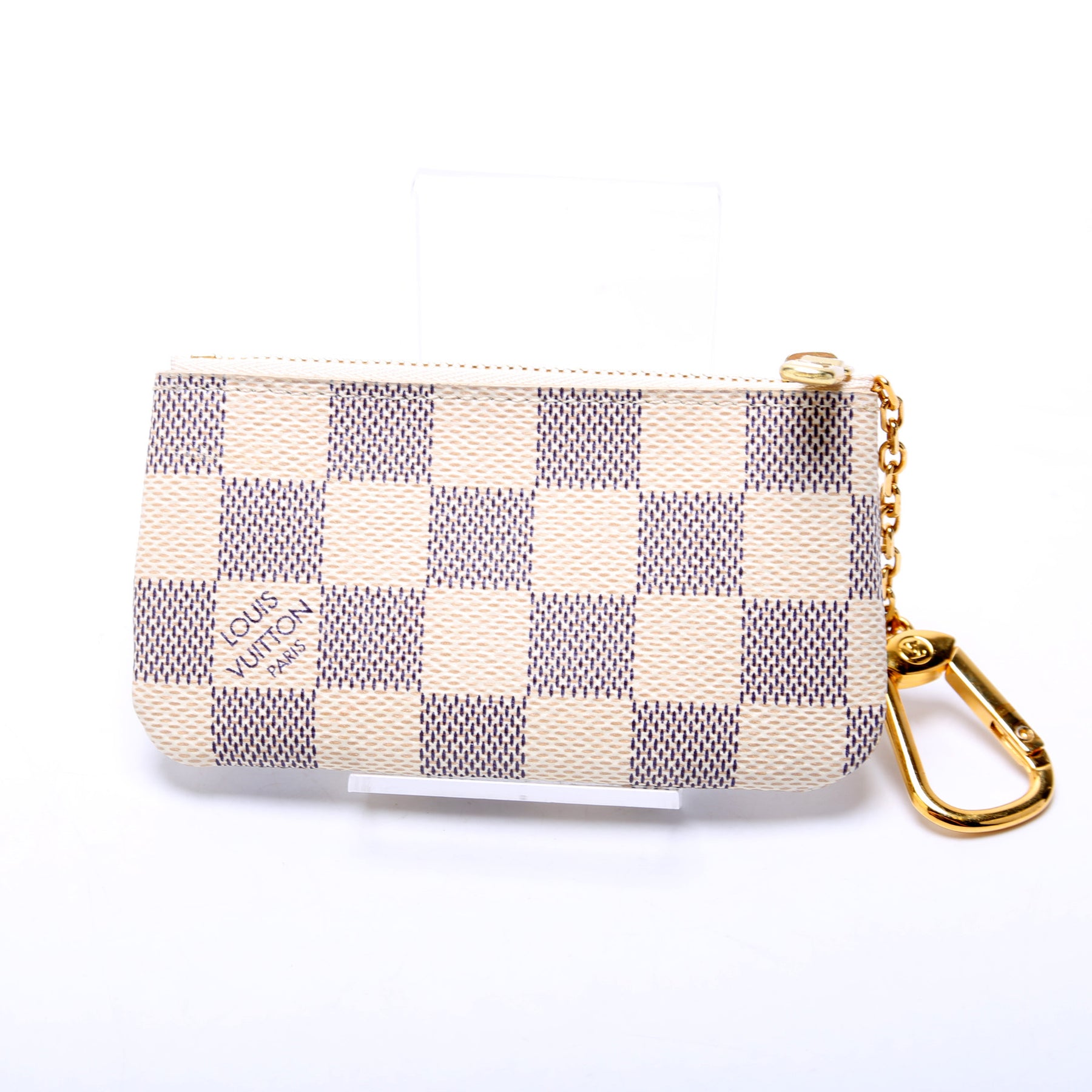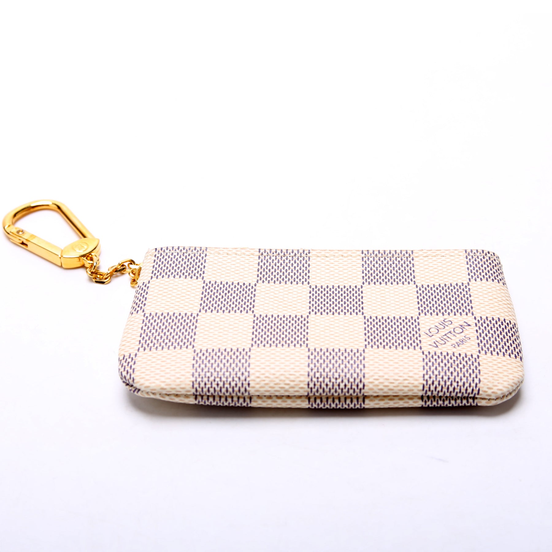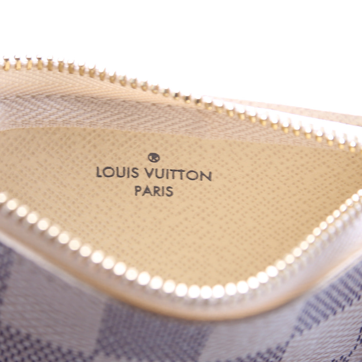 This pre-owned Louis Vuitton Pochette Cles is guaranteed 100% authentic. The exterior is in the classic Louis Vuitton Damier Azur coated canvas.