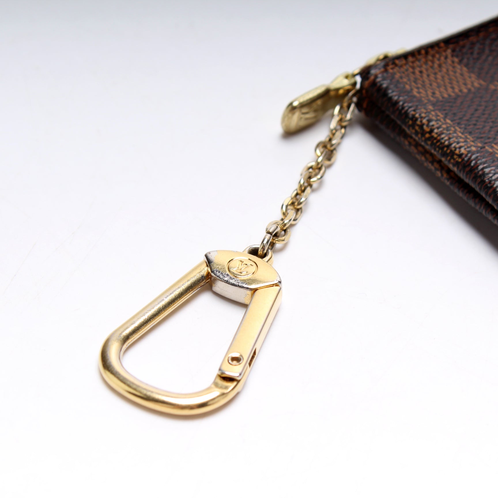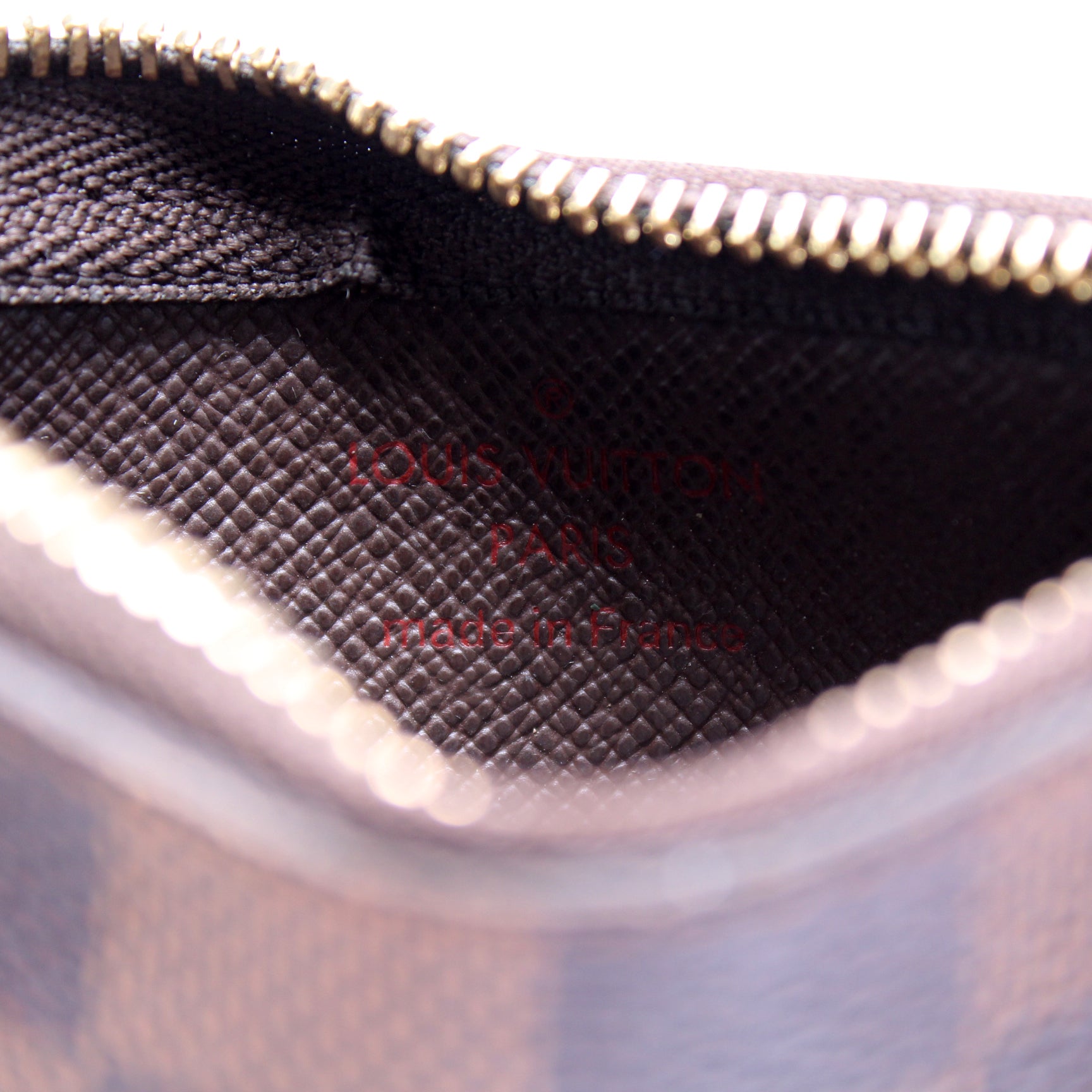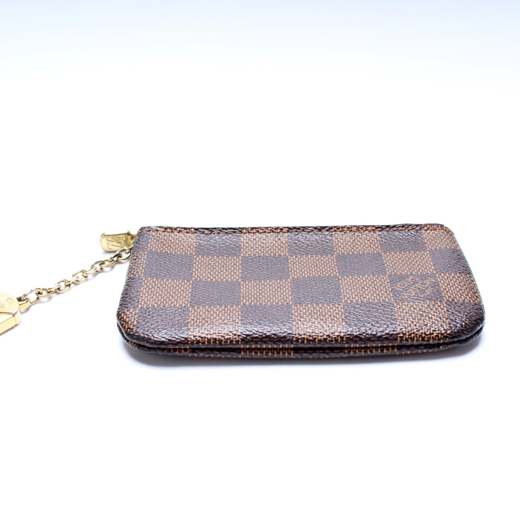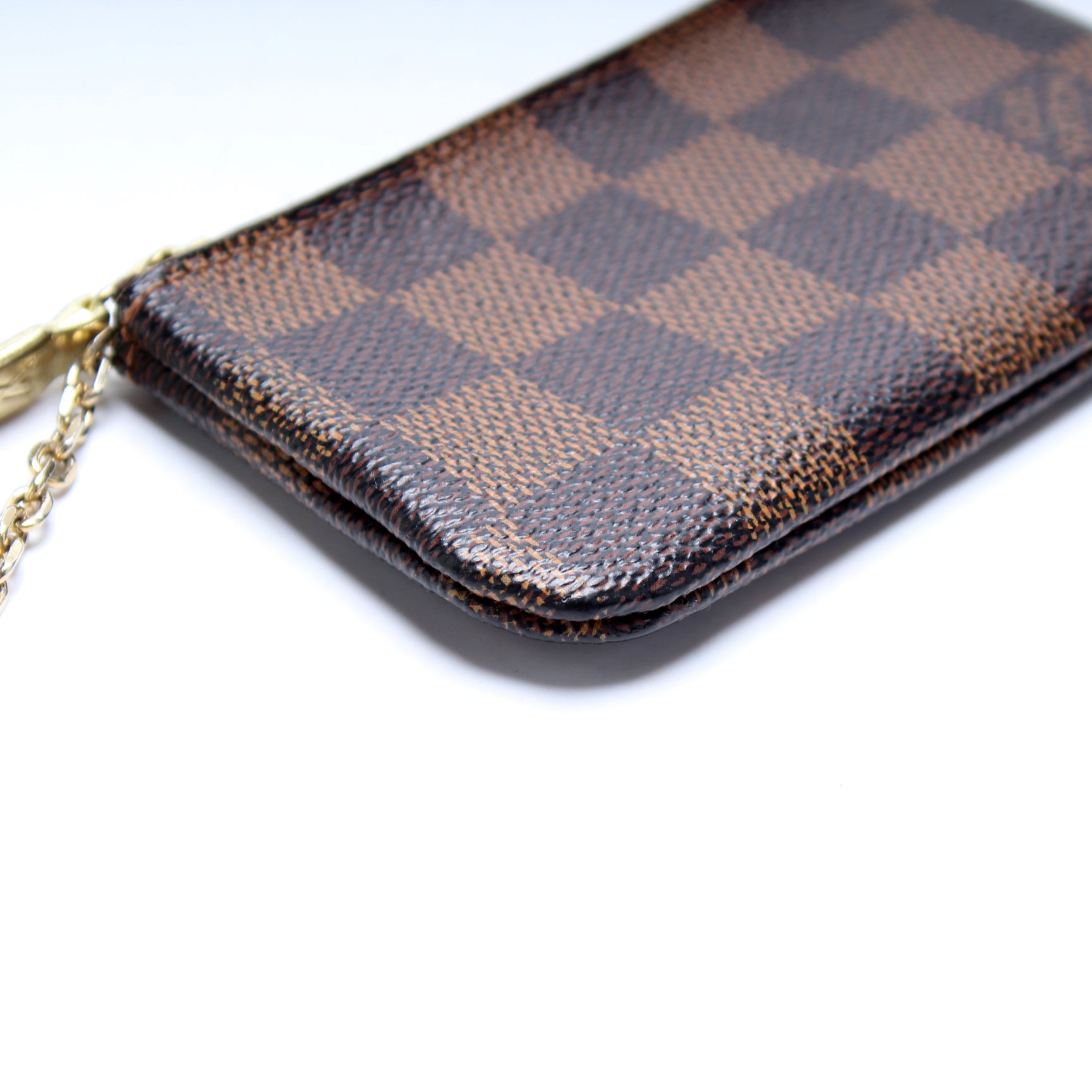 This pre-owned Louis Vuitton Pochette Cles is guaranteed 100% authentic. The exterior is in the classic Louis Vuitton Damier Ebene coated canvas.