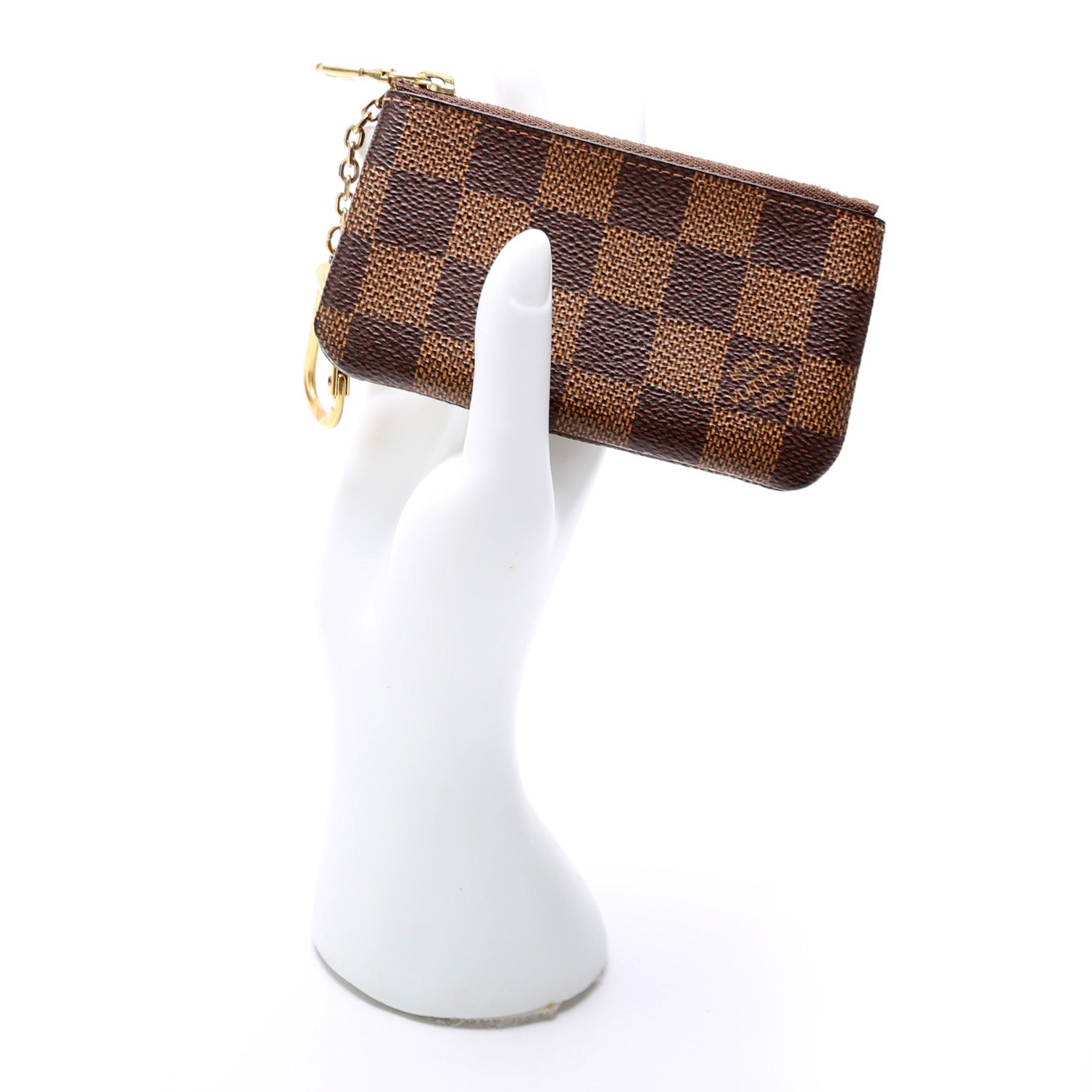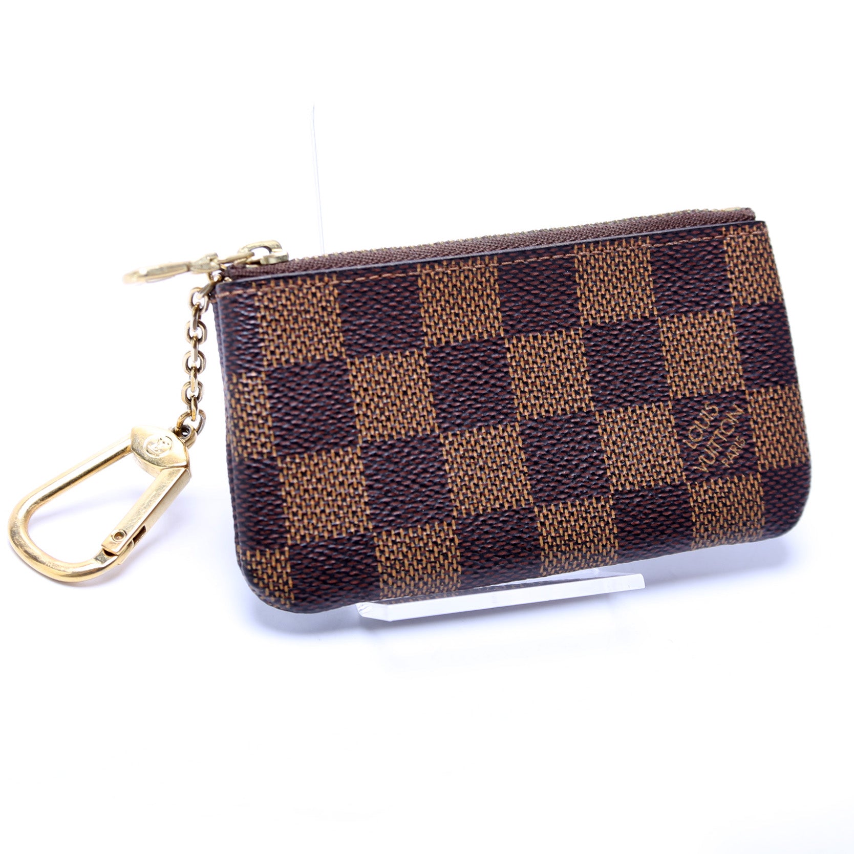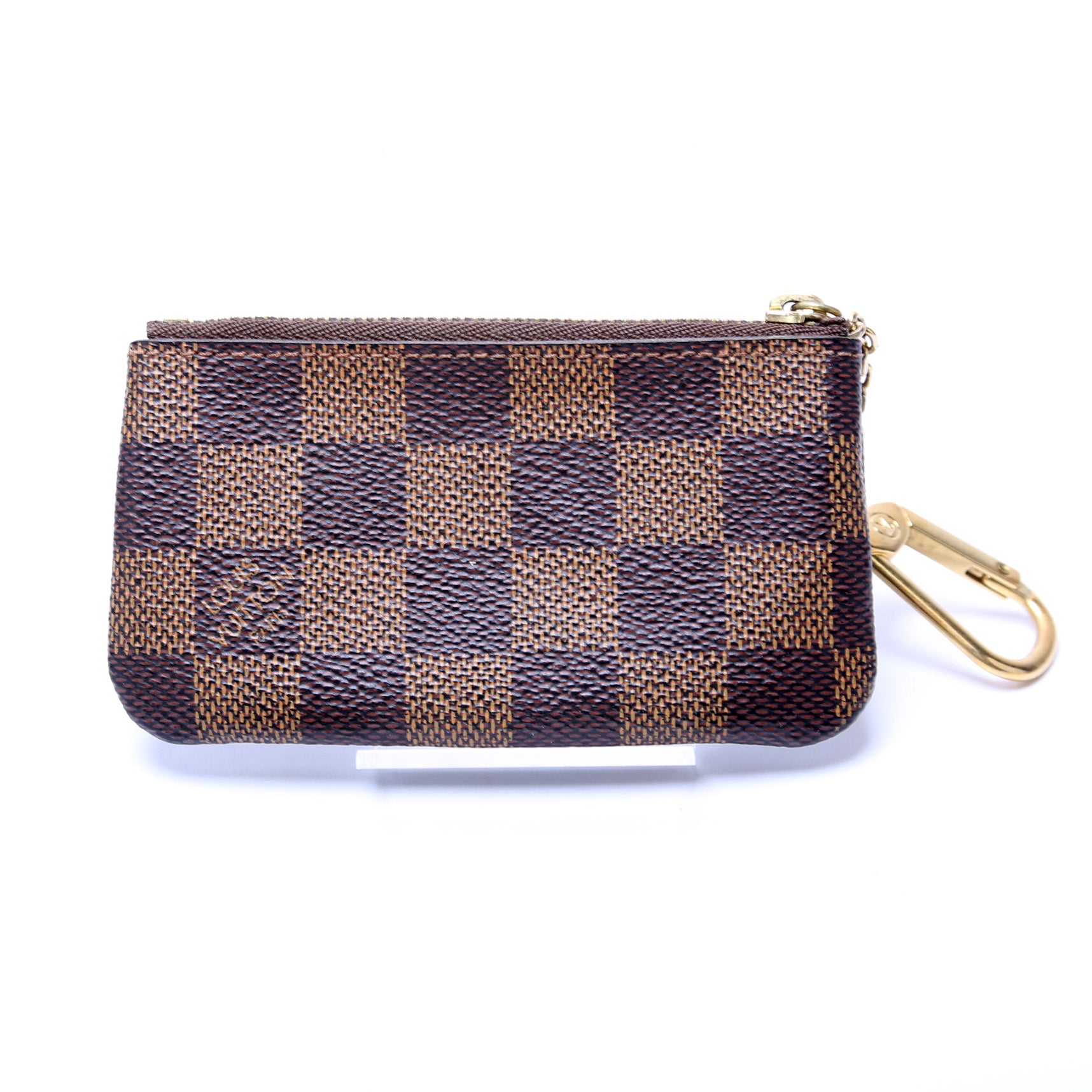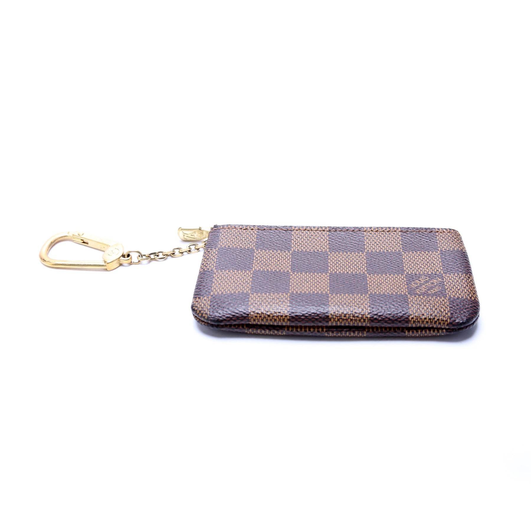 This pre-owned Louis Vuitton Pochette Cles is guaranteed 100% authentic. The exterior is in the classic Louis Vuitton Damier Ebene coated canvas.