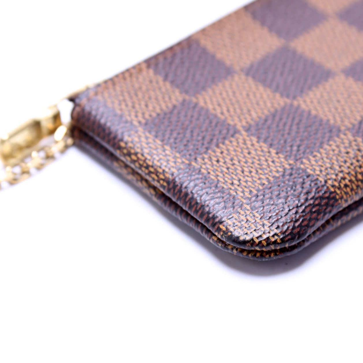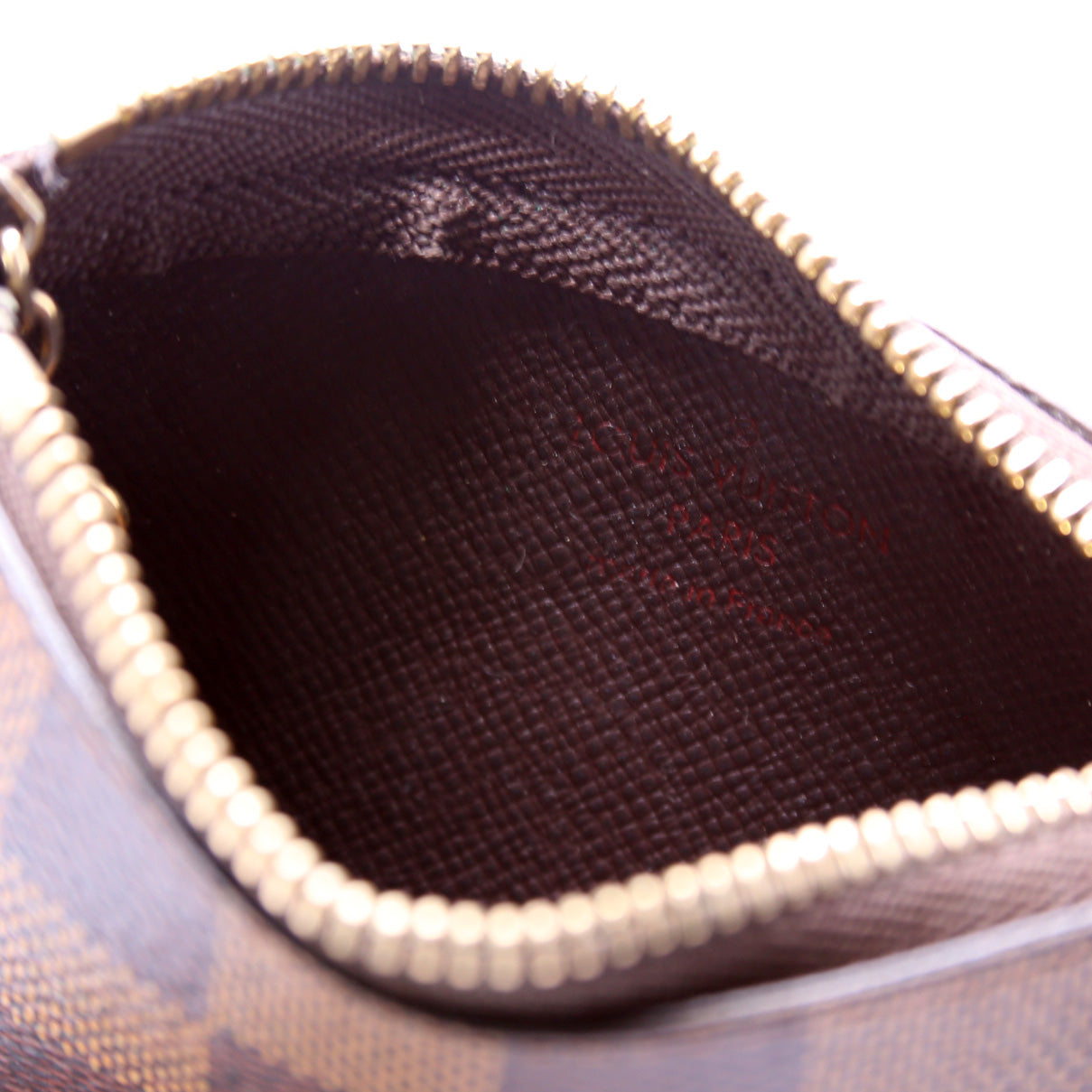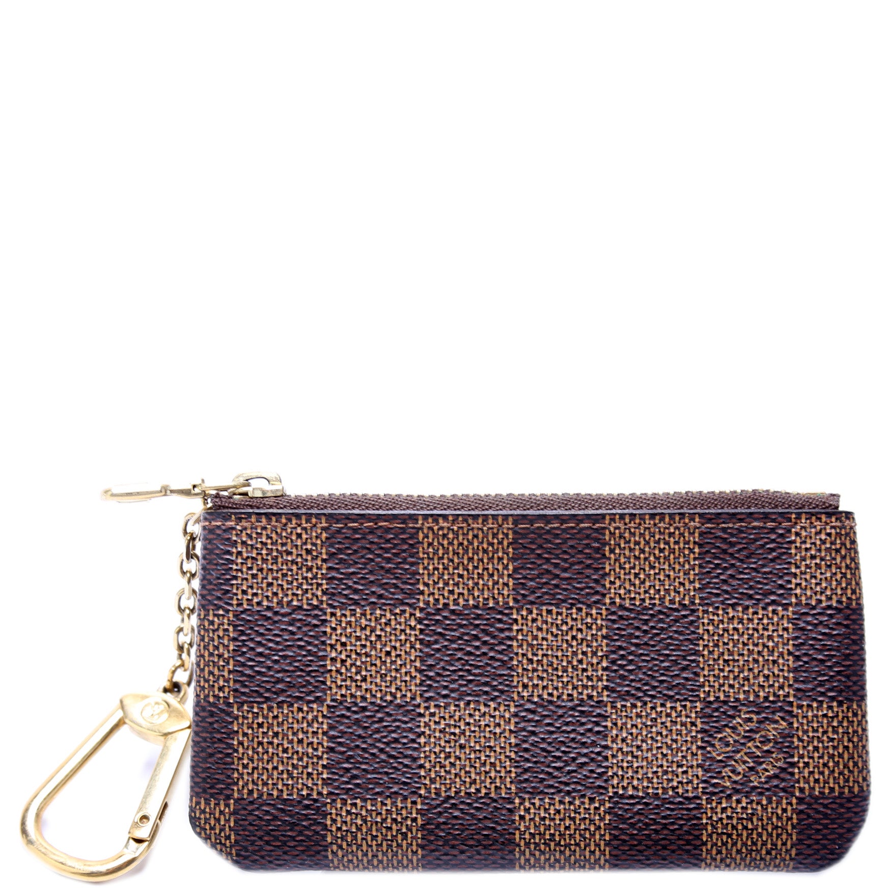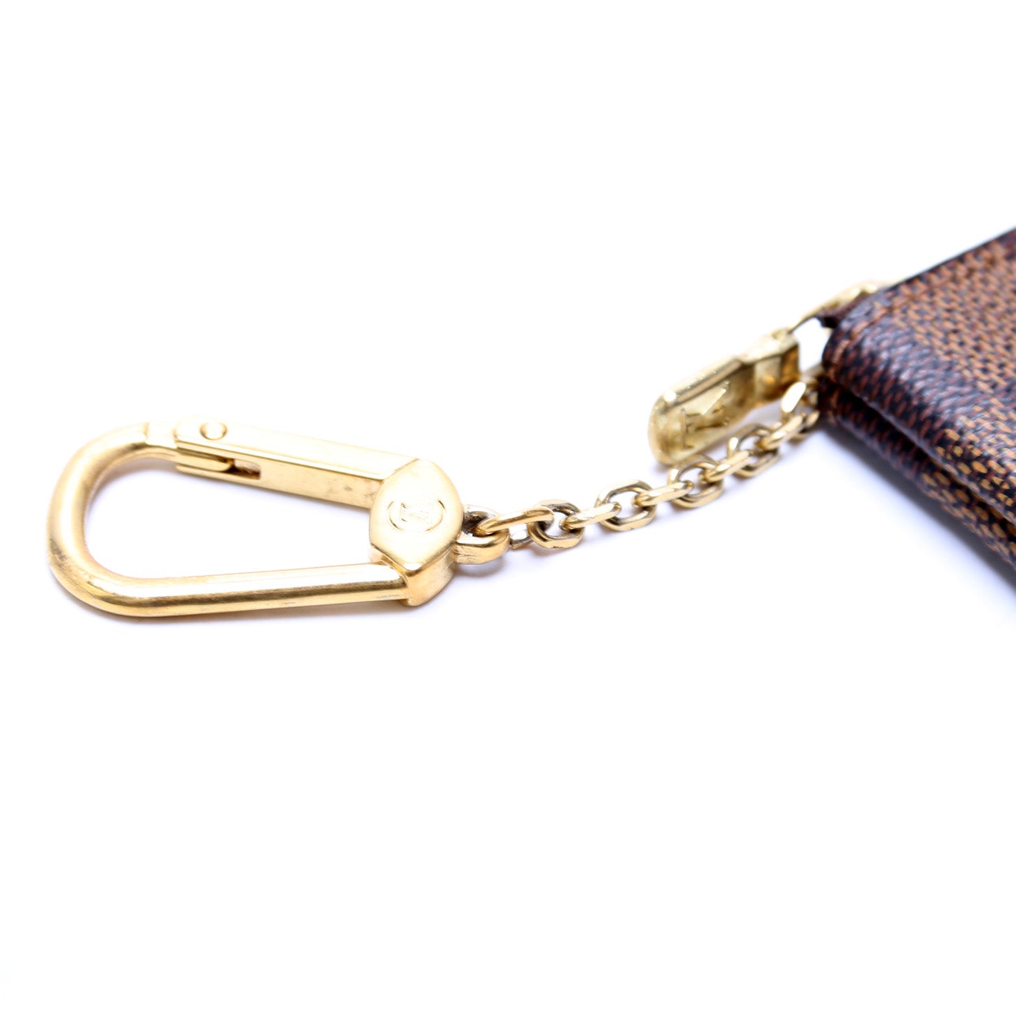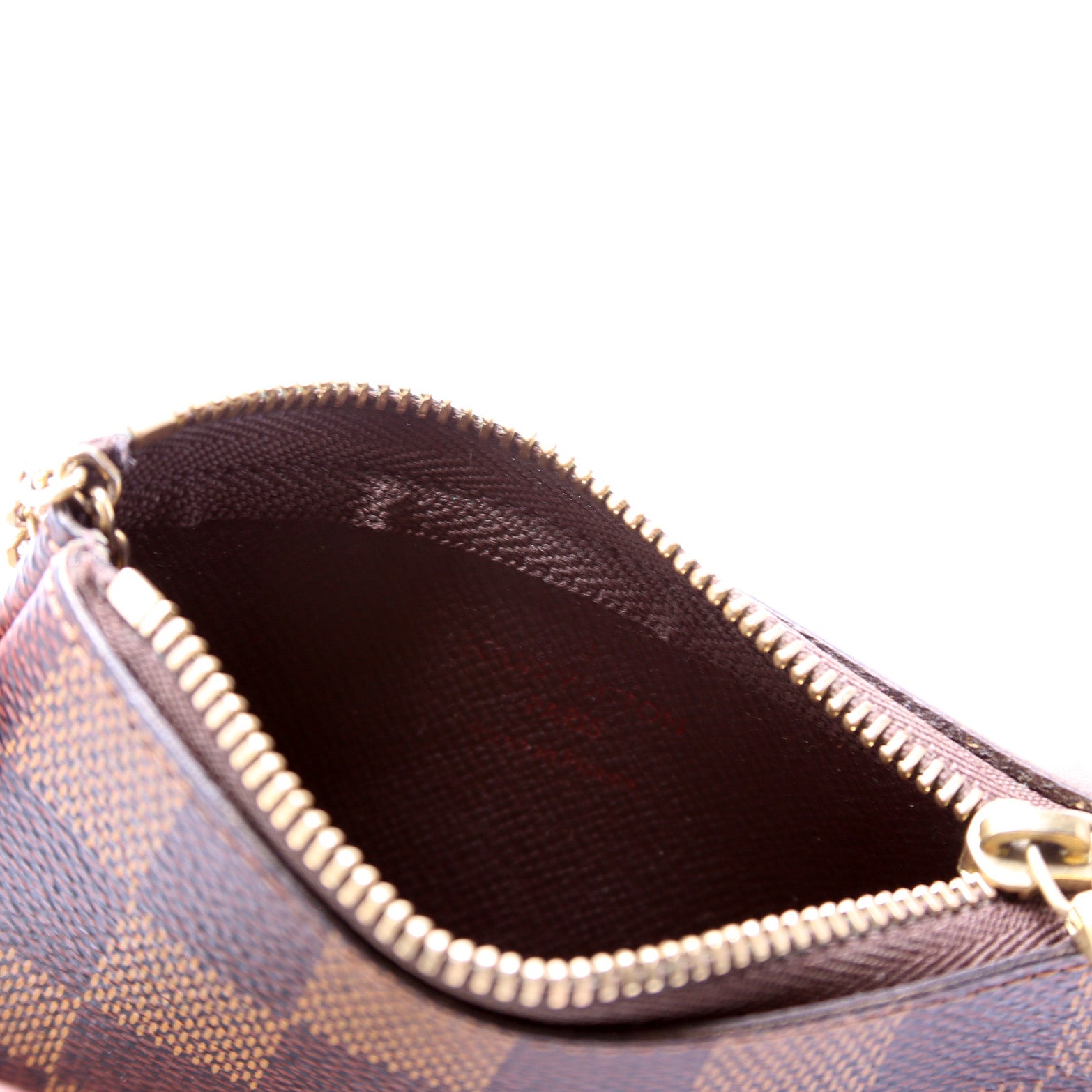 This pre-owned Louis Vuitton Pochette Cles is guaranteed 100% authentic. The exterior is in the classic Louis Vuitton Damier Ebene coated canvas.