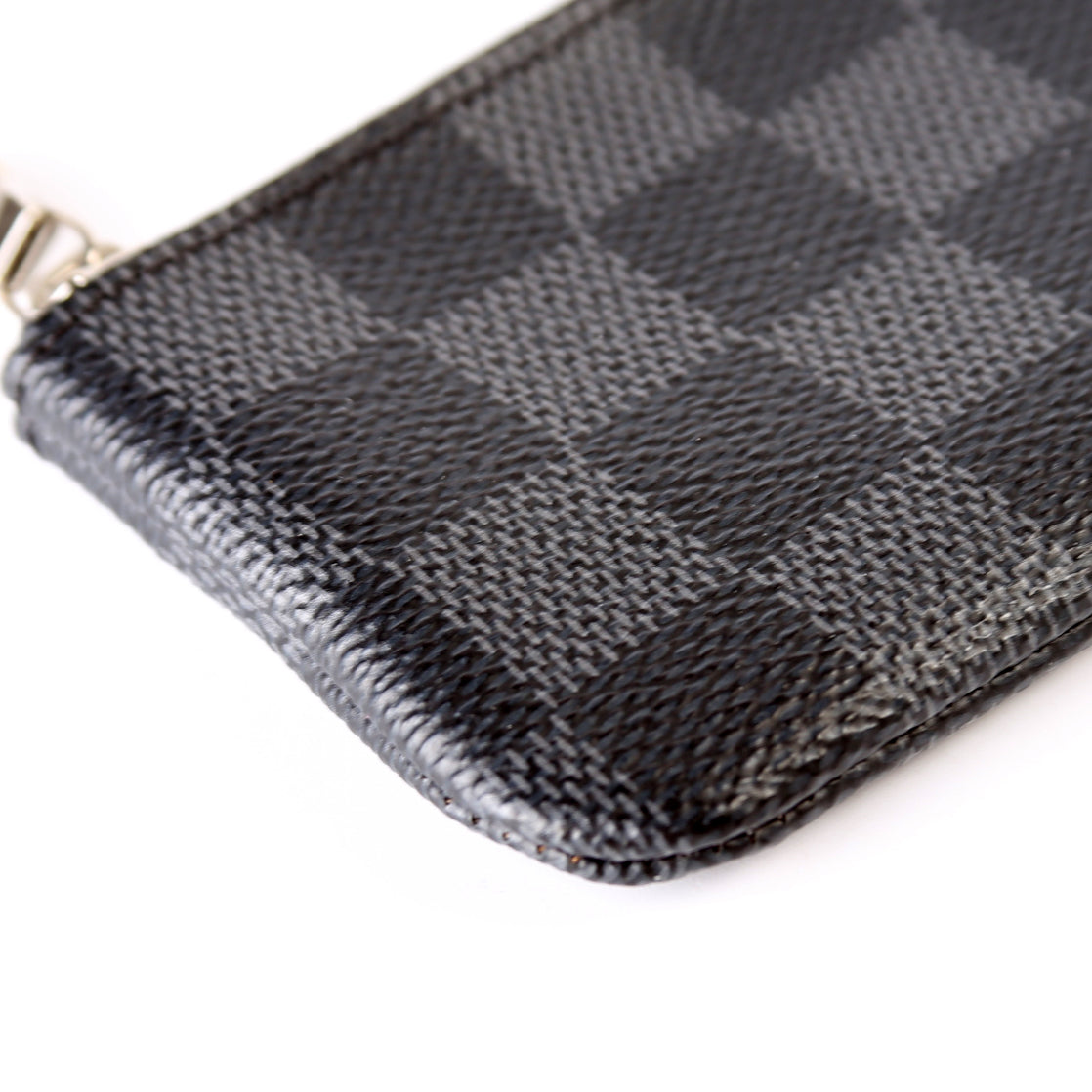 This pre-owned Louis Vuitton Pochette Cles is guaranteed 100% authentic. The exterior is in the classic Louis Vuitton Damier Graphite coated canvas.