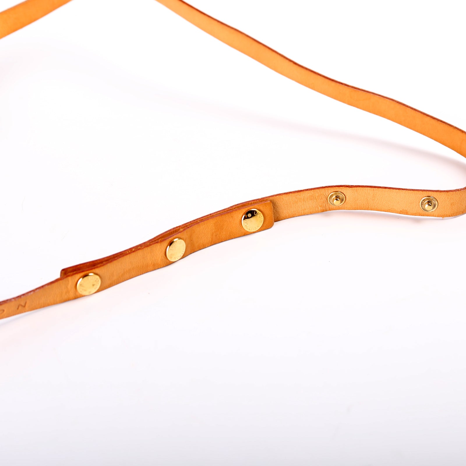 Strap: The leather waist strap shows minor wear and discoloration throughout.