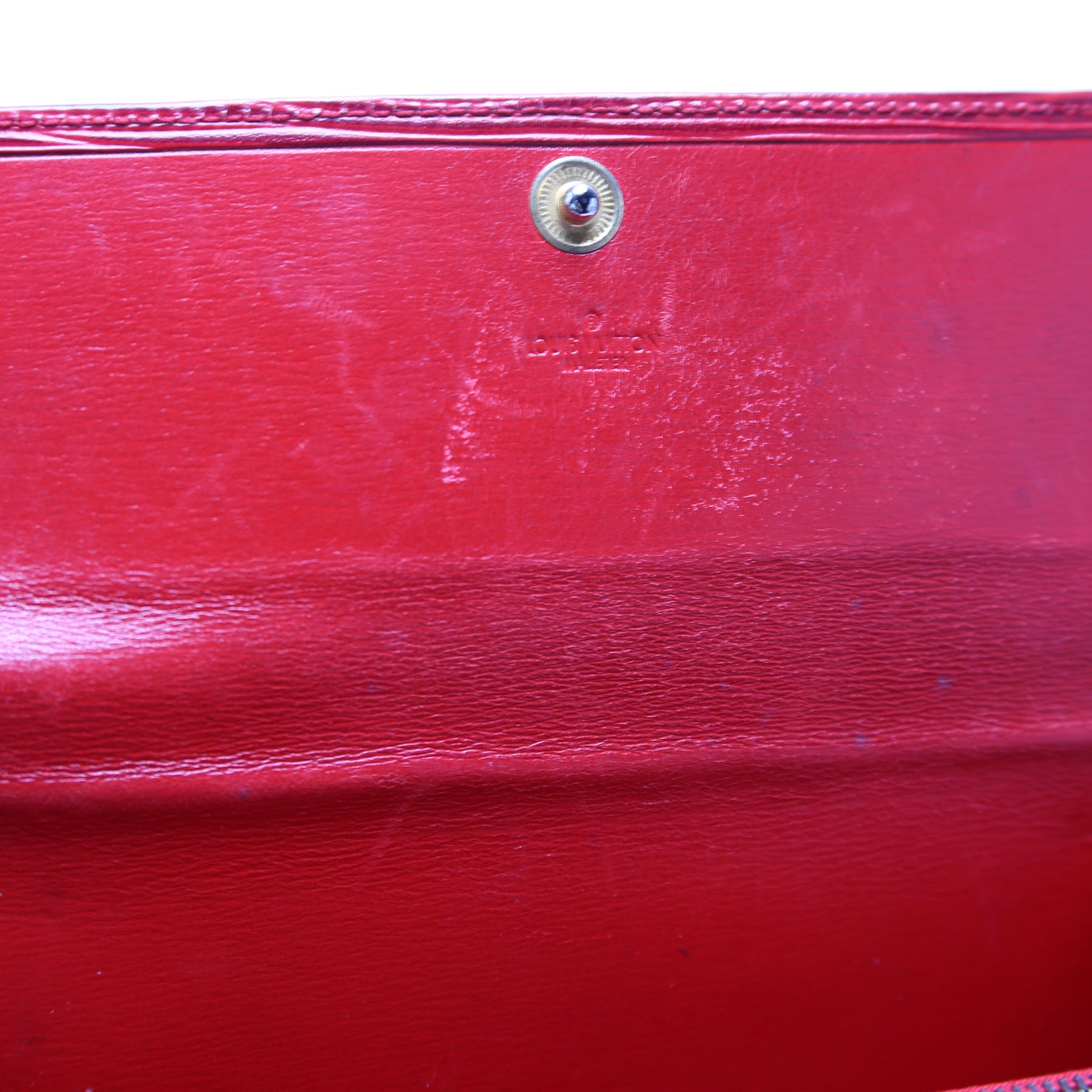 Interior: The interior shows heavy scuffs and discoloration throughout. The interior features one zipper pocket and two open sections.