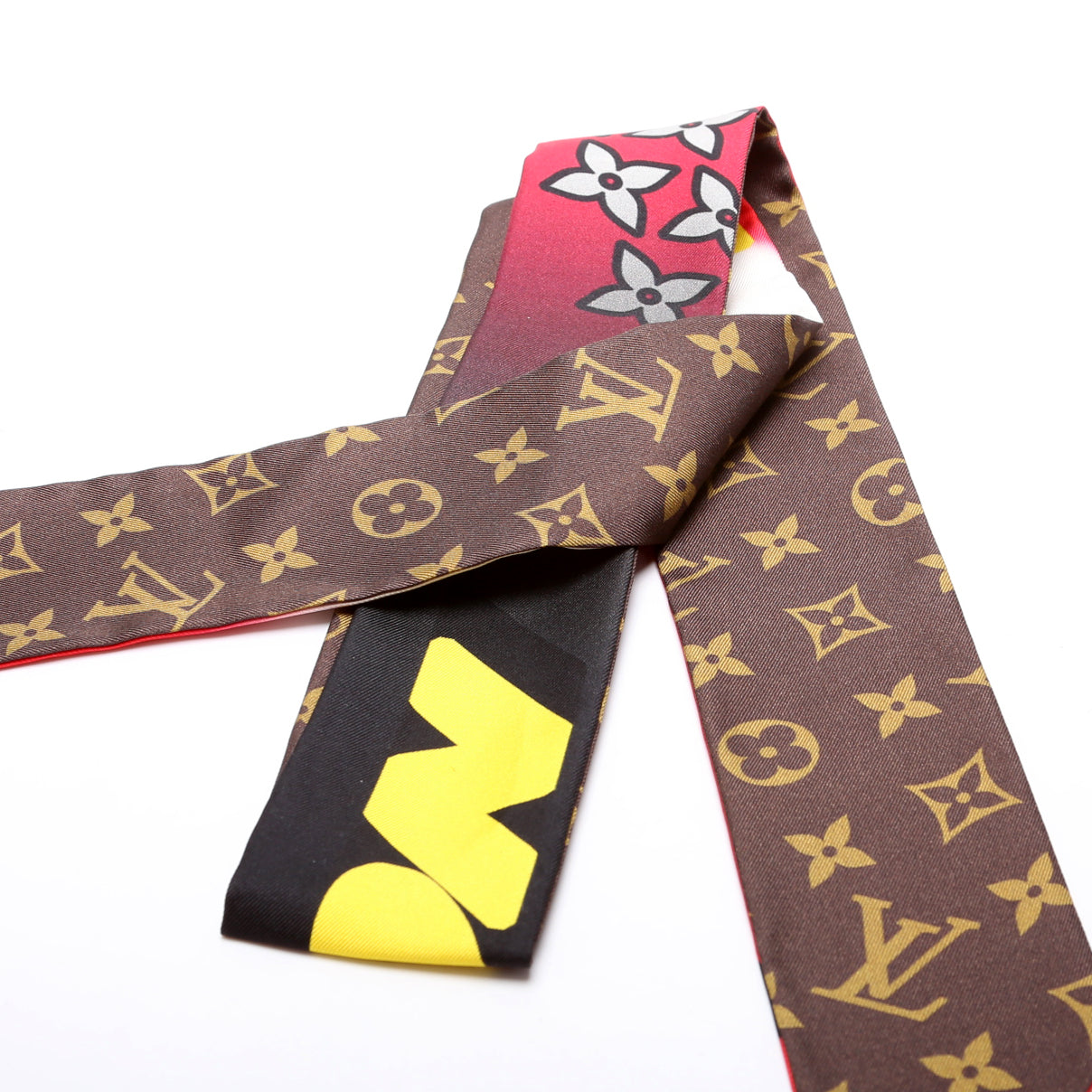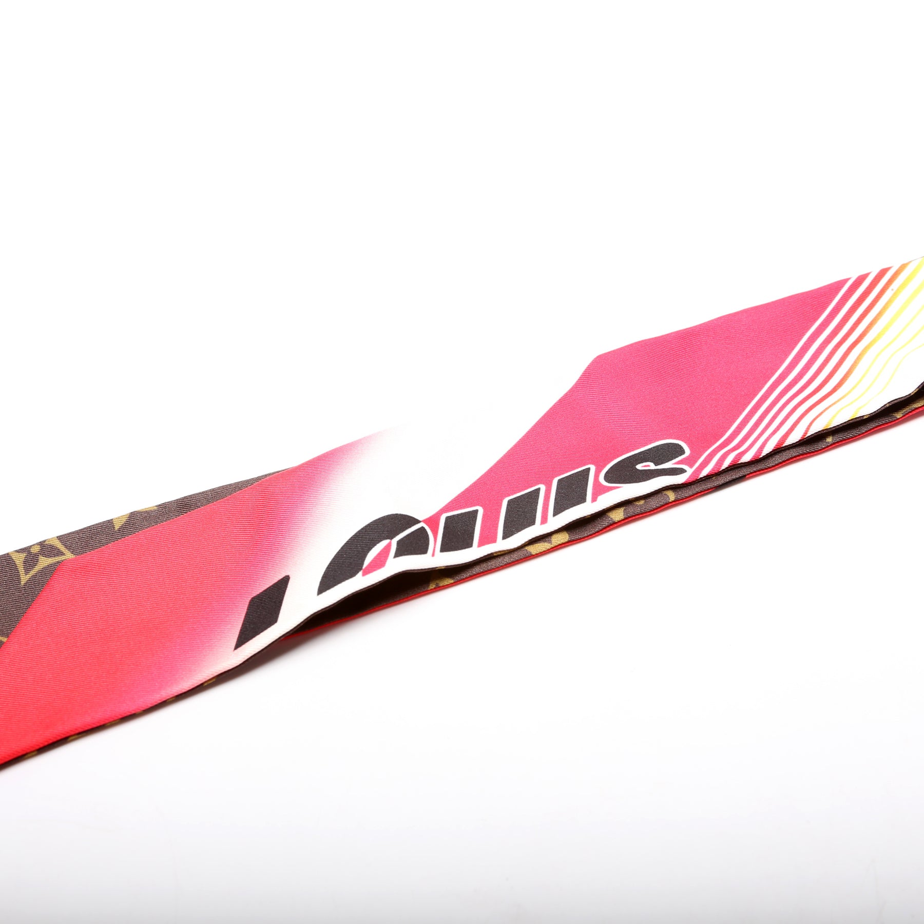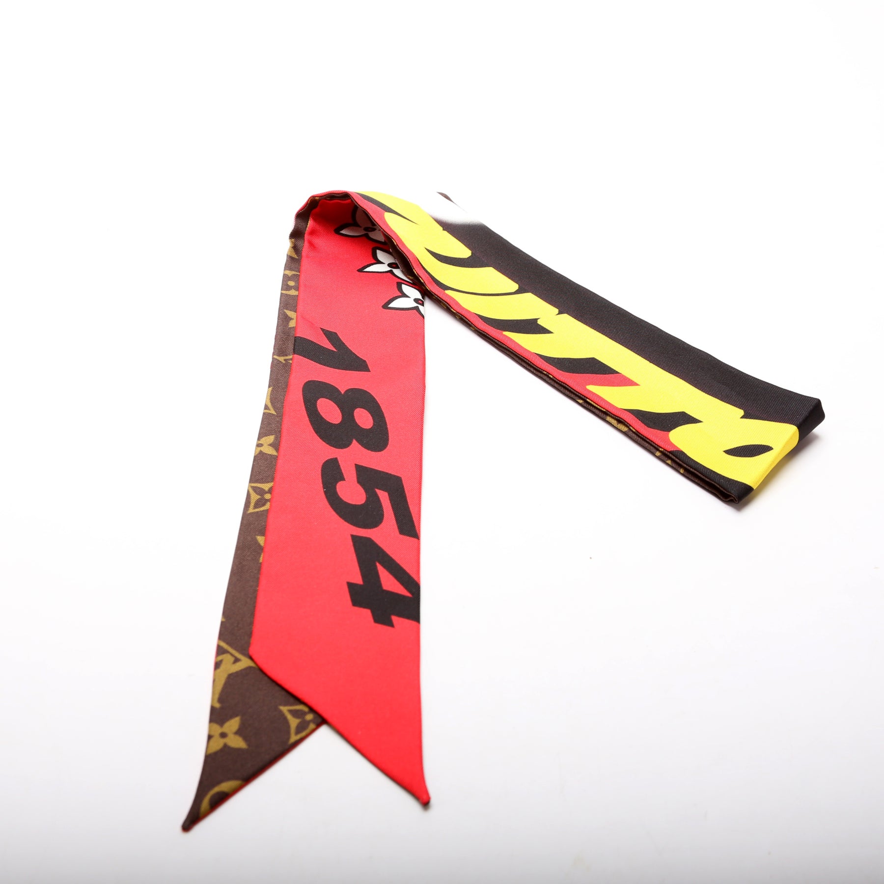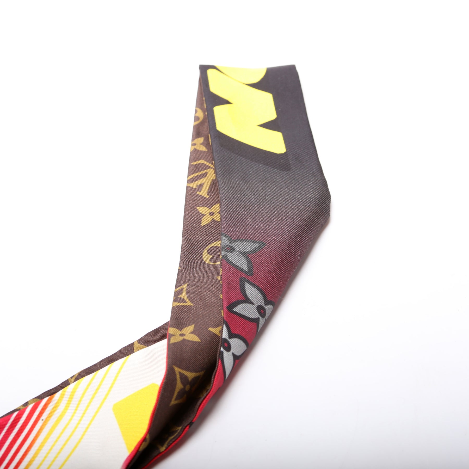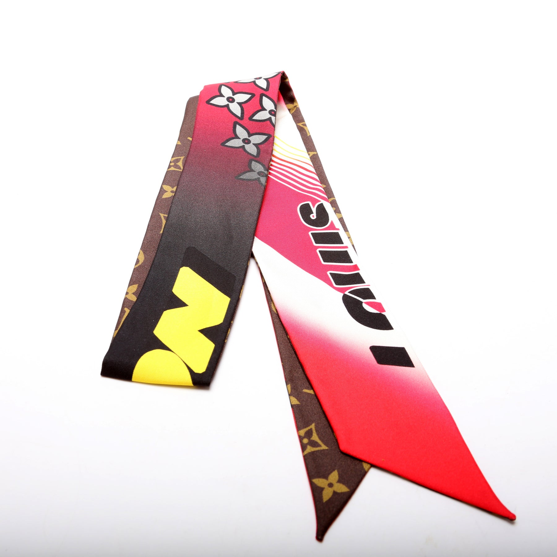This pre-owned Louis Vuitton Race Bandeau Silk Scarf is guaranteed 100% authentic.