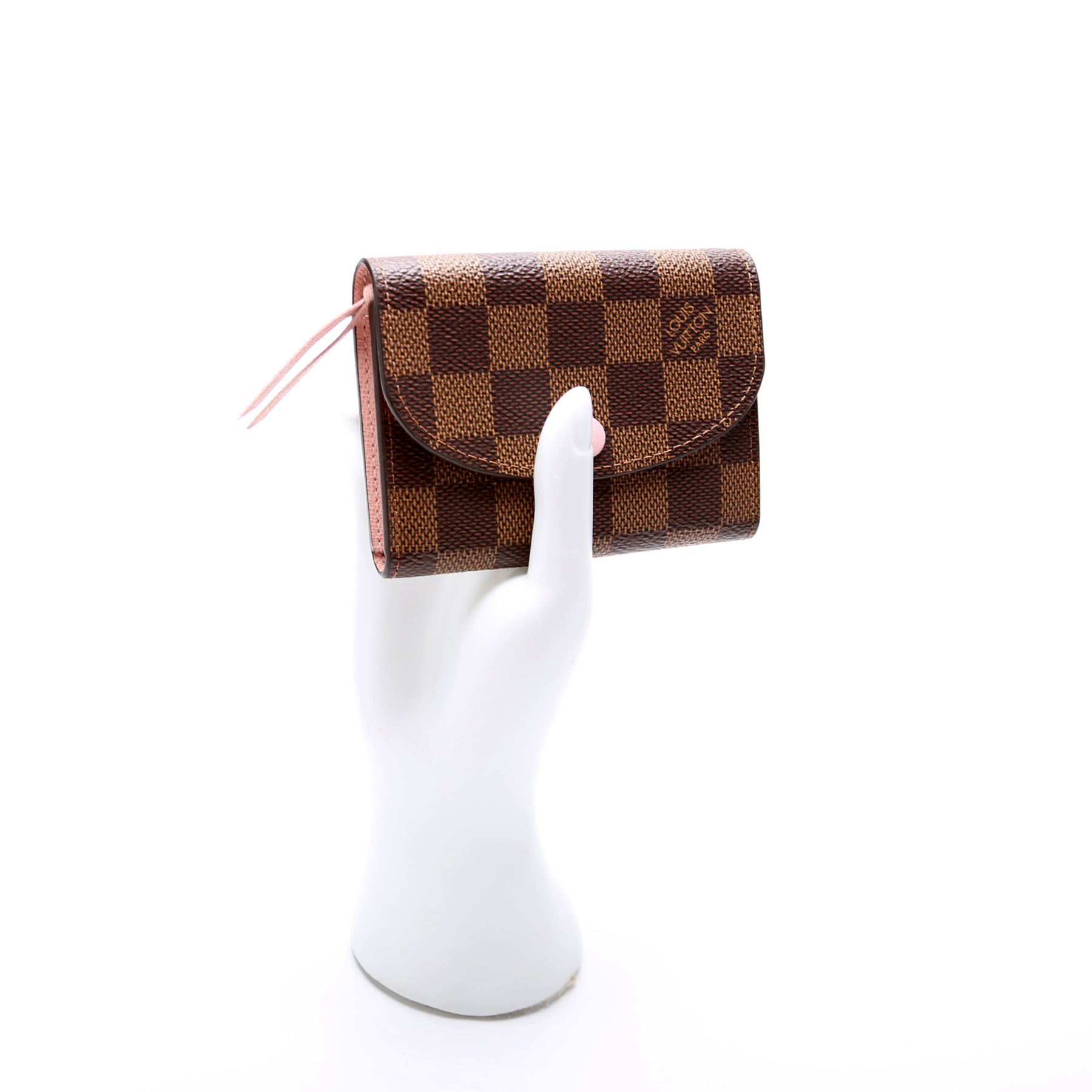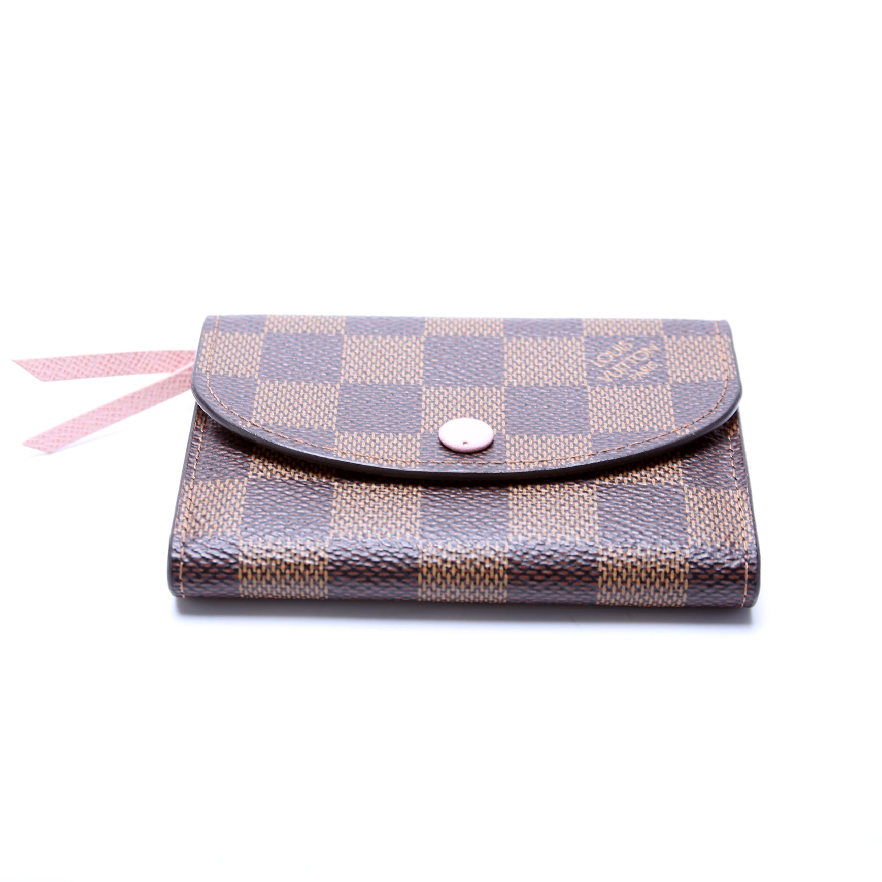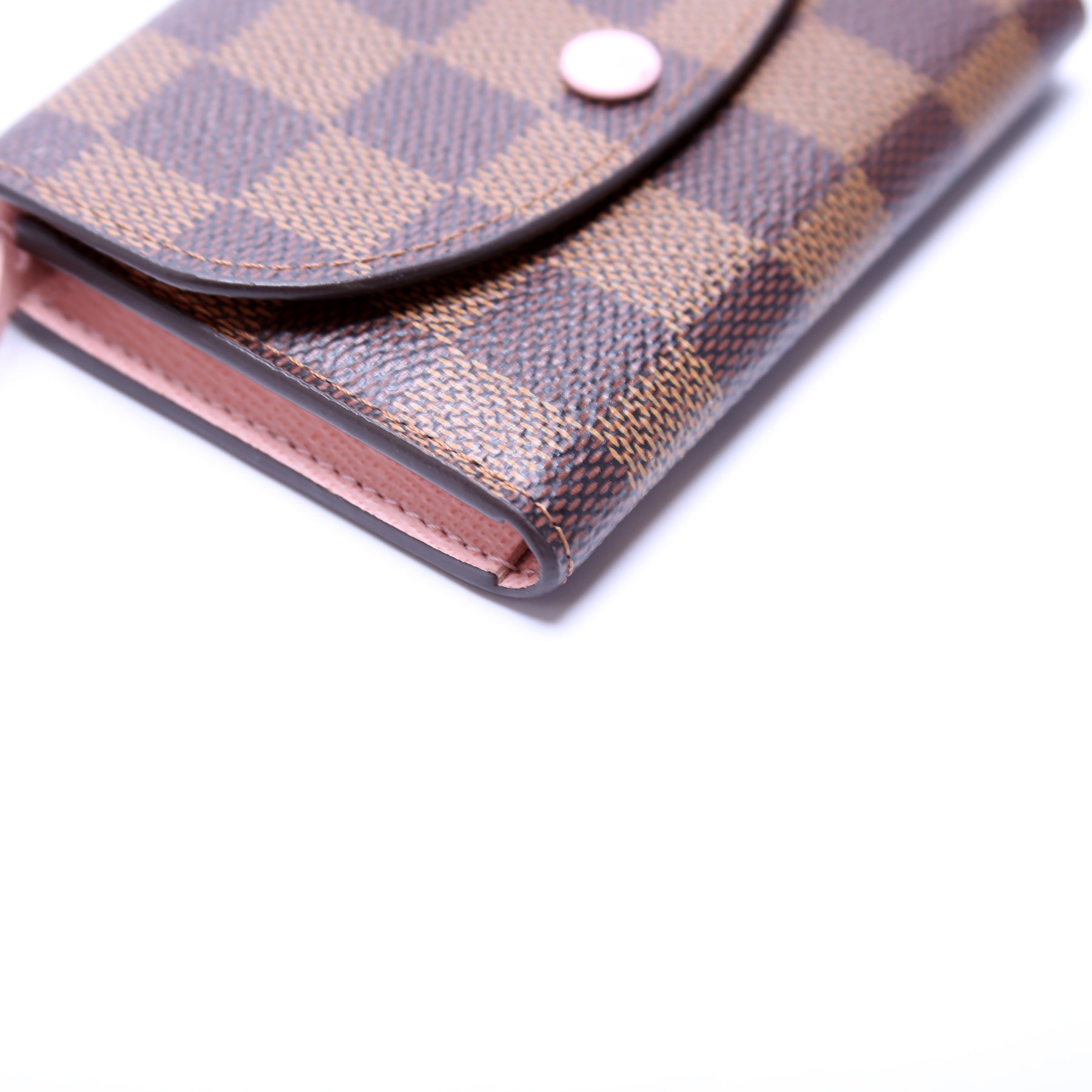 This pre-owned Louis Vuitton Rosalie Coin Purse is guaranteed 100% authentic. The exterior is in the classic Louis Vuitton Damier Ebene coated canvas.