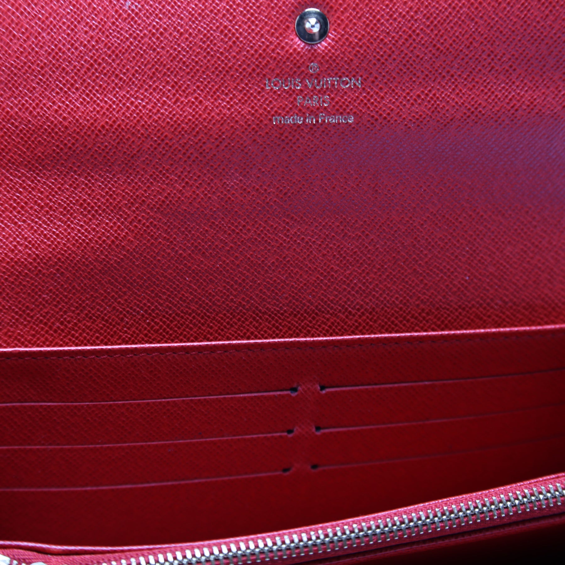 Interior: The interior shows minor wear throughout. The interior features ten card slots, one zip closure coin pouch, and three bill slots.