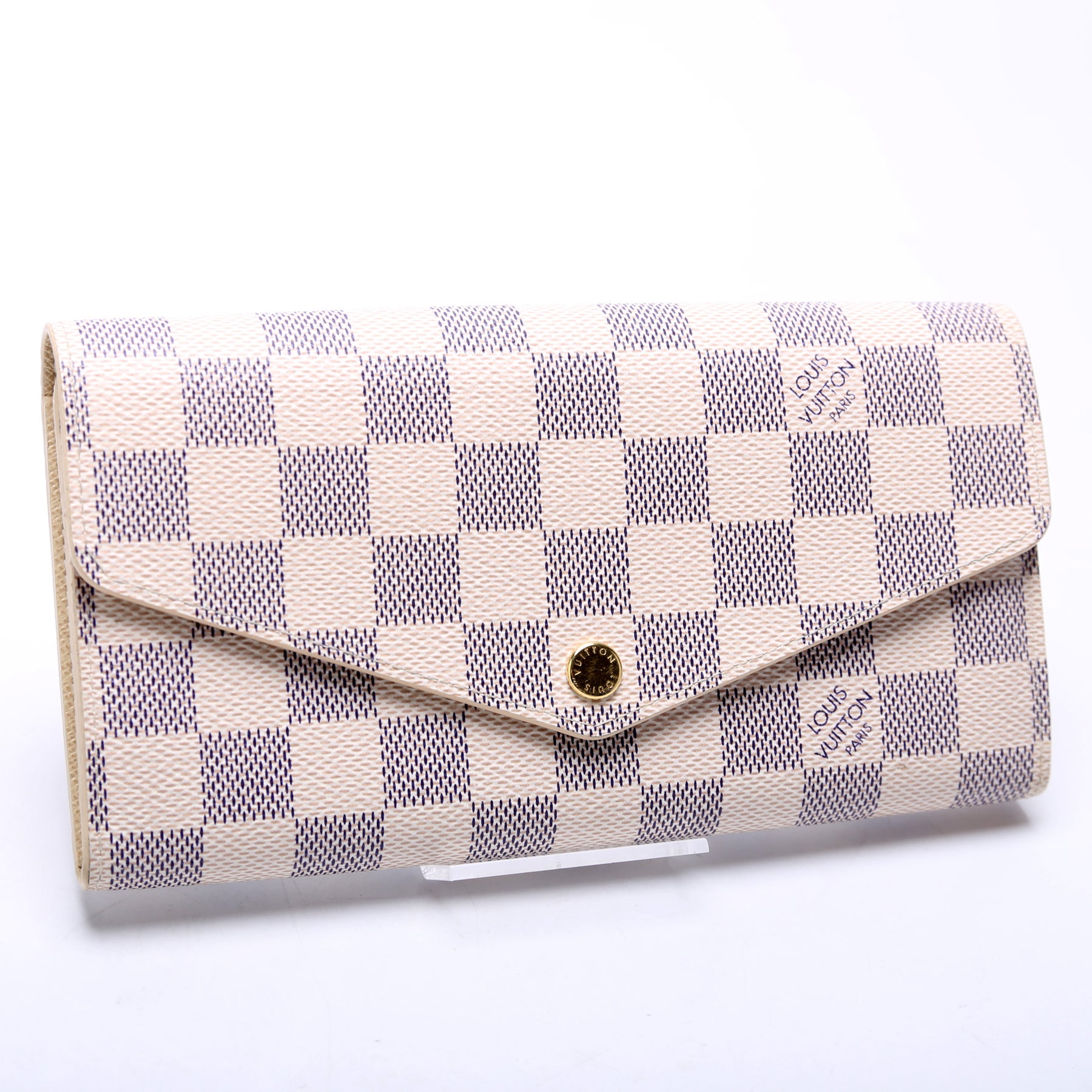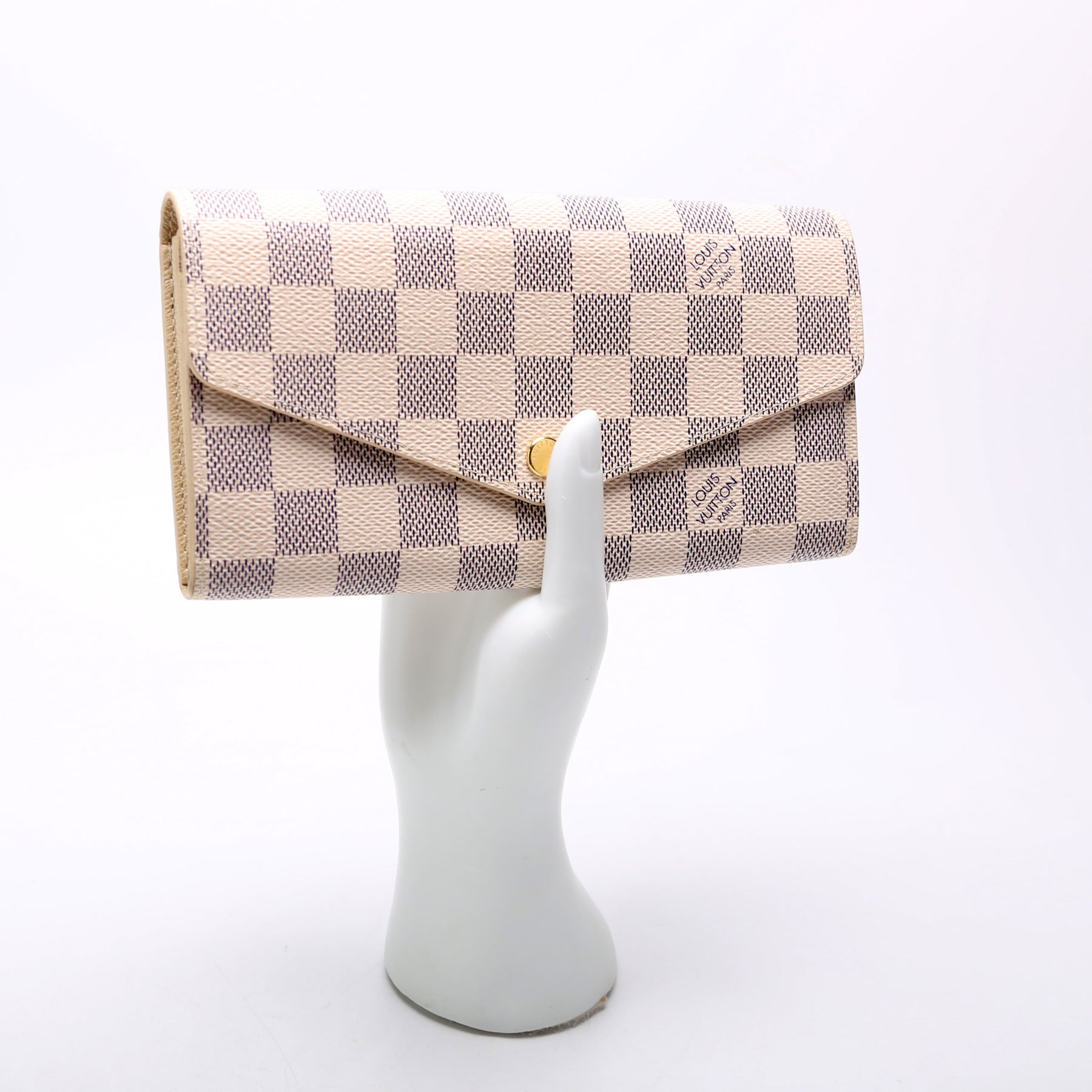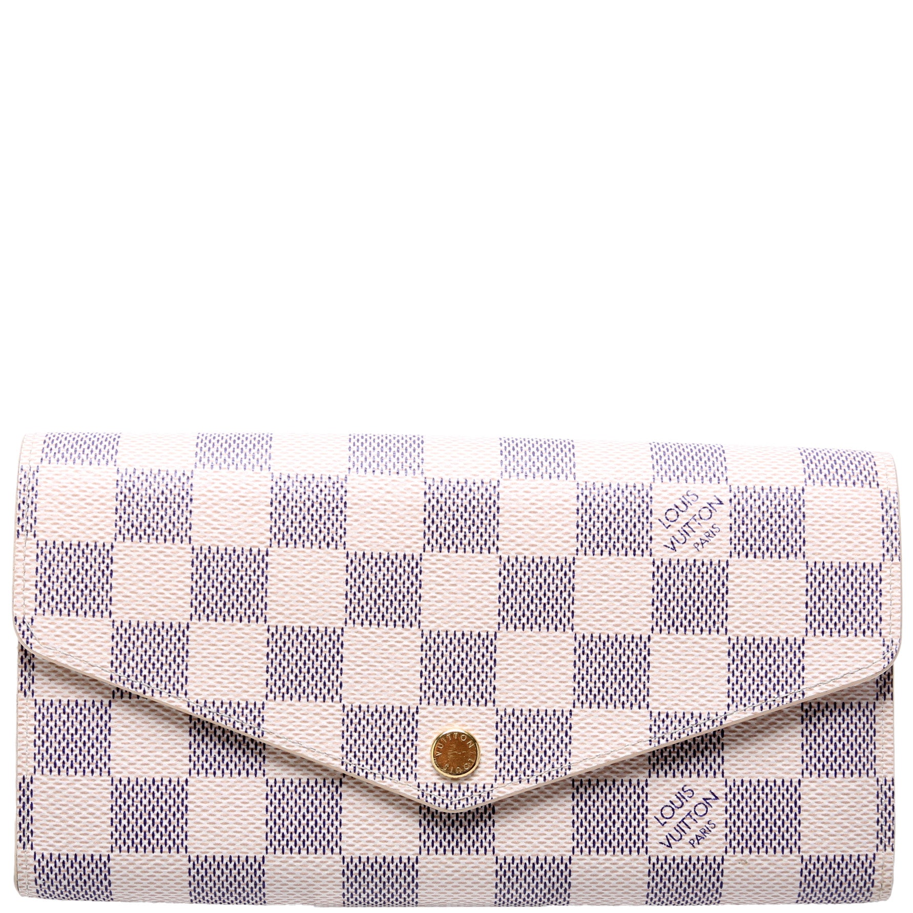 This pre-owned Louis Vuitton Sarah Wallet Newer is guaranteed 100% authentic. The exterior is in the classic Louis Vuitton Damier Azur coated canvas.