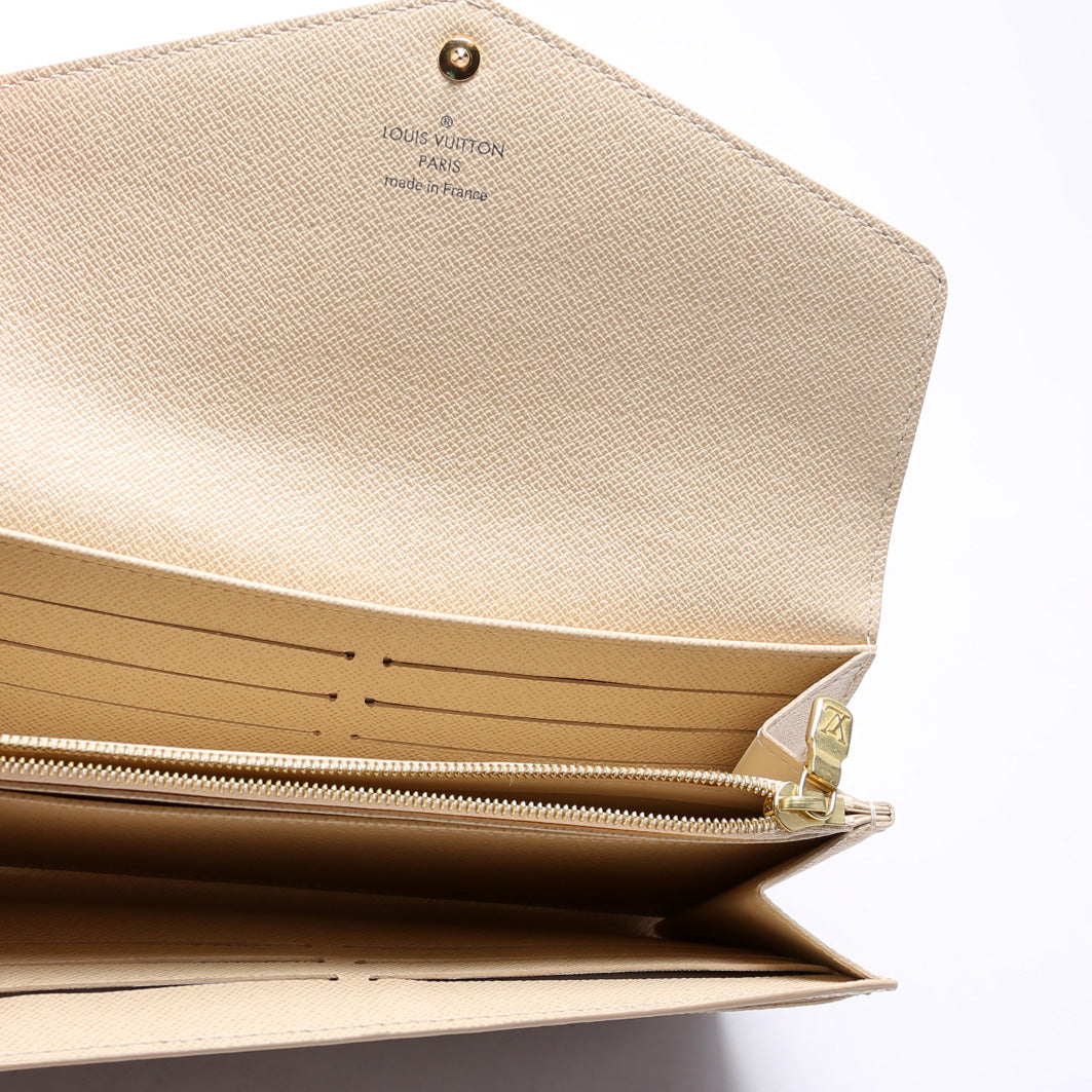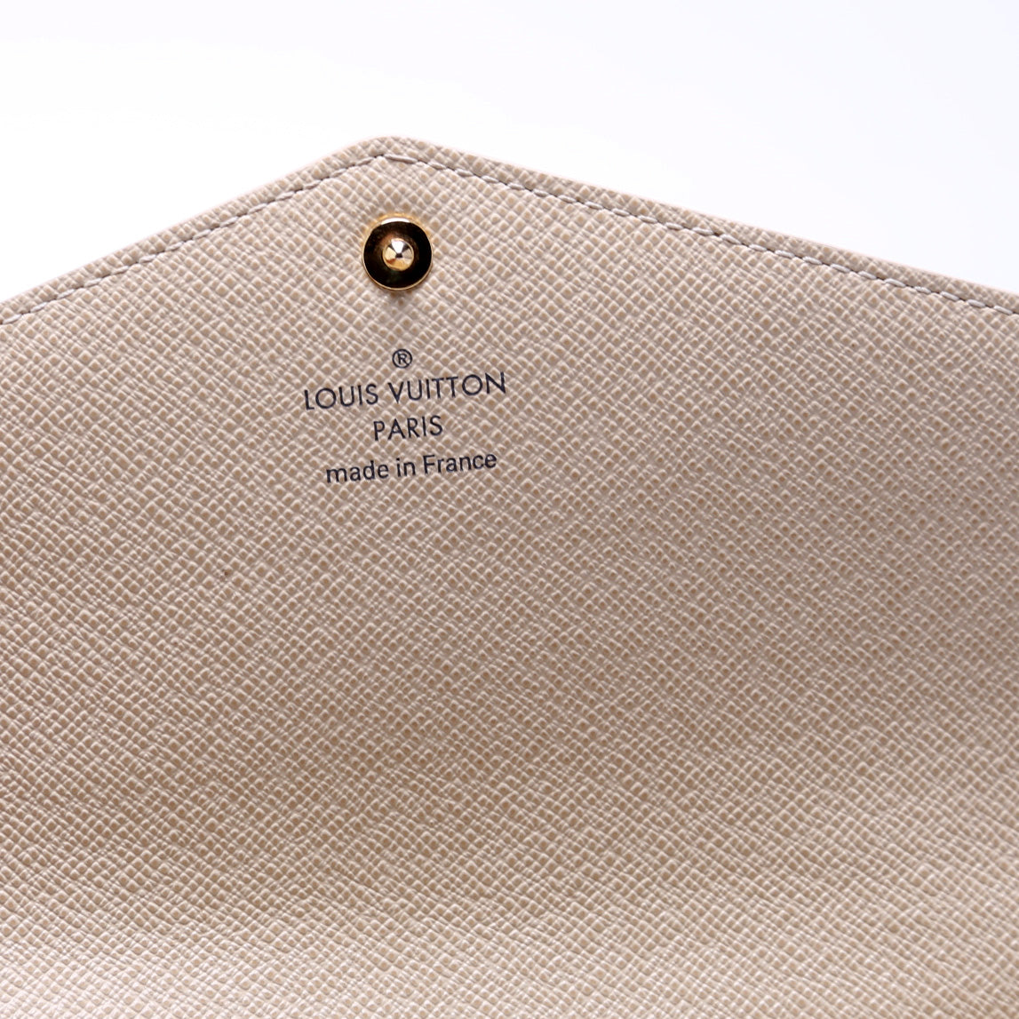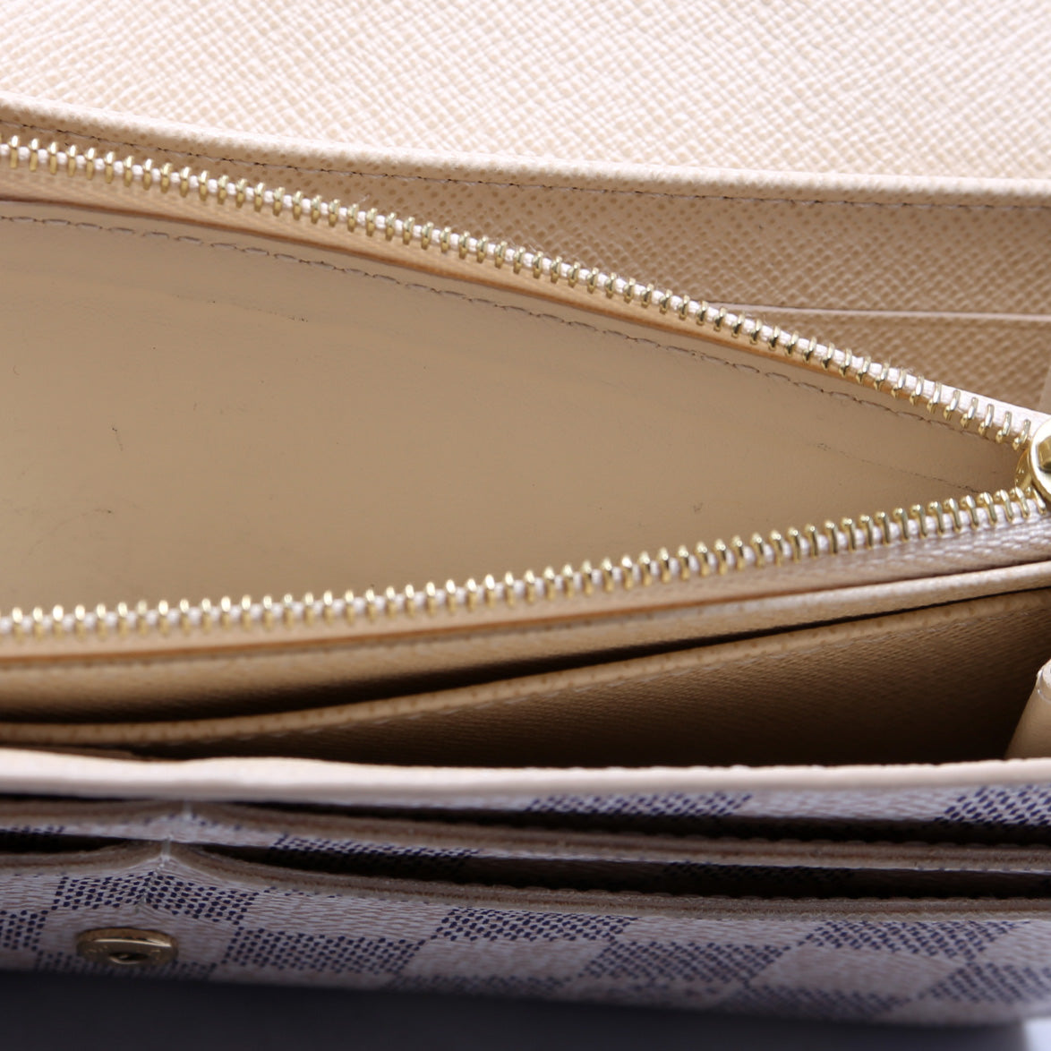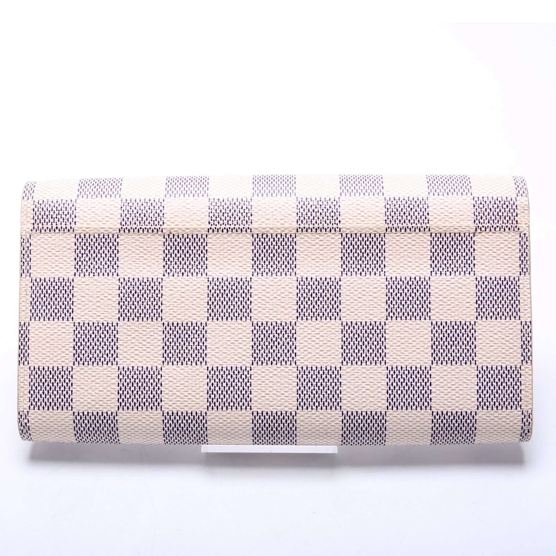 This pre-owned Louis Vuitton Sarah Wallet Newer is guaranteed 100% authentic. The exterior is in the classic Louis Vuitton Damier Azur coated canvas.