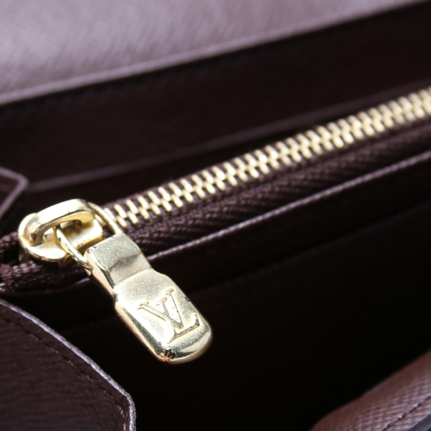 This pre-owned Louis Vuitton Sarah Wallet Newer is guaranteed 100% authentic. The exterior is in the classic Louis Vuitton Damier Ebene coated canvas.