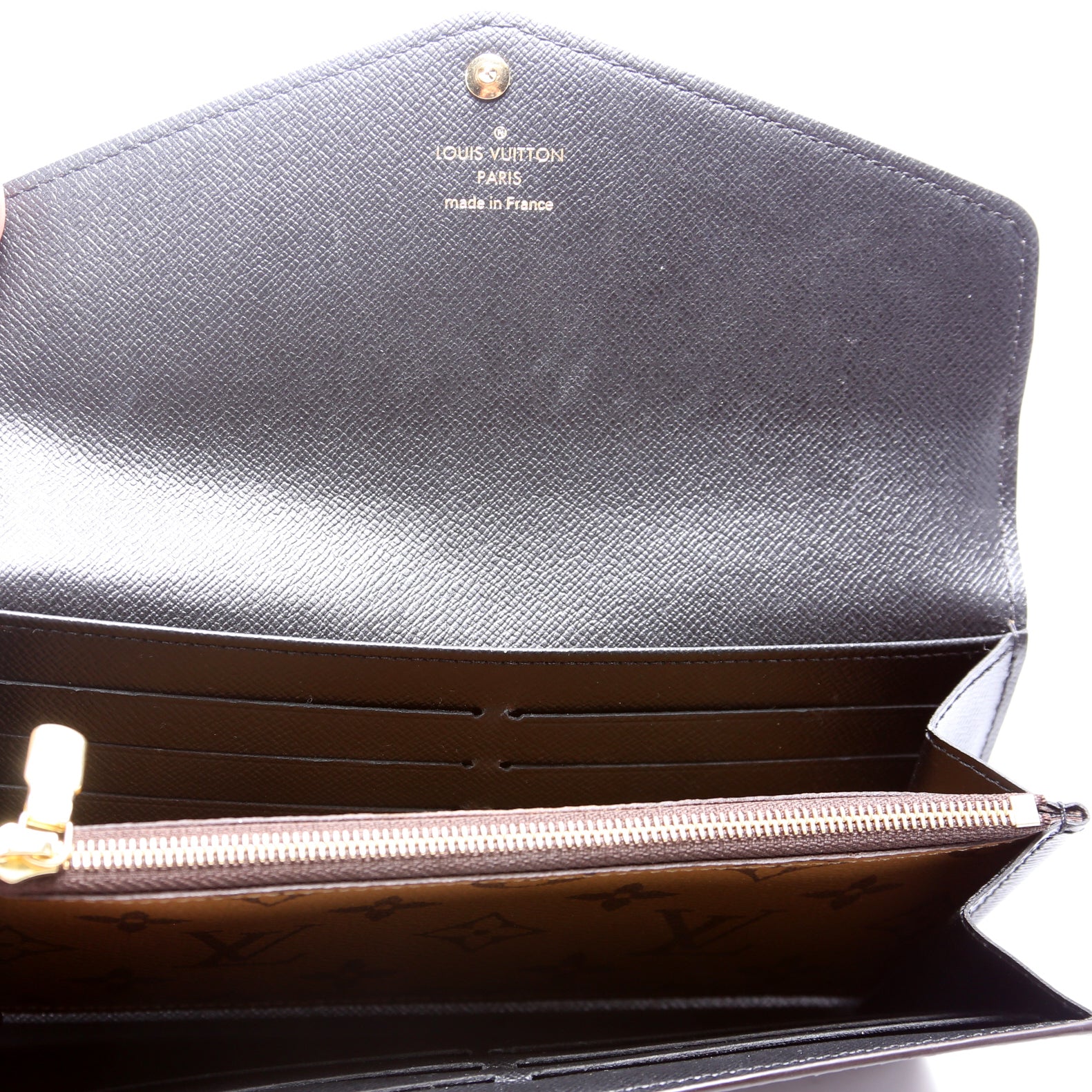 This pre-owned Louis Vuitton Sarah Wallet Newer is guaranteed 100% authentic. The exterior is in the classic Louis Vuitton Reverse Monogram coated canvas.
