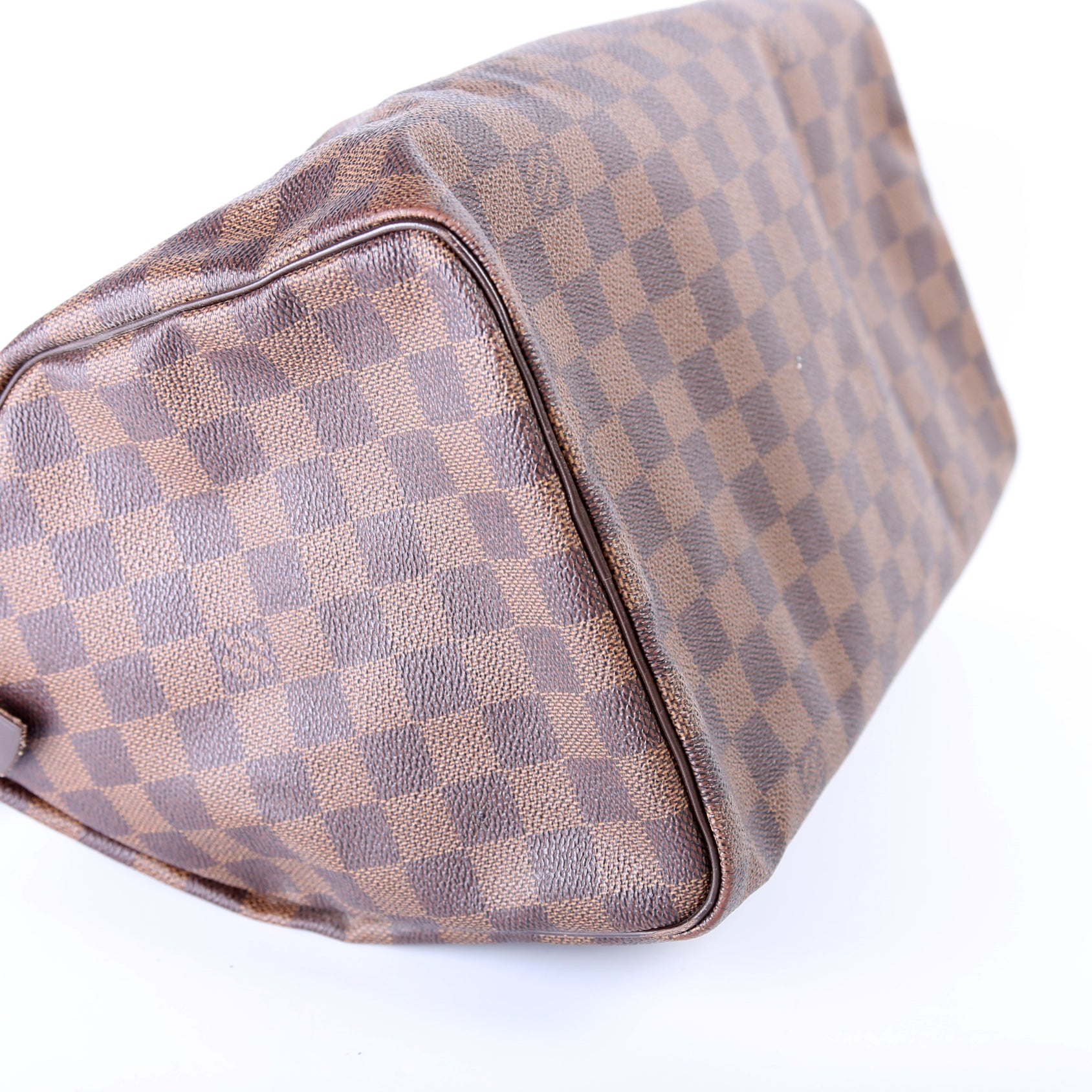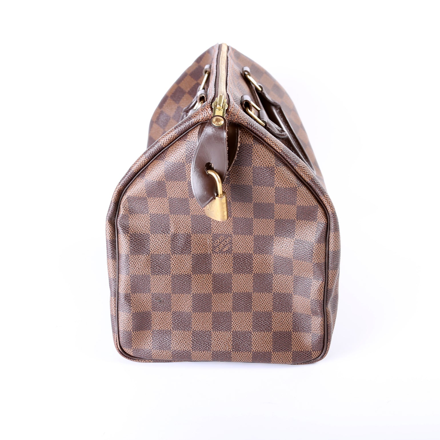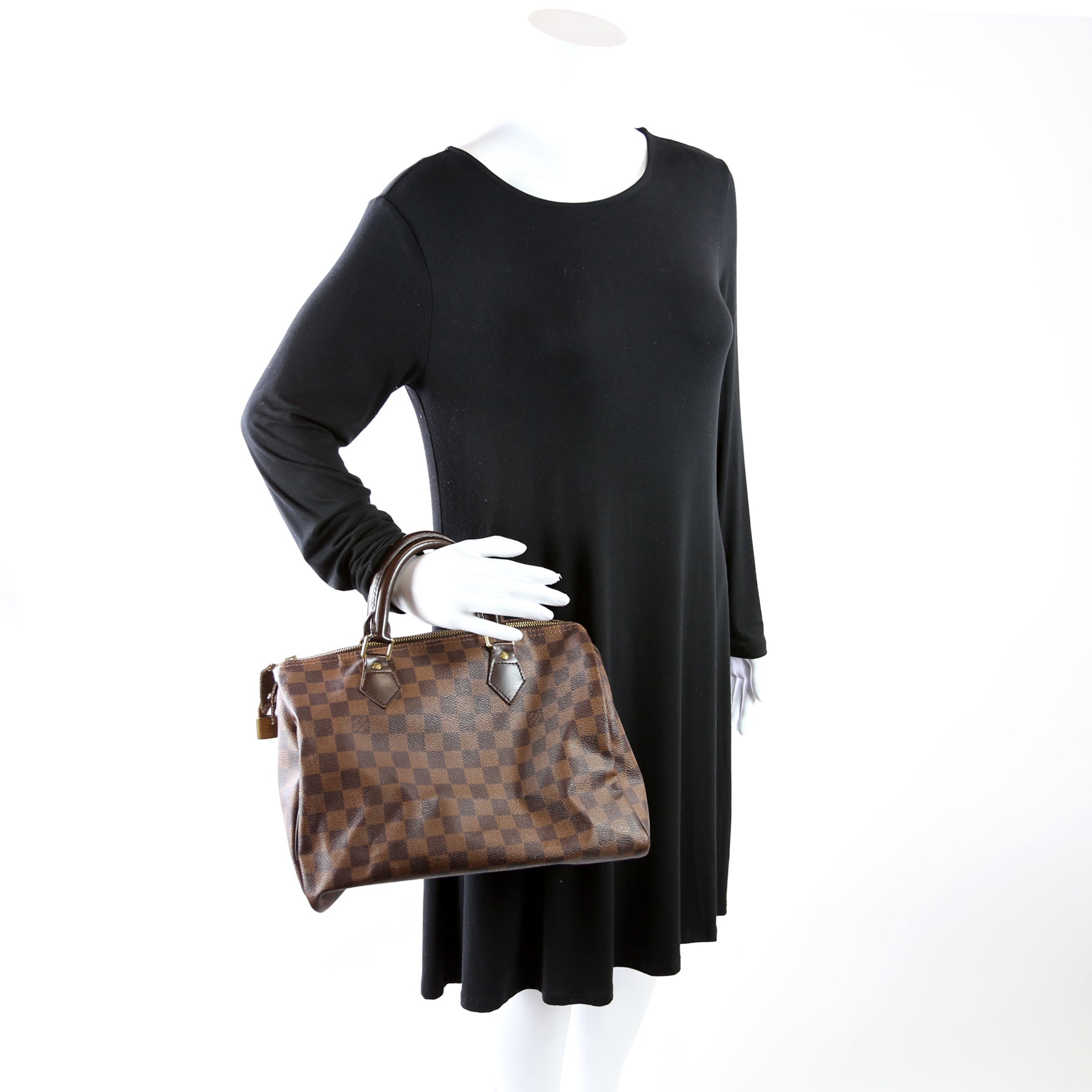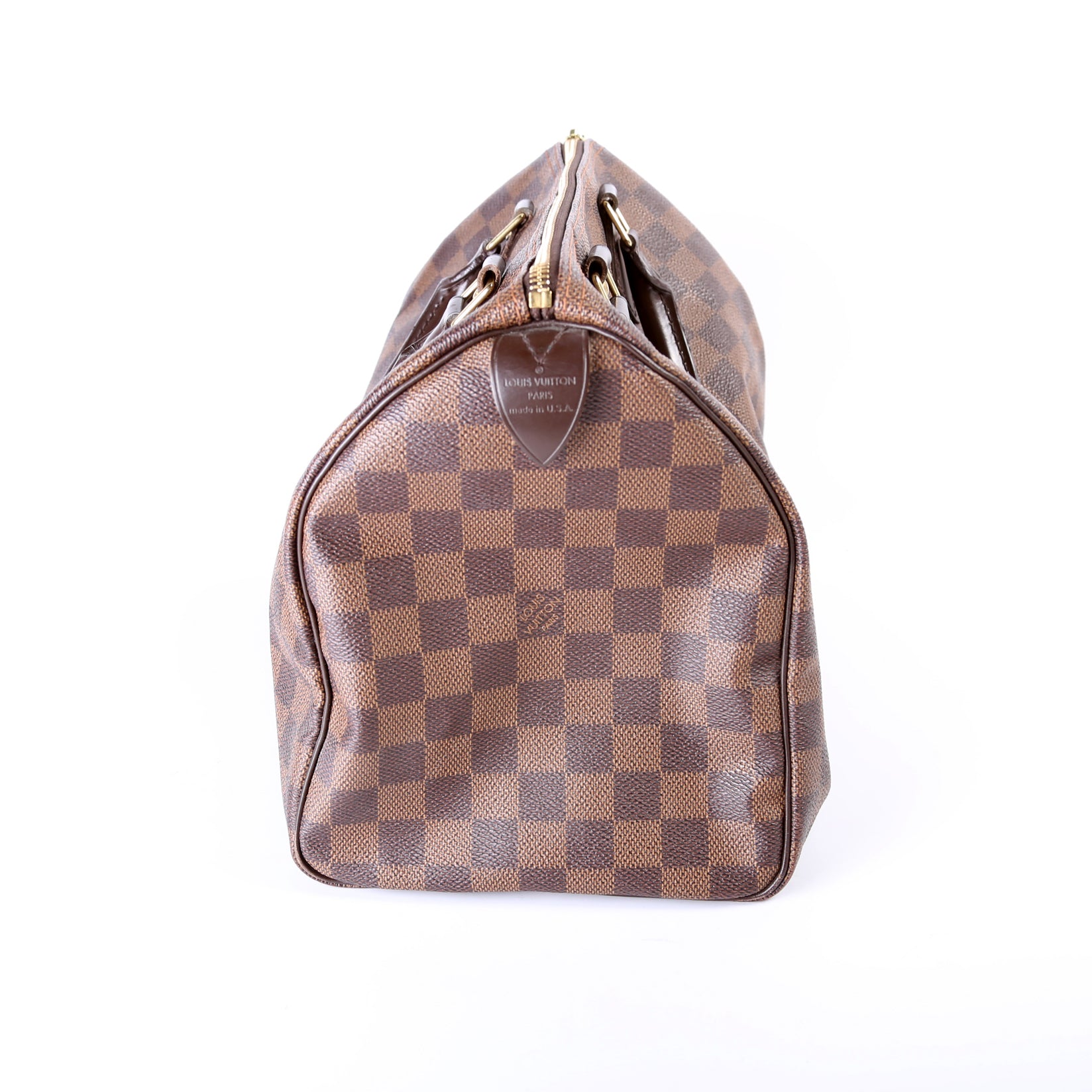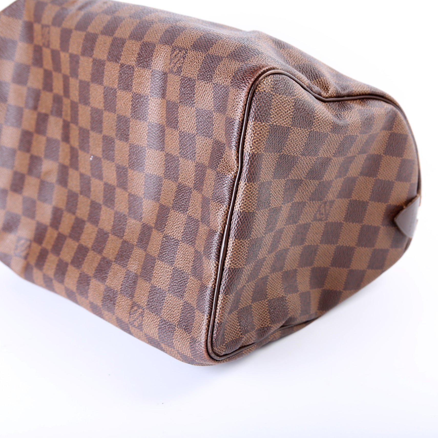 This pre-owned Louis Vuitton Speedy 30 is guaranteed 100% authentic. The exterior is in the classic Louis Vuitton Damier Ebene coated canvas.