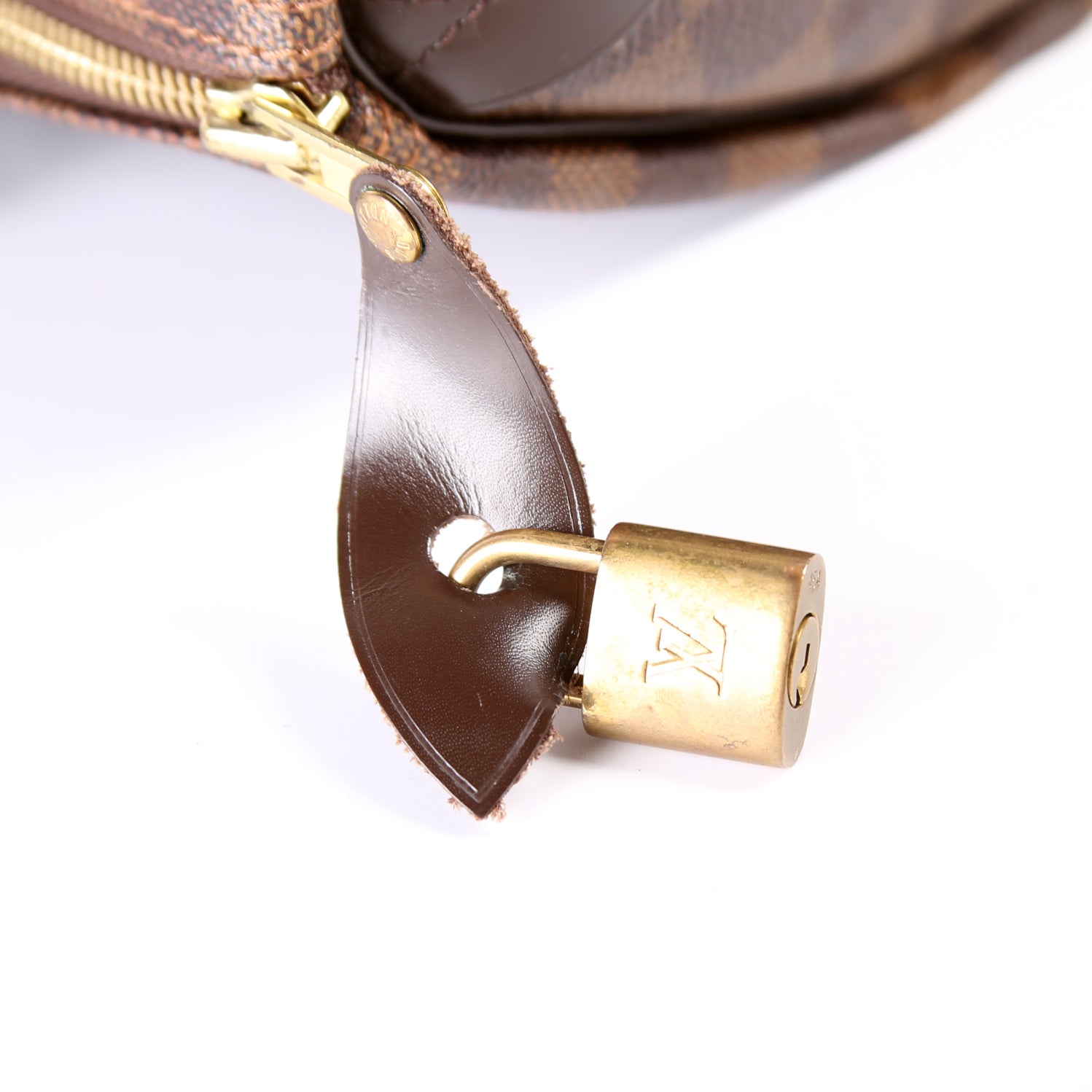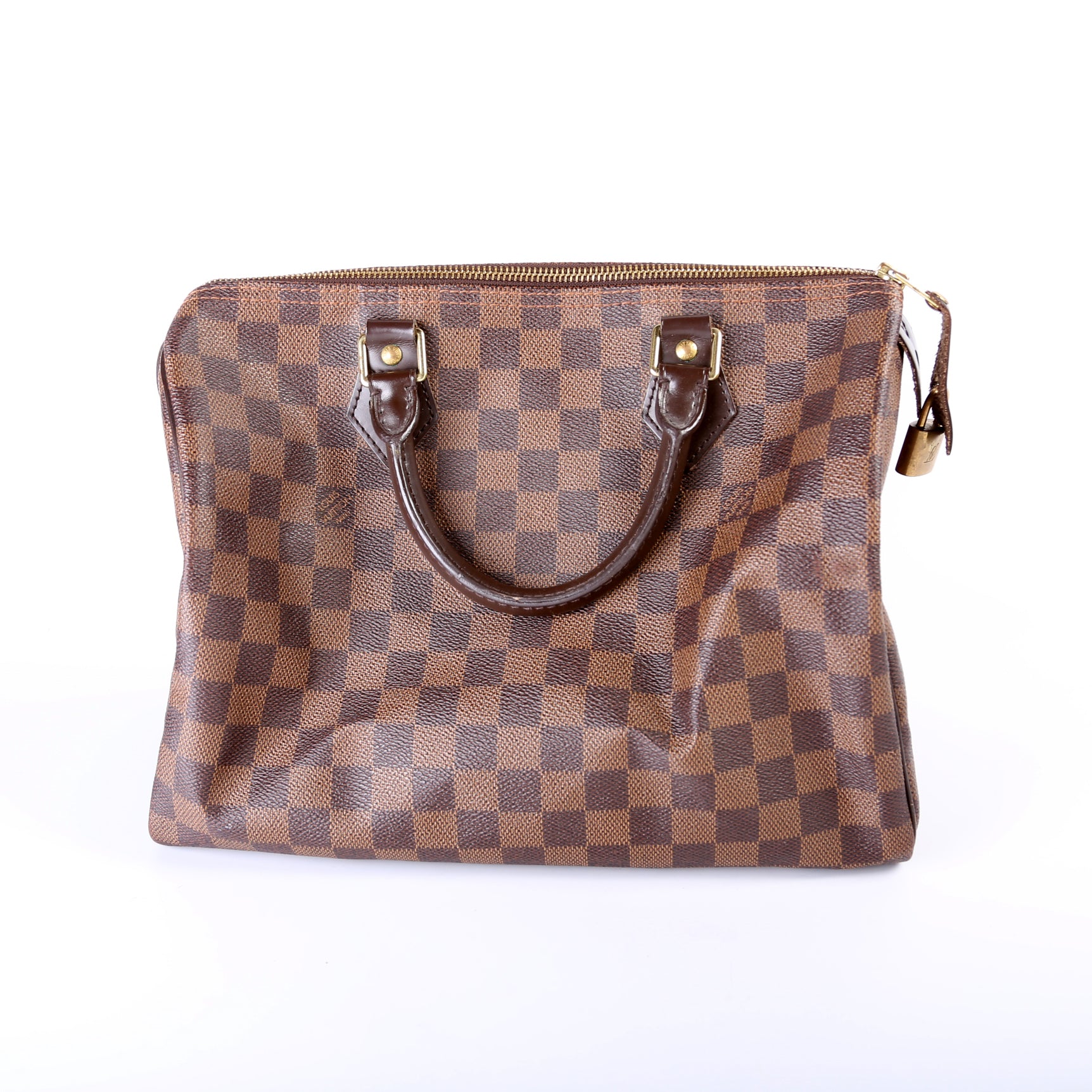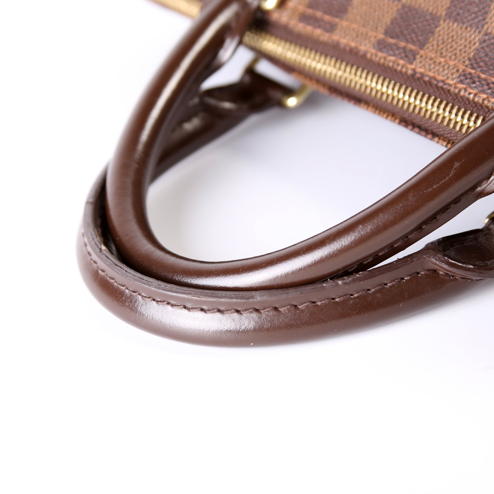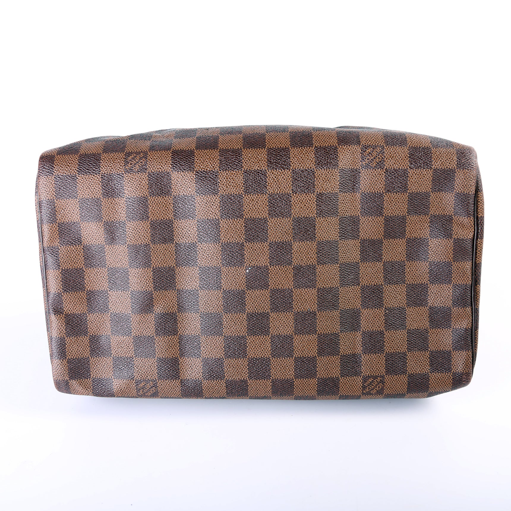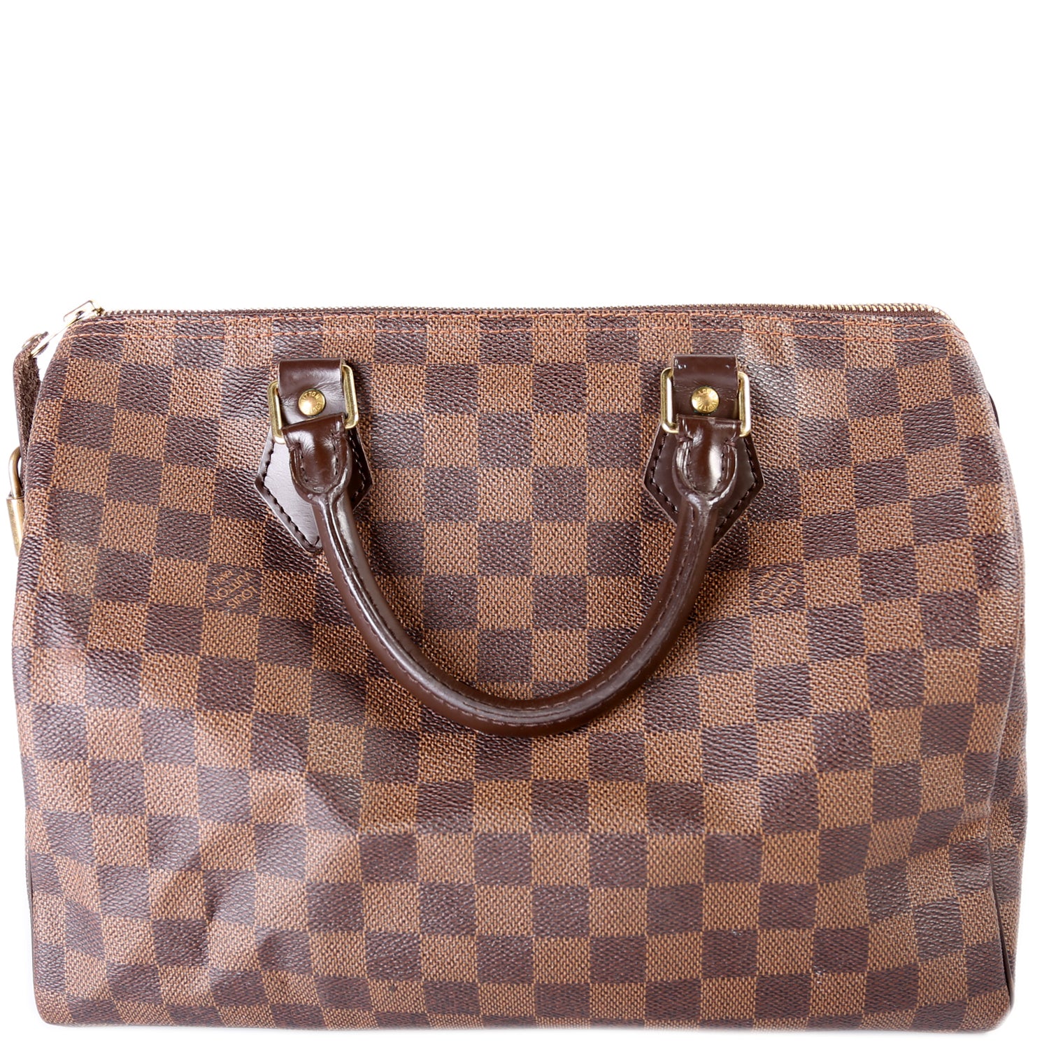 This pre-owned Louis Vuitton Speedy 30 is guaranteed 100% authentic. The exterior is in the classic Louis Vuitton Damier Ebene coated canvas.