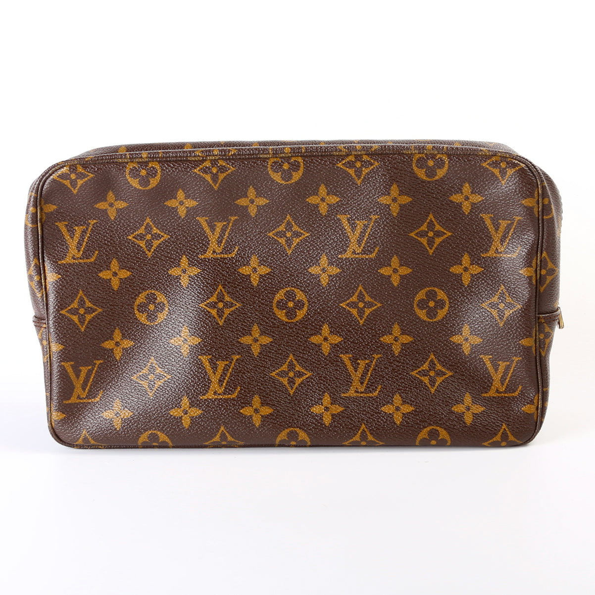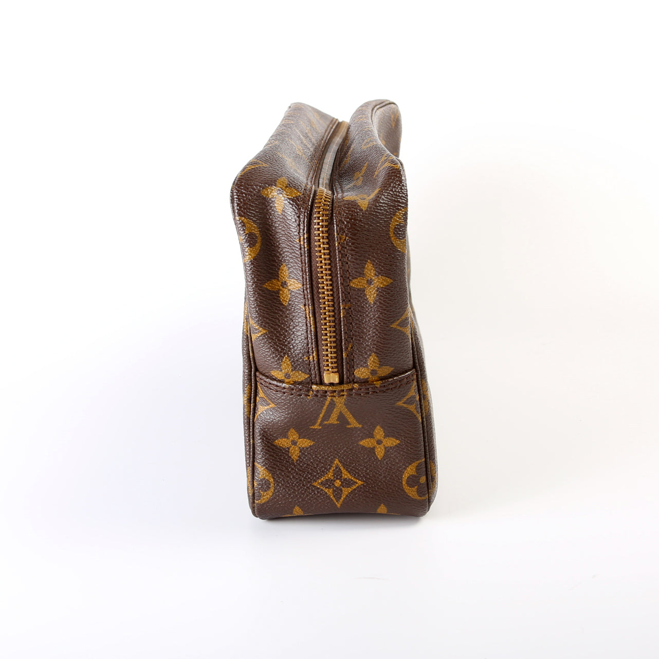 This pre-owned Louis Vuitton Trousse Toilette 28 is guaranteed 100% authentic. The exterior is in the classic Louis Vuitton Monogram coated canvas.