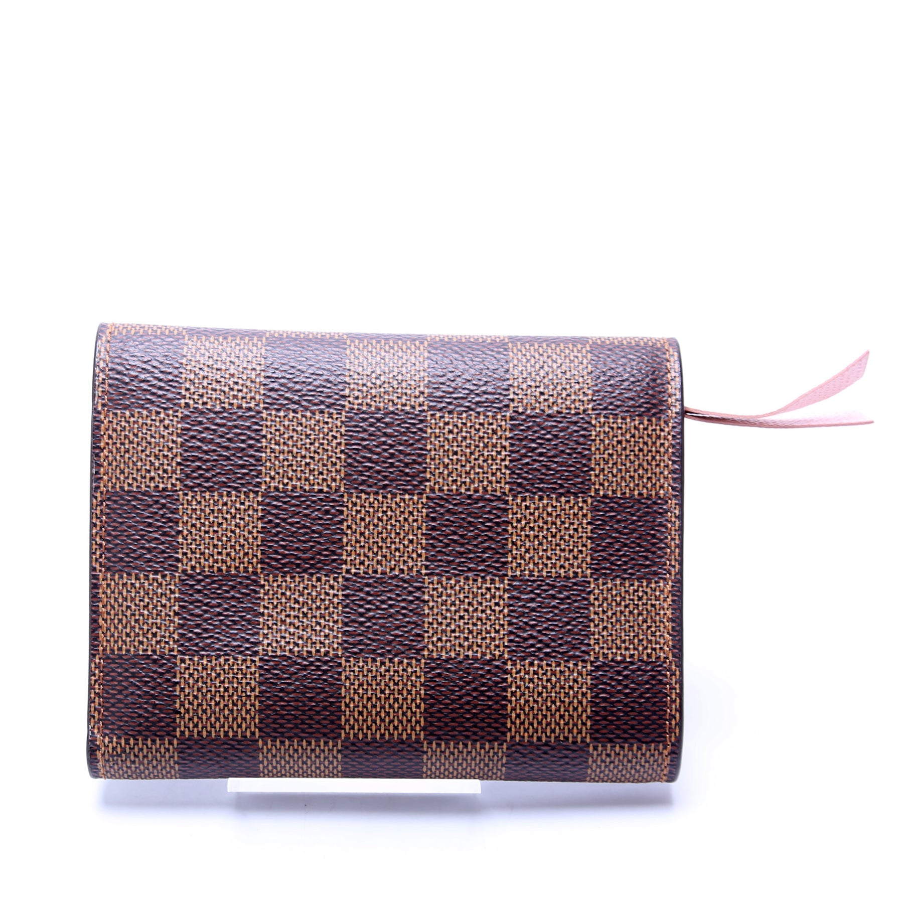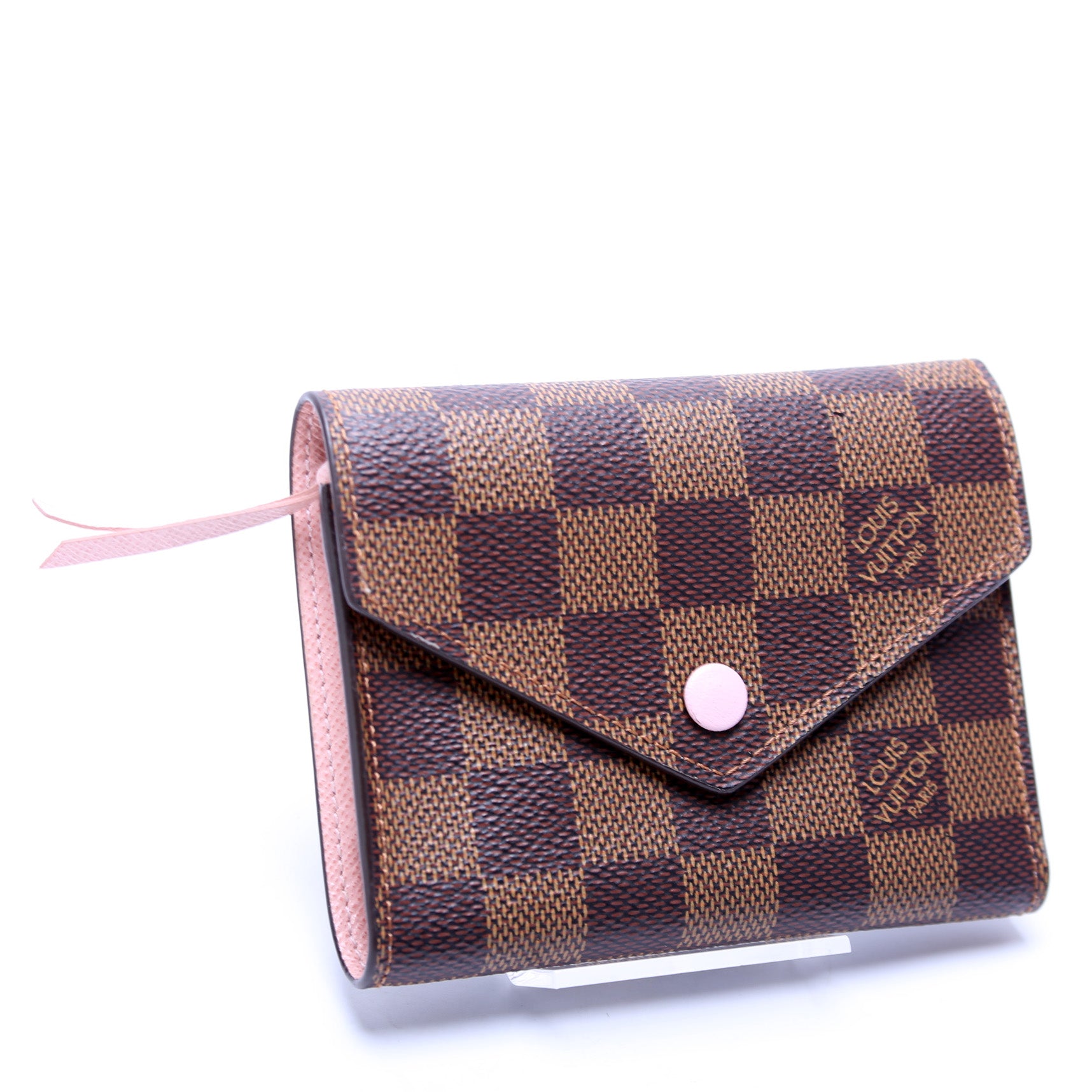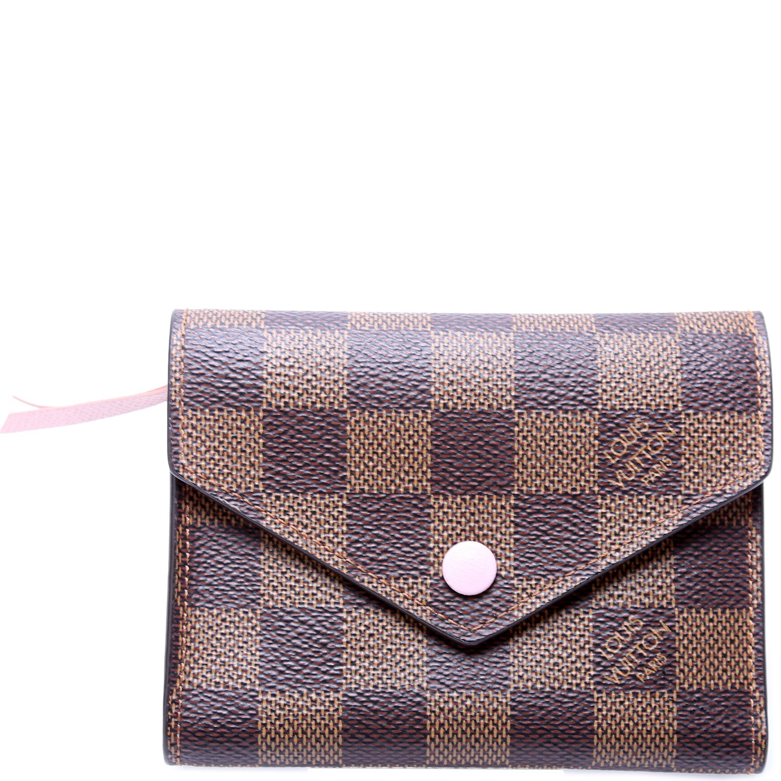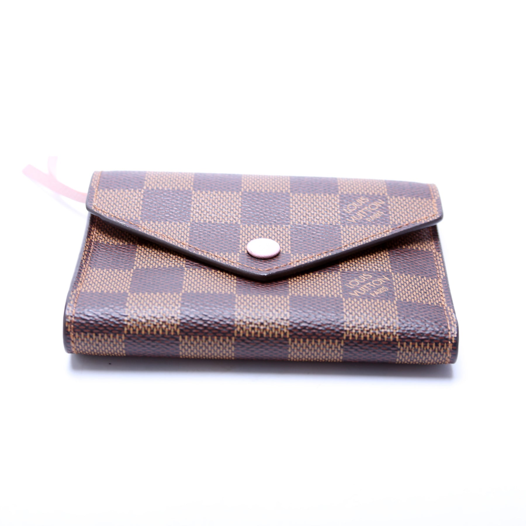 This pre-owned Louis Vuitton Victorine Wallet is guaranteed 100% authentic. The exterior is in the classic Louis Vuitton Damier Ebene coated canvas.