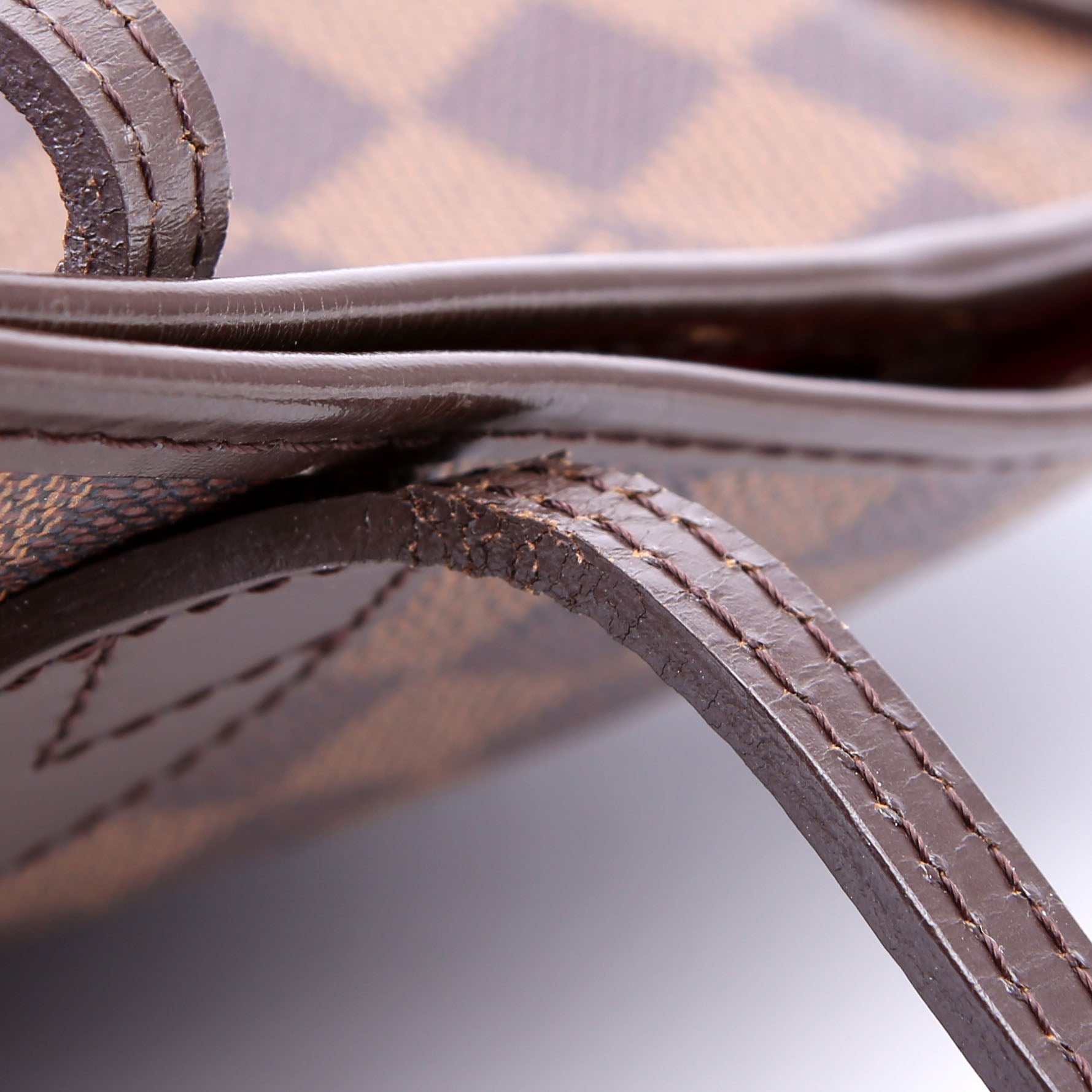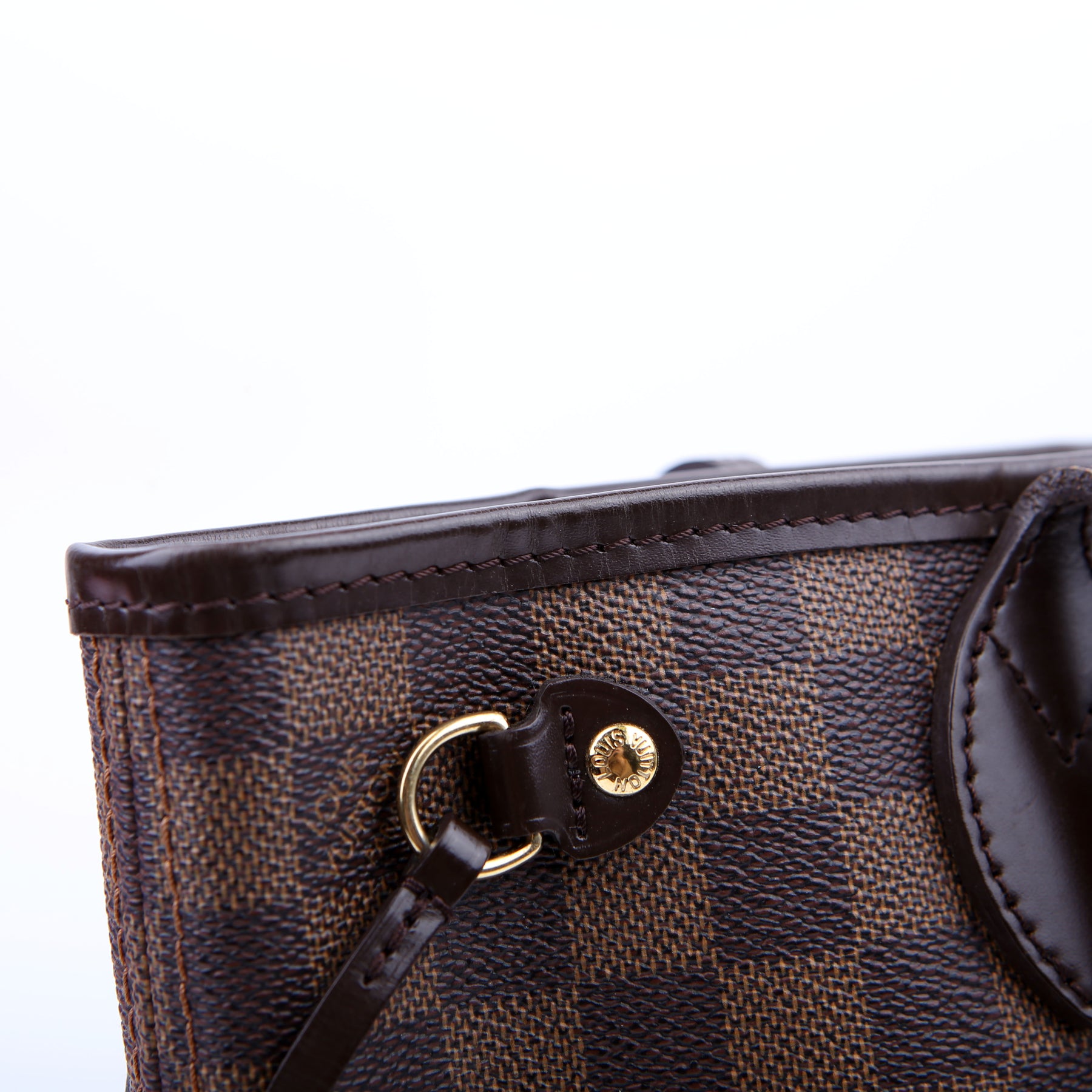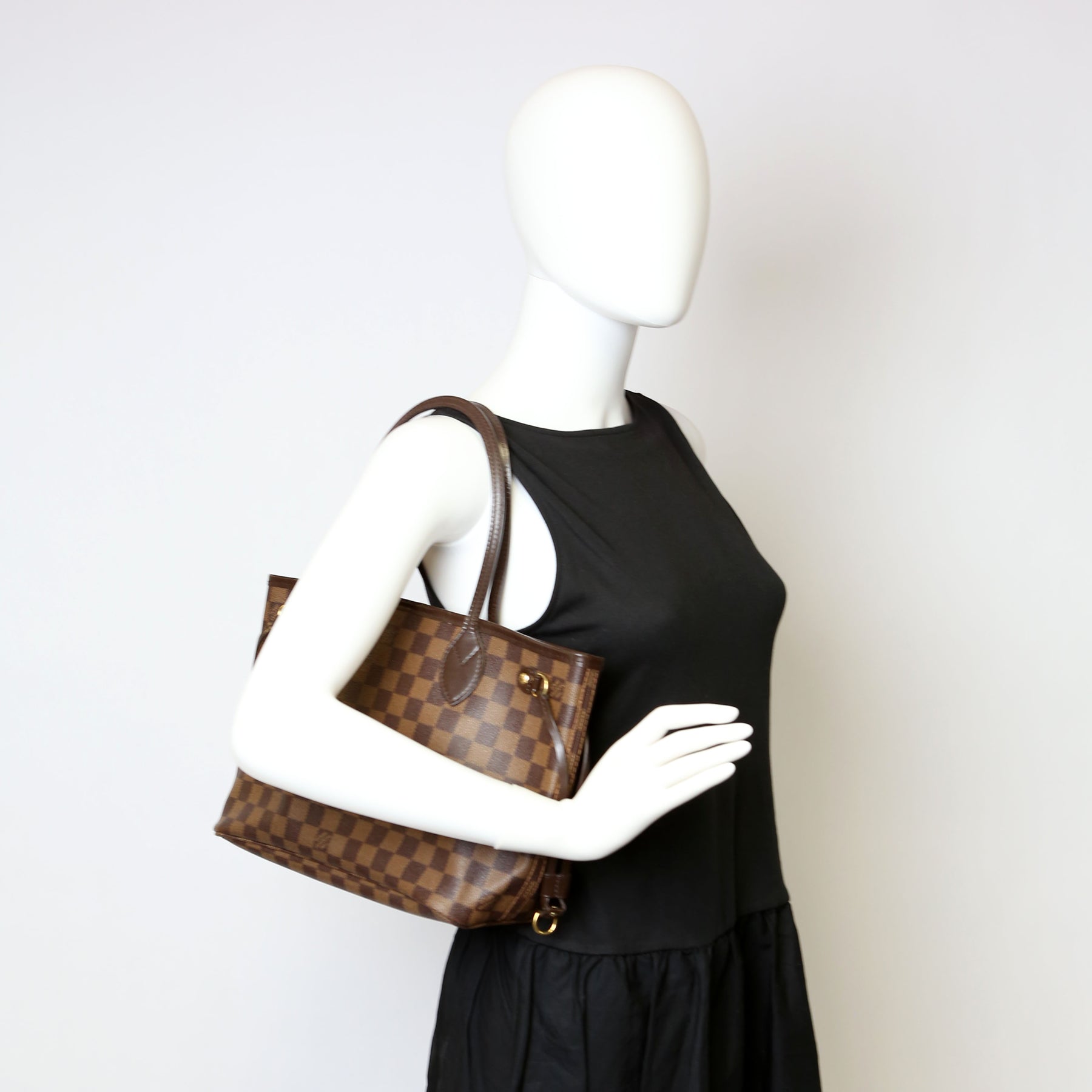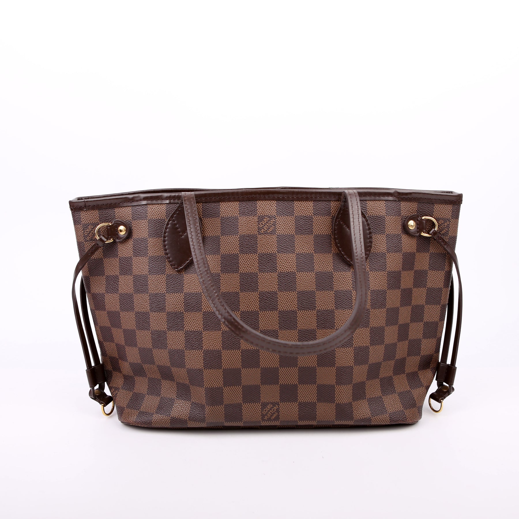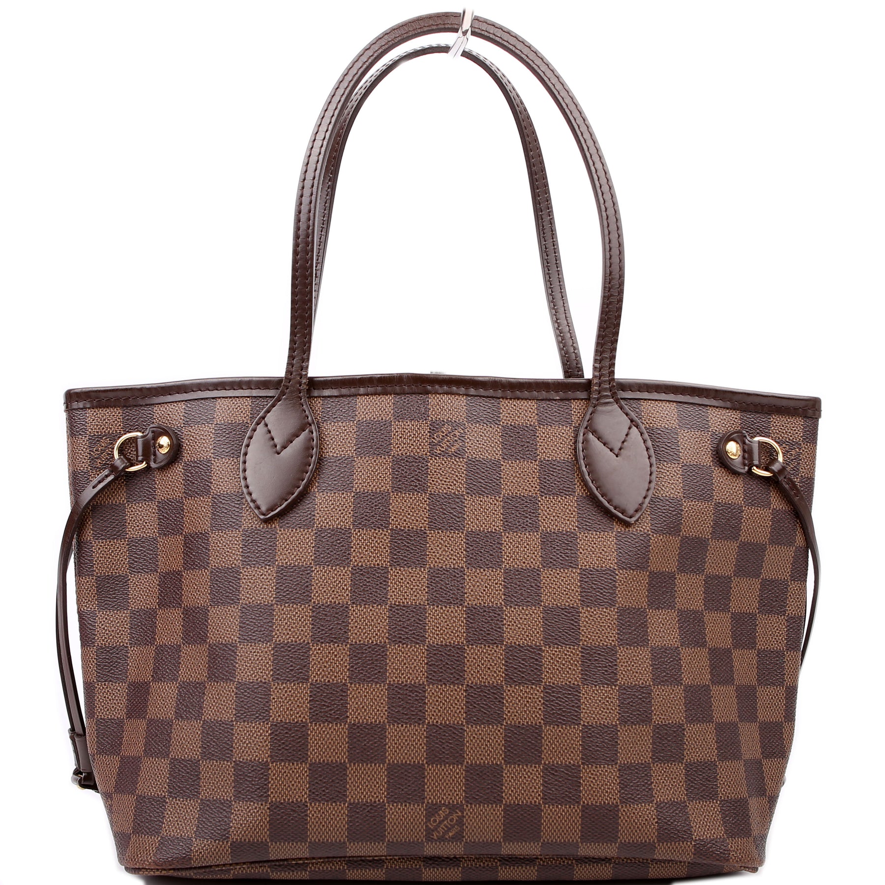 This pre-owned Louis Vuitton Neverfull PM is guaranteed 100% authentic. The exterior is in the classic Louis Vuitton Damier Ebene coated canvas.