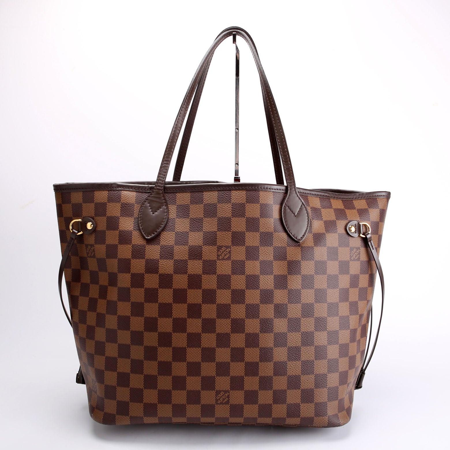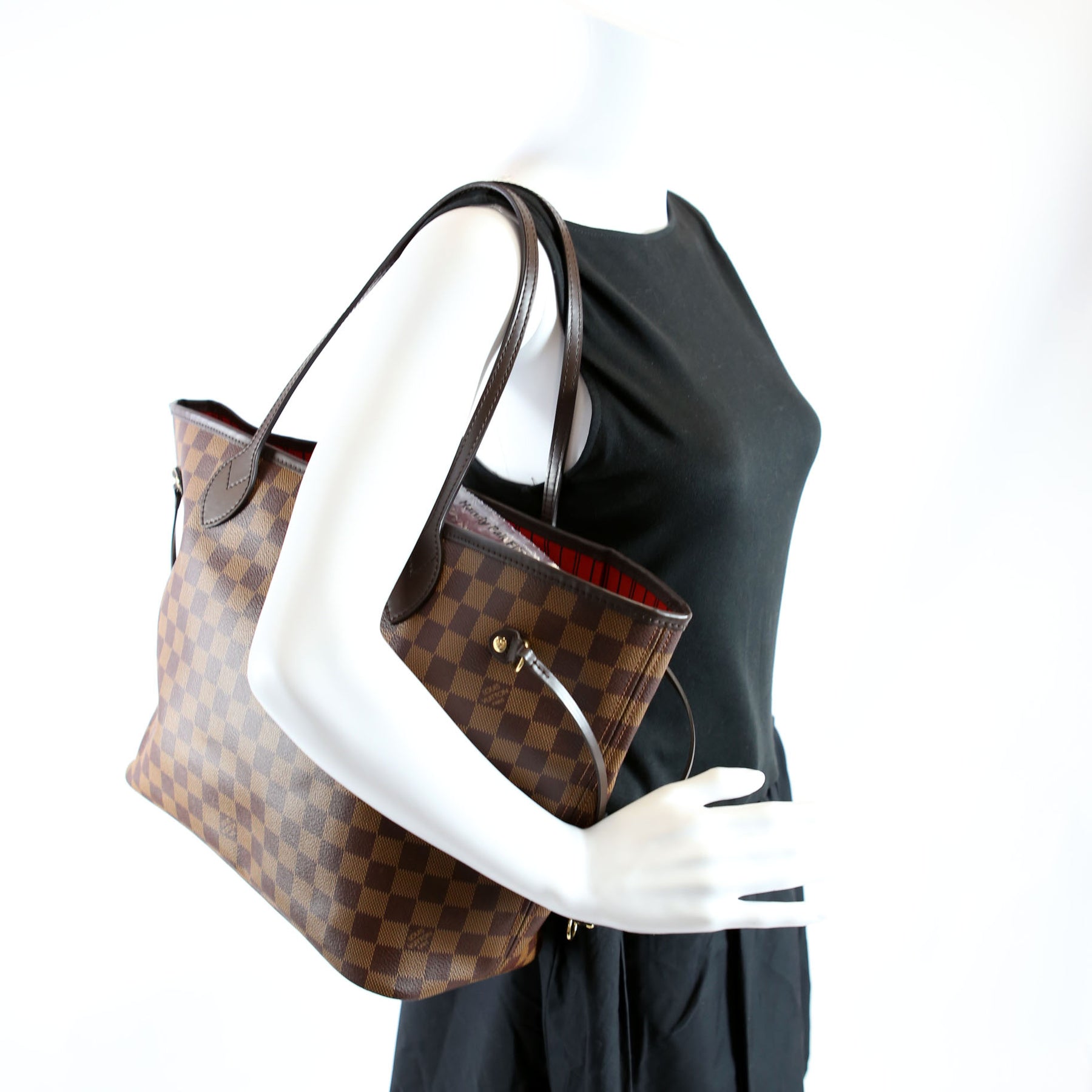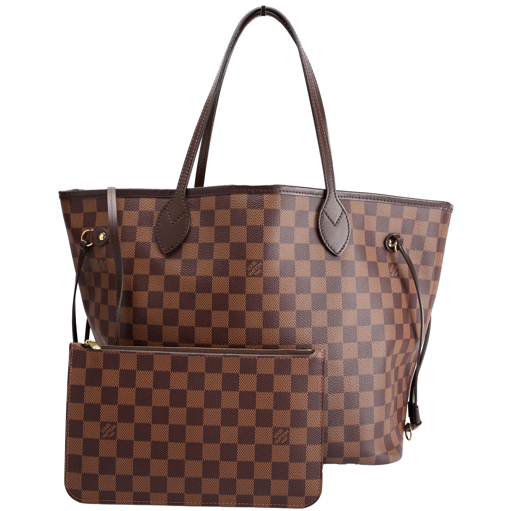 This pre-owned Louis Vuitton Neverfull With Wallet MM is guaranteed 100% authentic. The exterior is in the classic Louis Vuitton Damier Ebene coated canvas.
