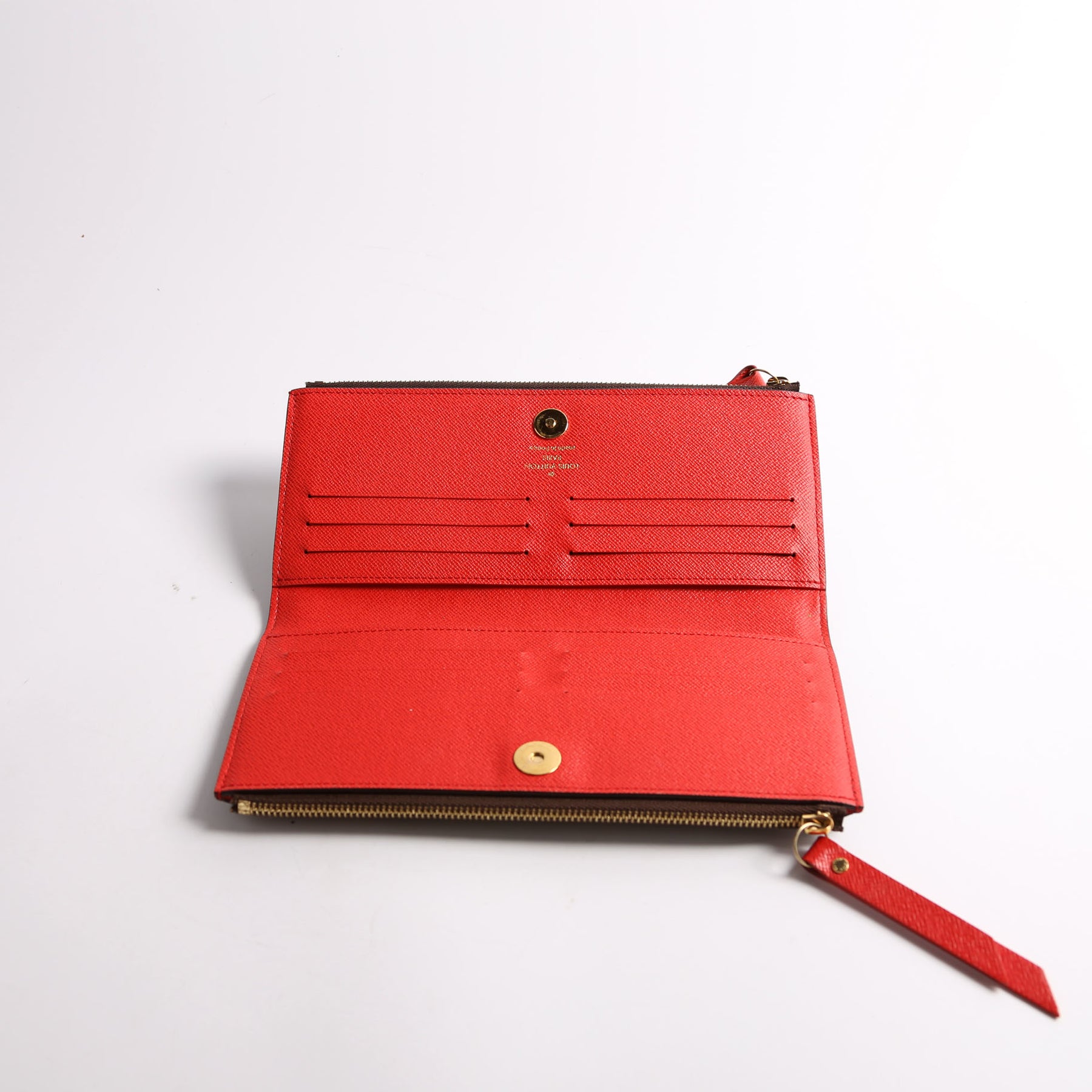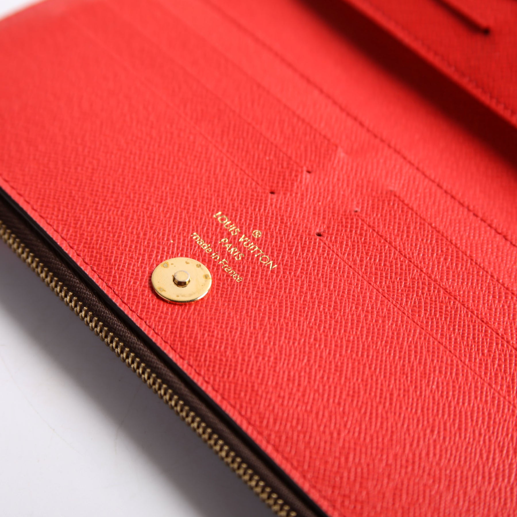 Interior: The interior is clean and free of rips or tears. The interior features twelve card slots, two bill slots, and two zip closure coin pouches.