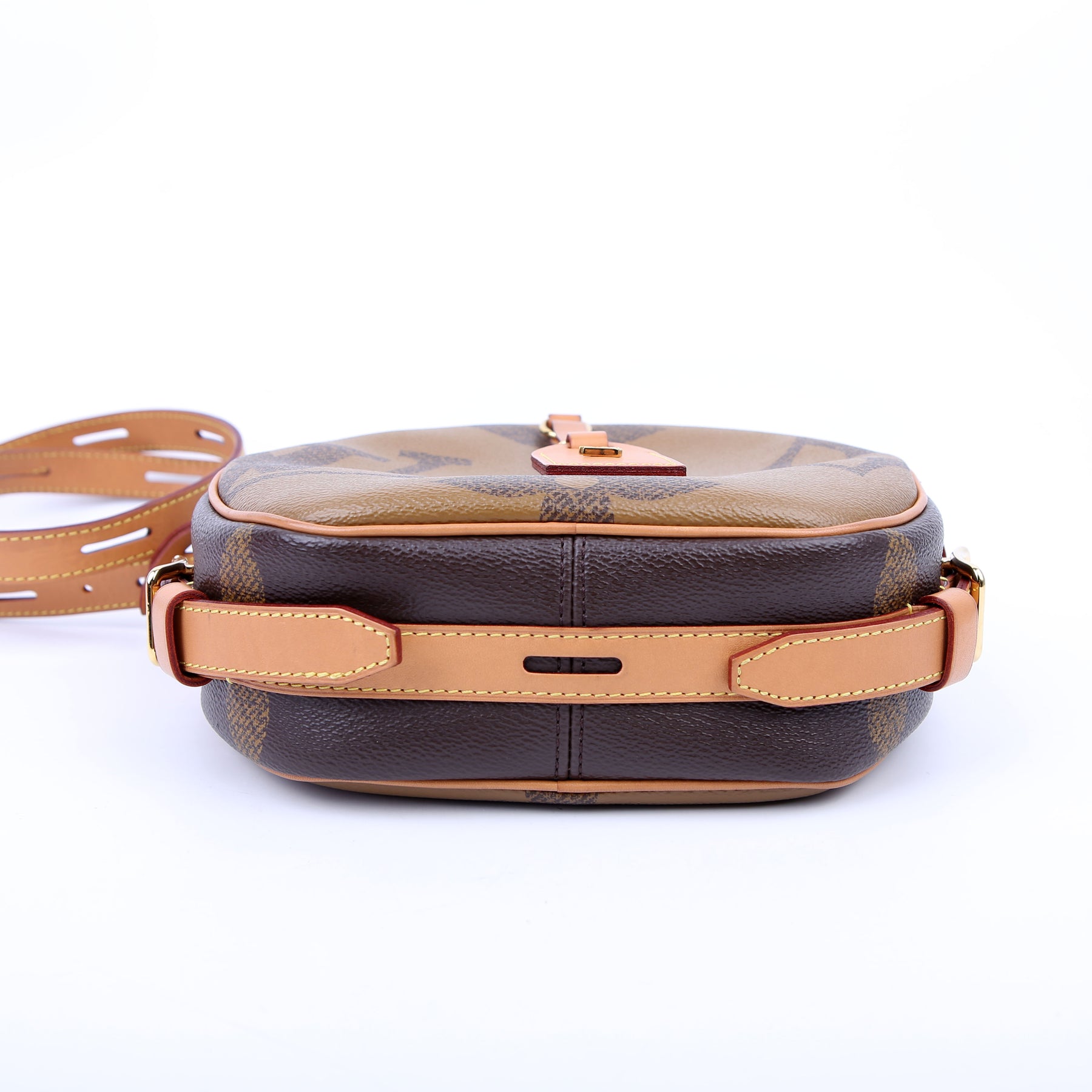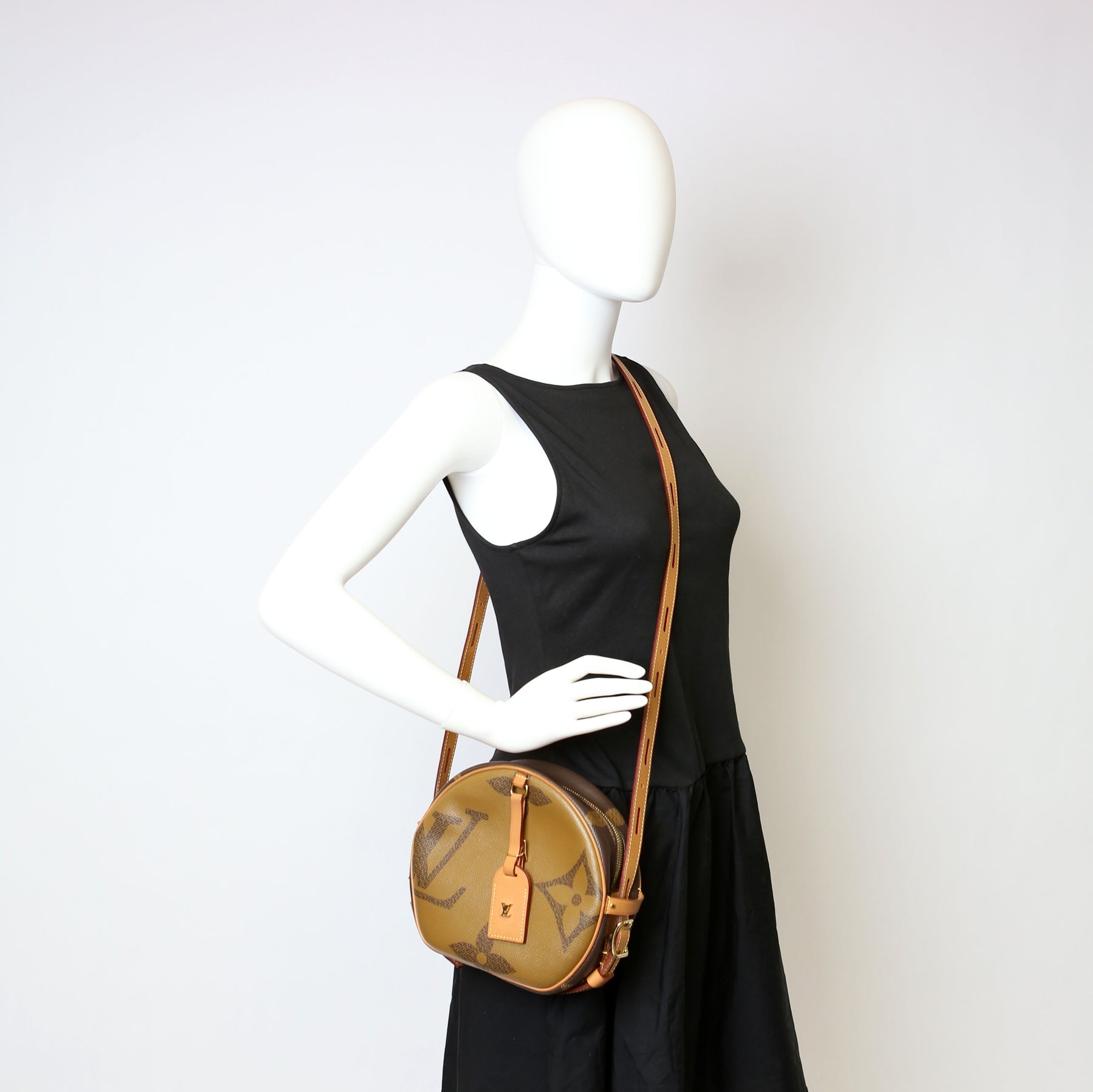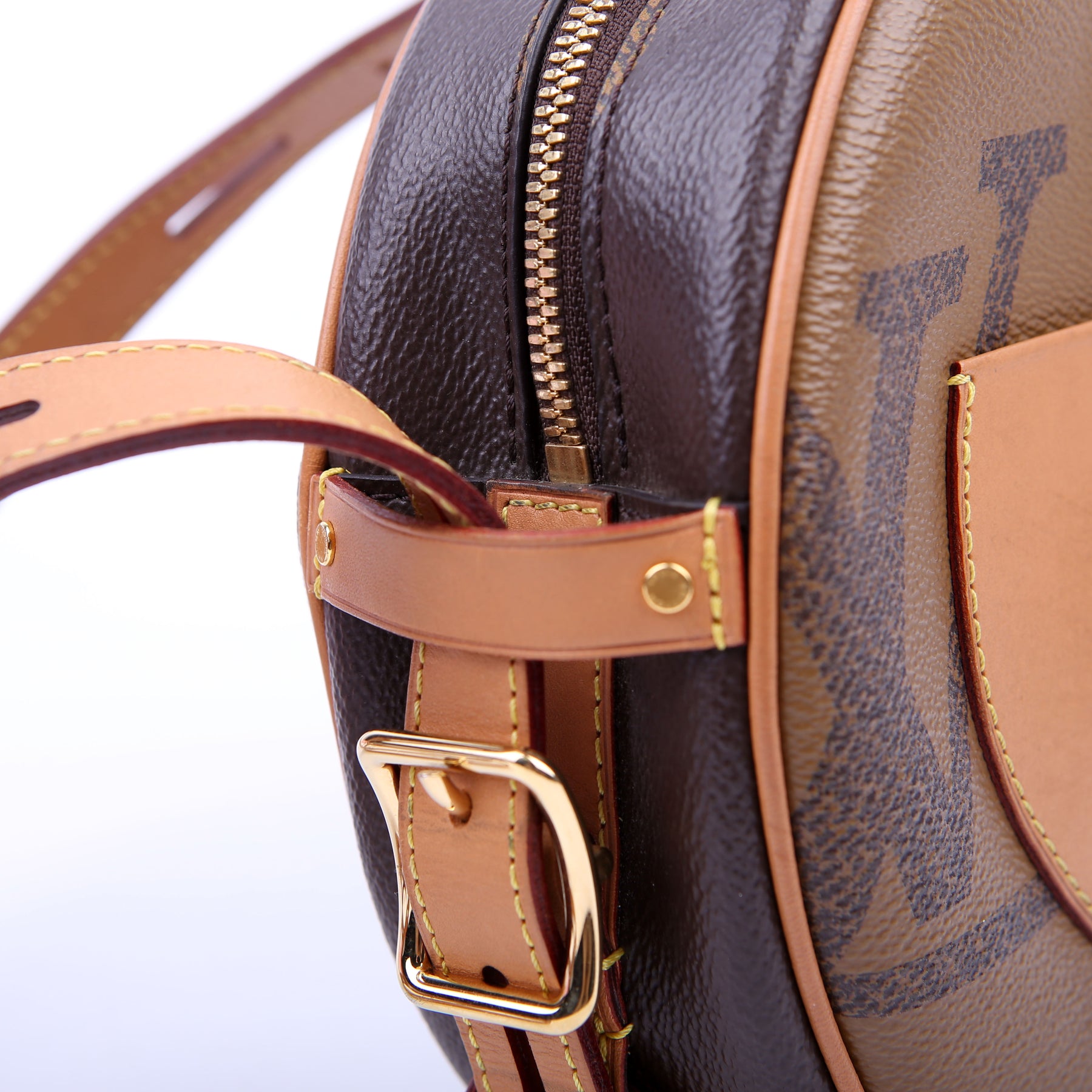 This pre-owned Louis Vuitton Boite Chapeau is guaranteed 100% authentic. The exterior is in the classic Louis Vuitton Reverse Giant Monogram coated canvas.