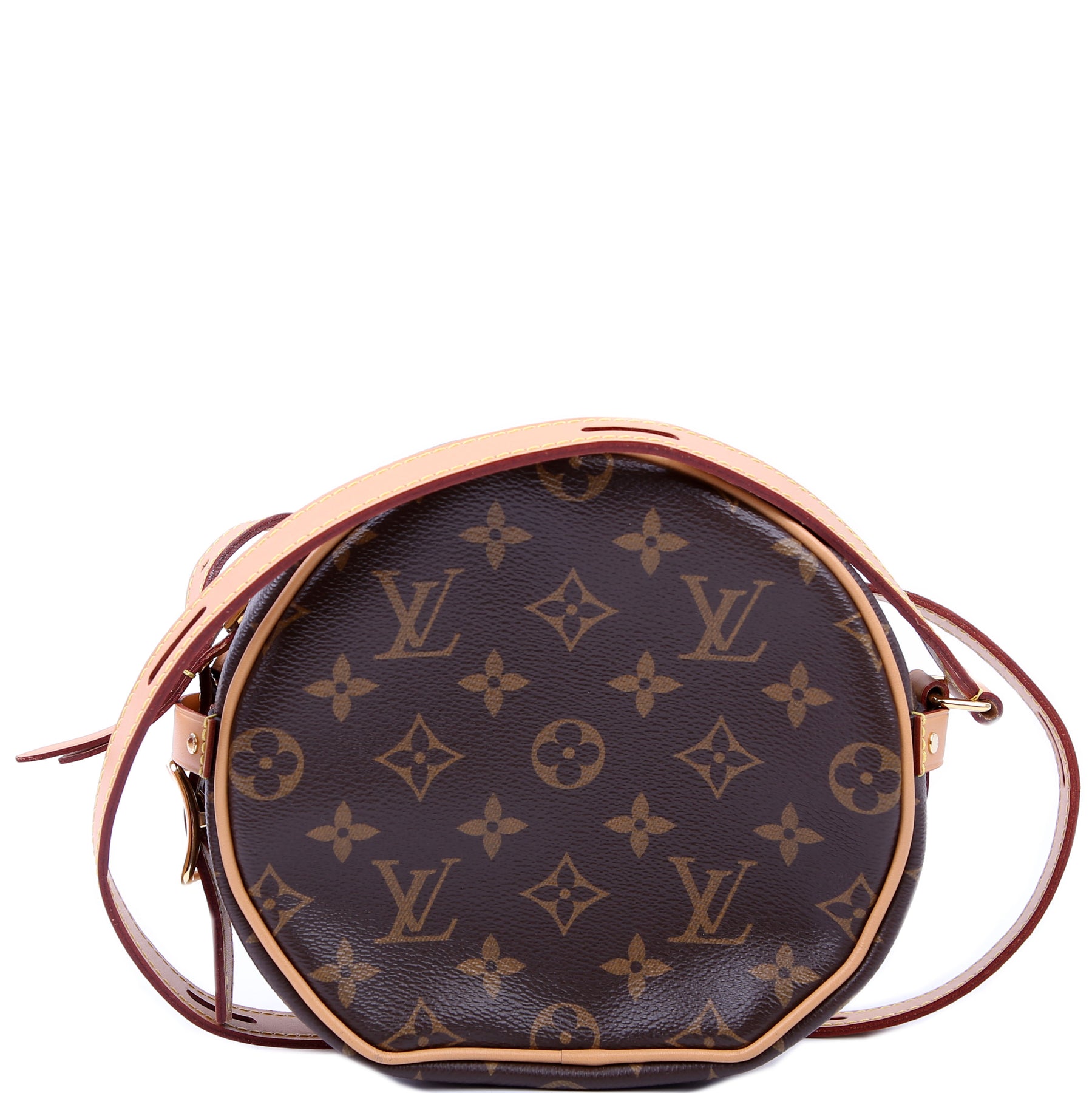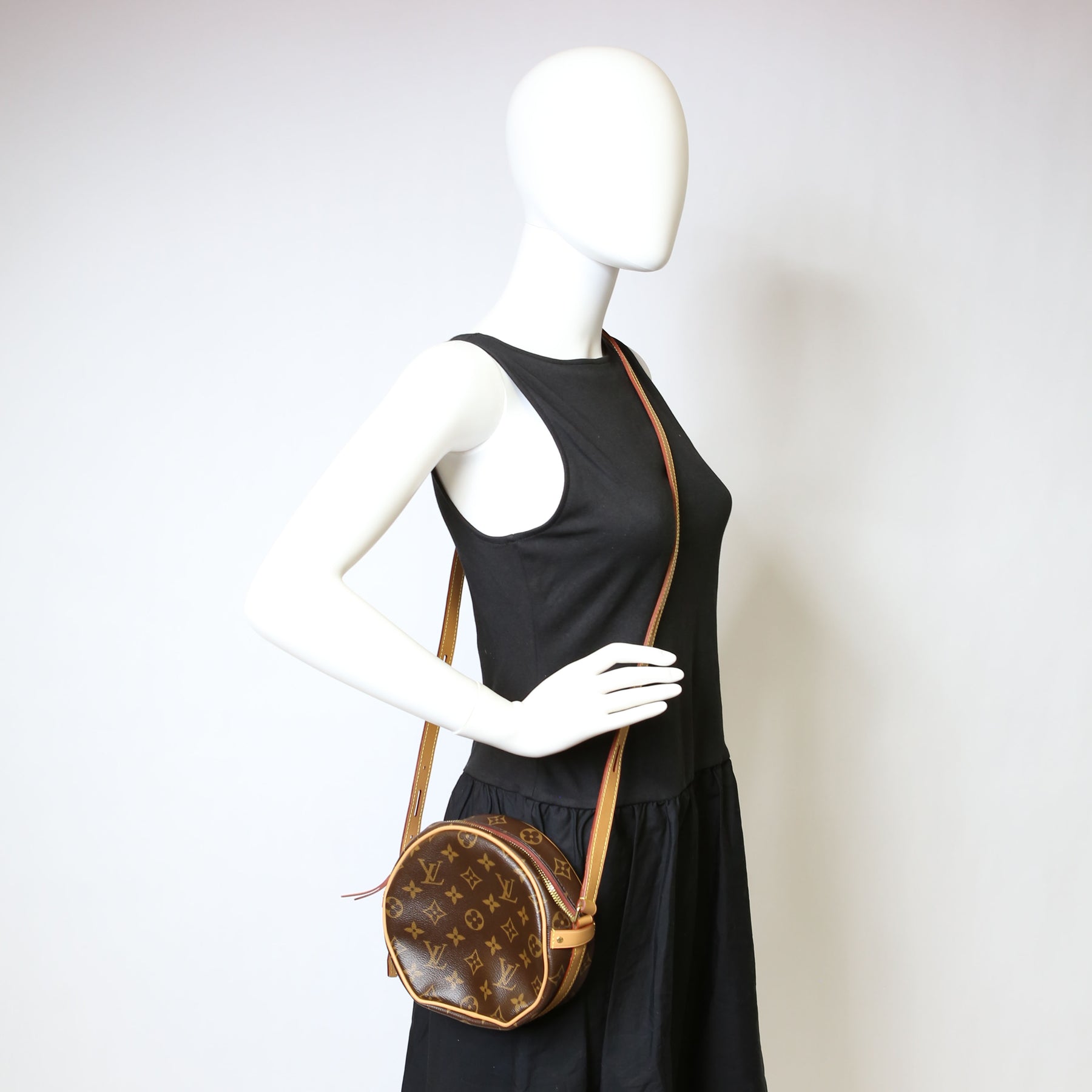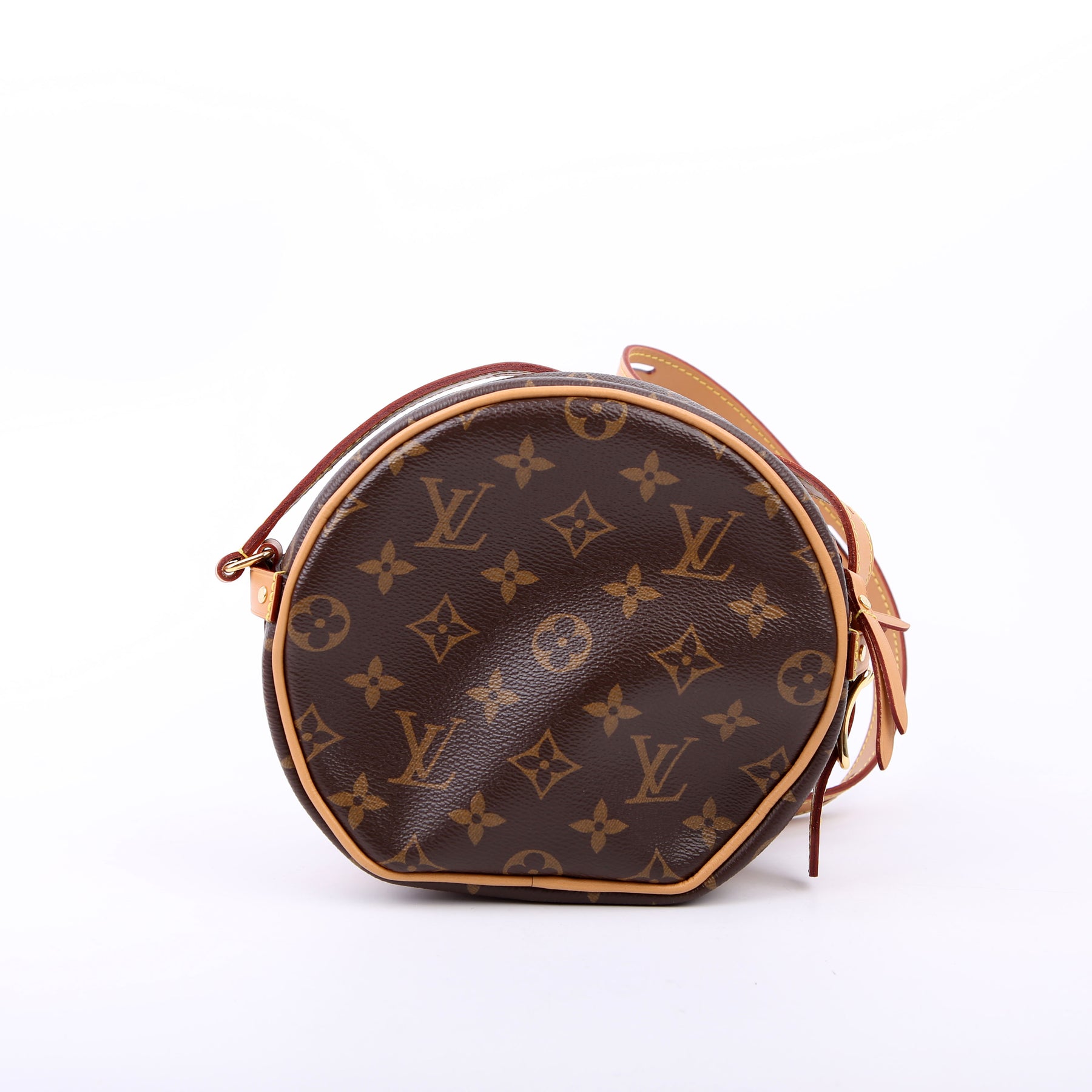 This pre-owned Louis Vuitton Boite Chapeau Souple PM is guaranteed 100% authentic. The exterior is in the classic Louis Vuitton Monogram coated canvas.