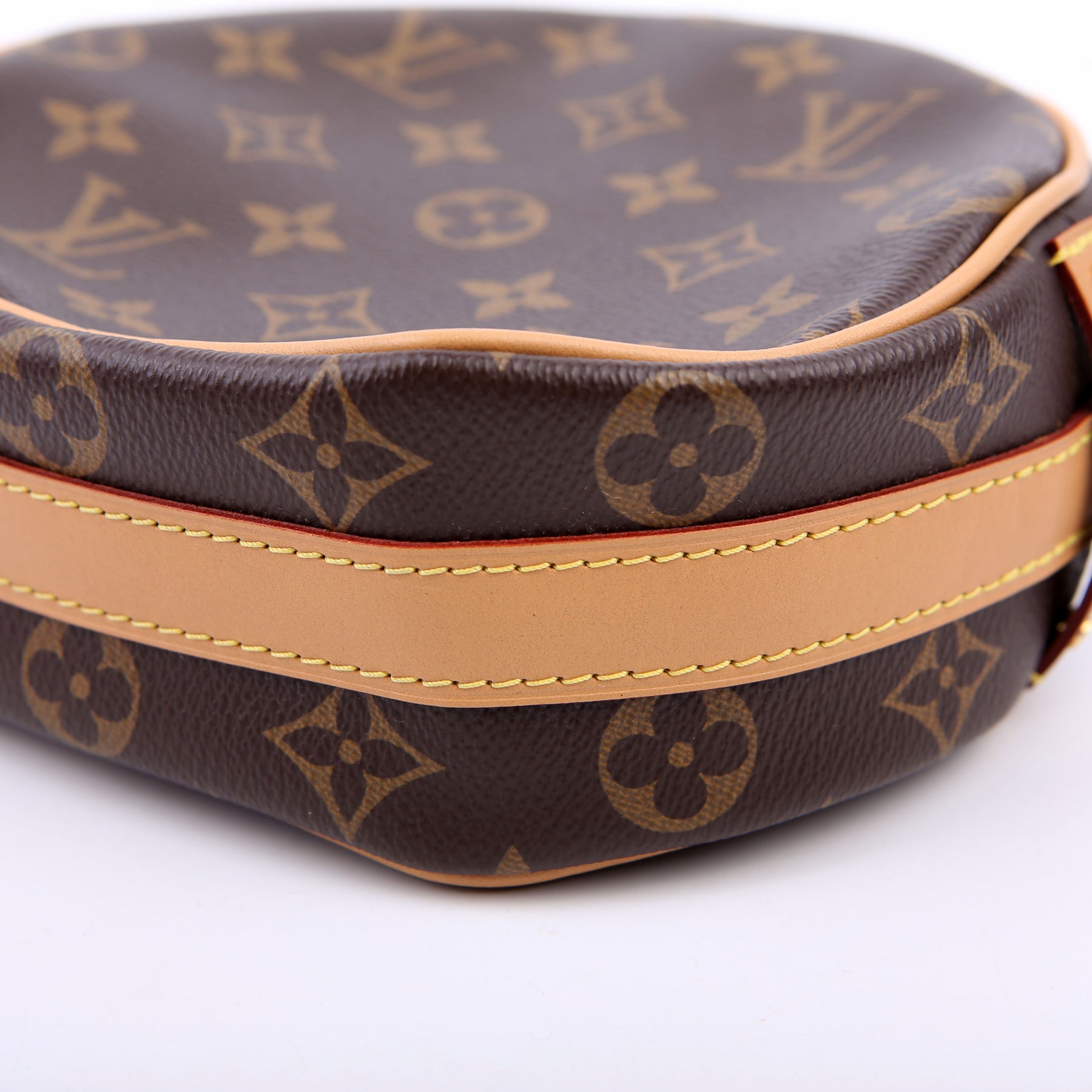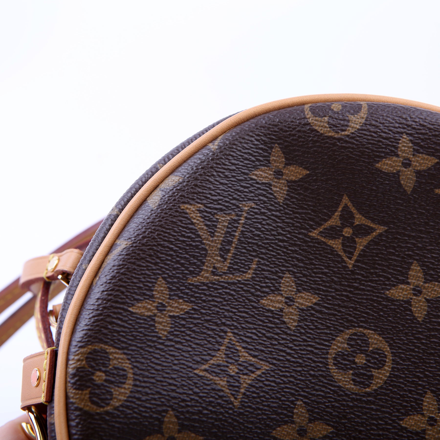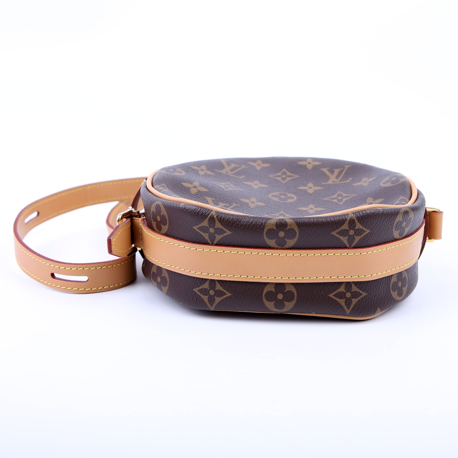 This pre-owned Louis Vuitton Boite Chapeau Souple PM is guaranteed 100% authentic. The exterior is in the classic Louis Vuitton Monogram coated canvas.