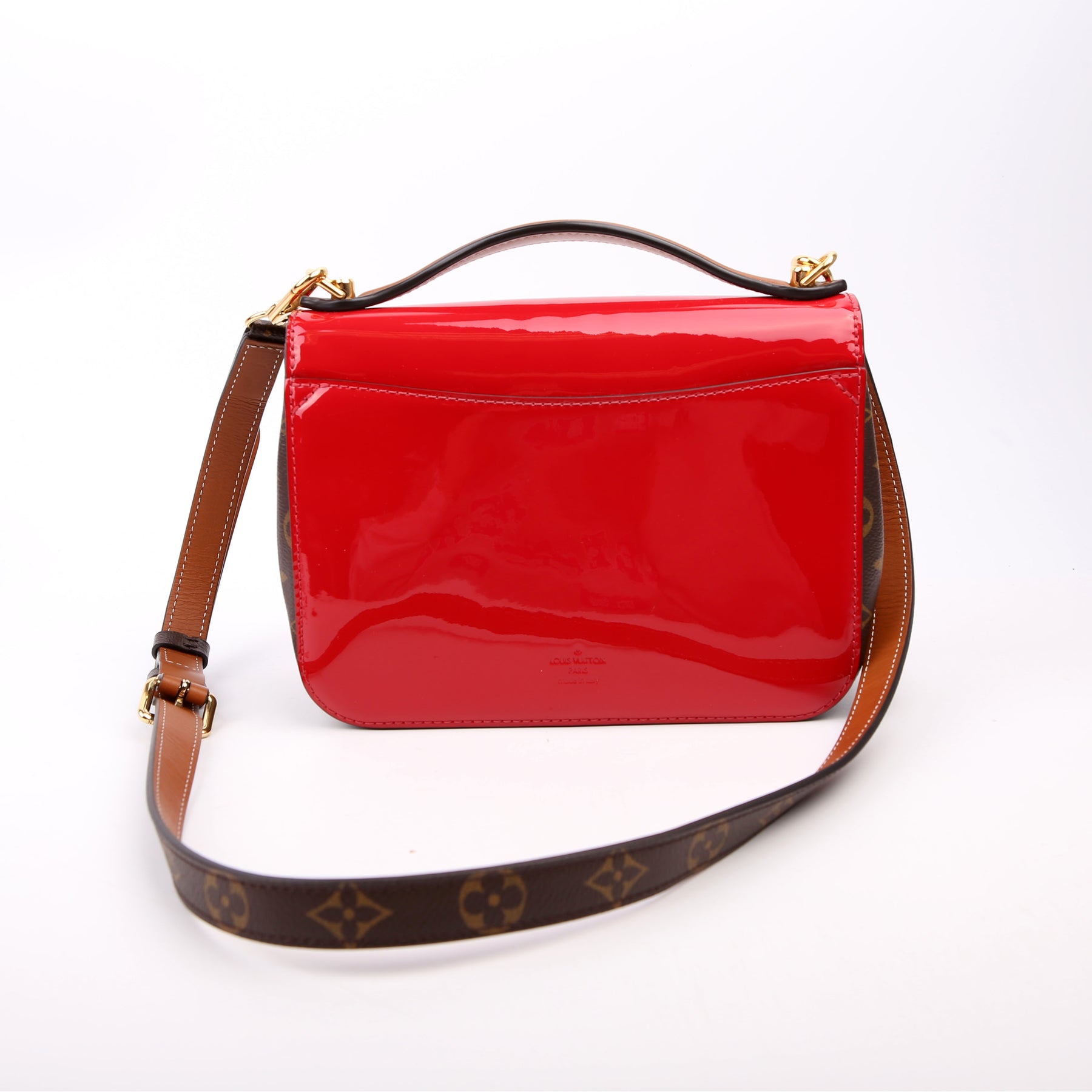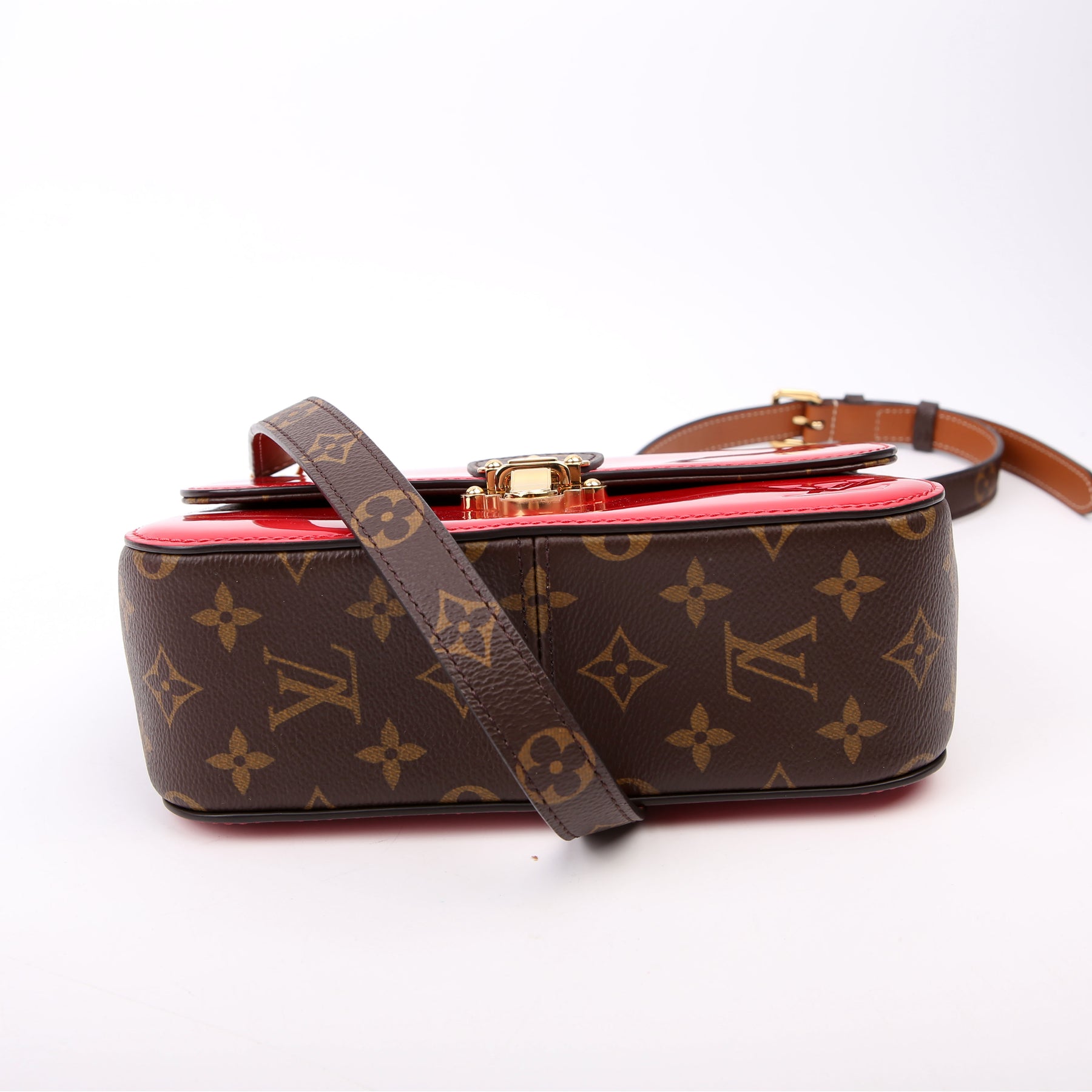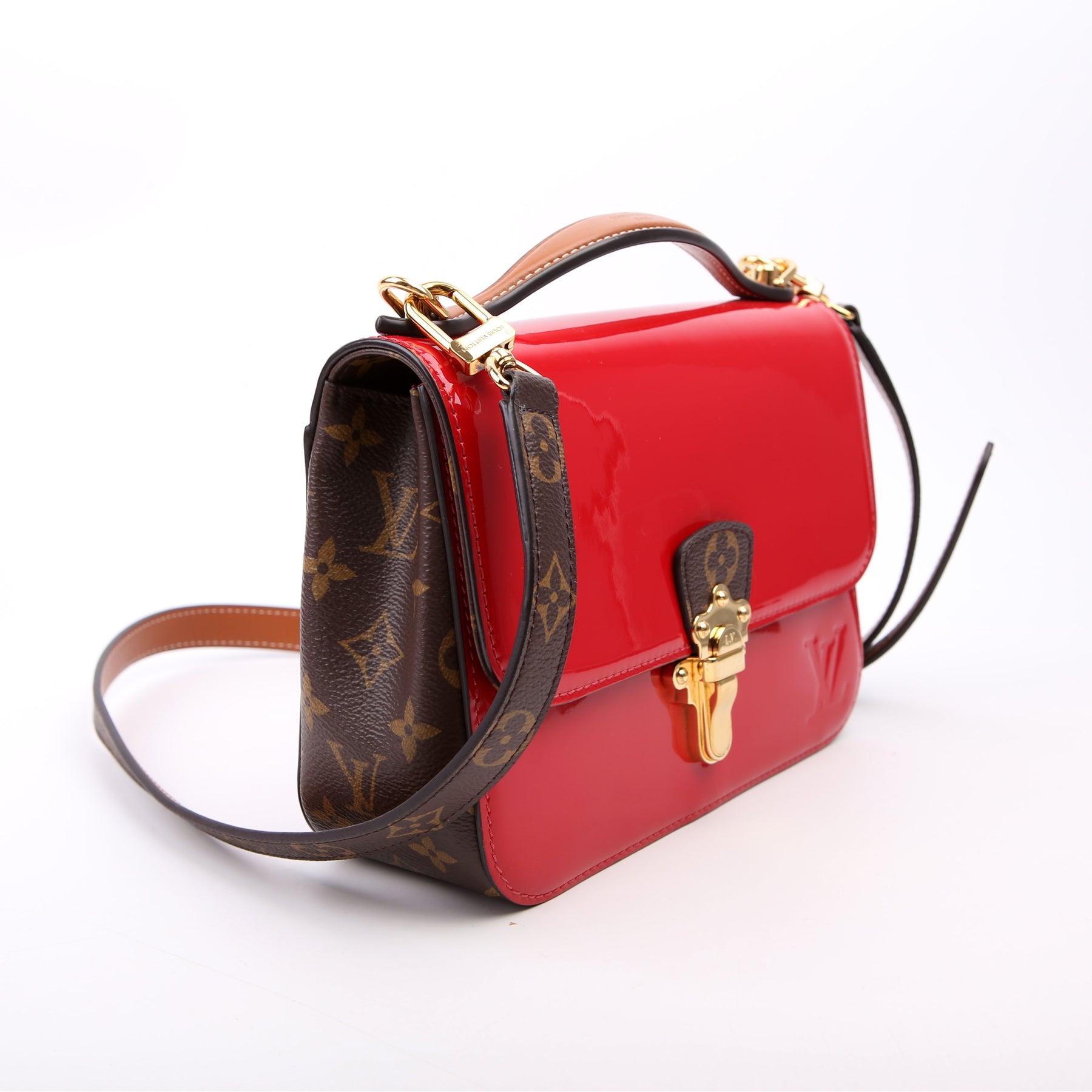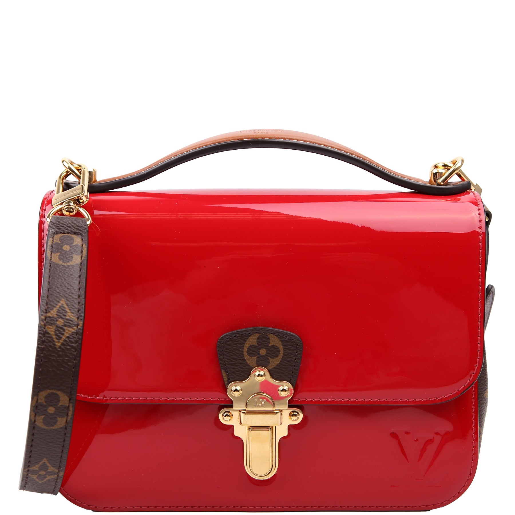 This pre-owned Louis Vuitton Cherrywood BB is guaranteed 100% authentic. The exterior is in the classic Louis Vuitton patent leather and monogram coated canvas.