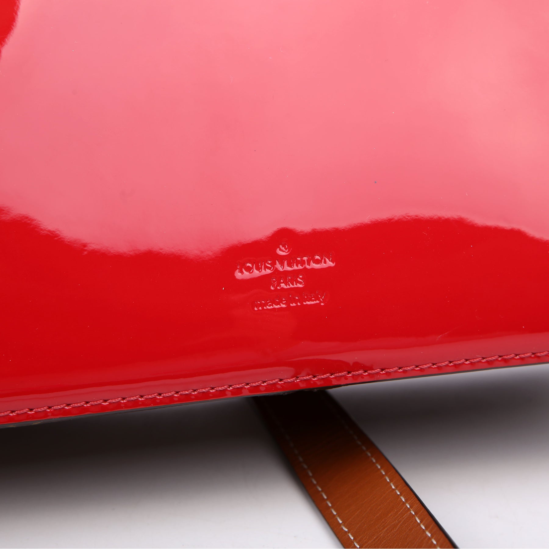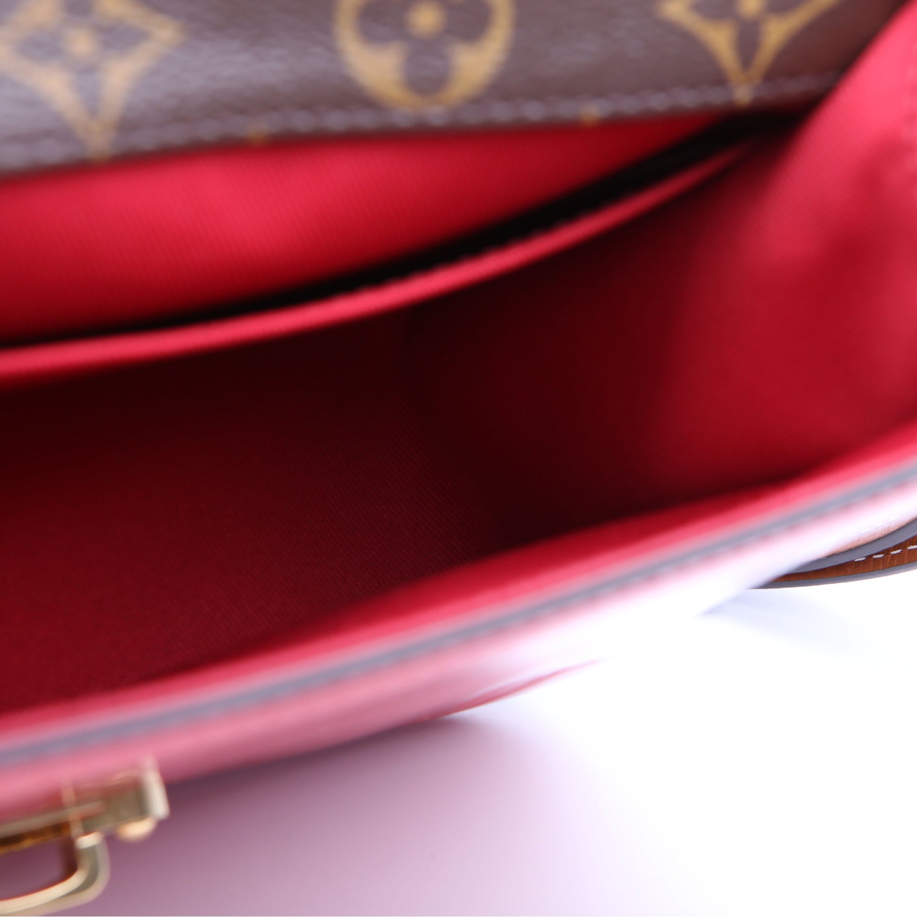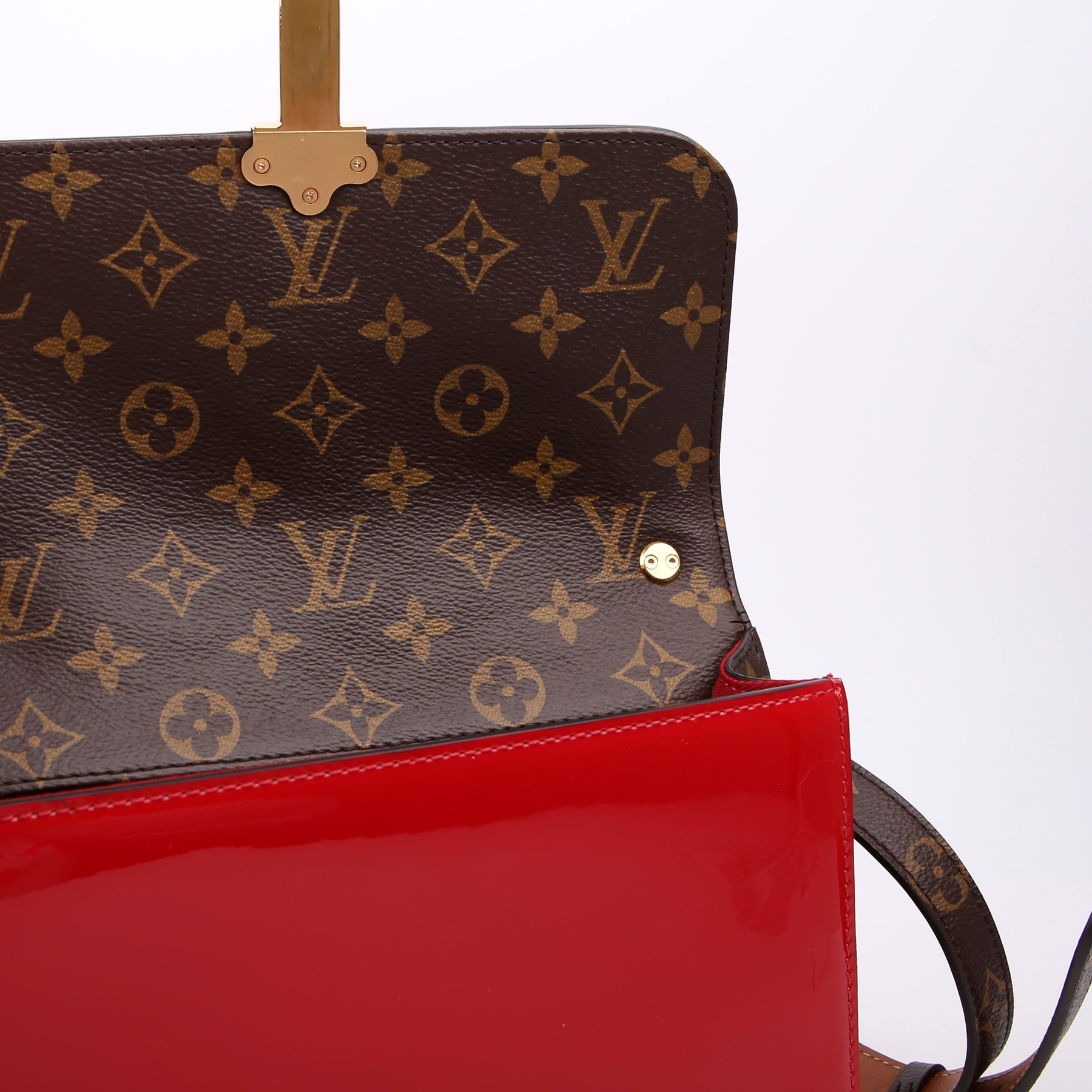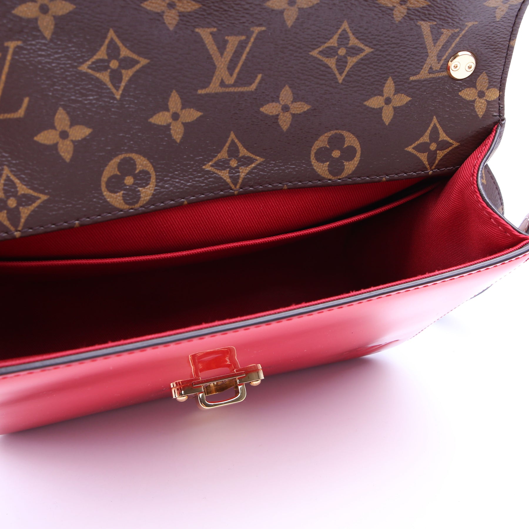This pre-owned Louis Vuitton Cherrywood BB is guaranteed 100% authentic. The exterior is in the classic Louis Vuitton patent leather and monogram coated canvas.