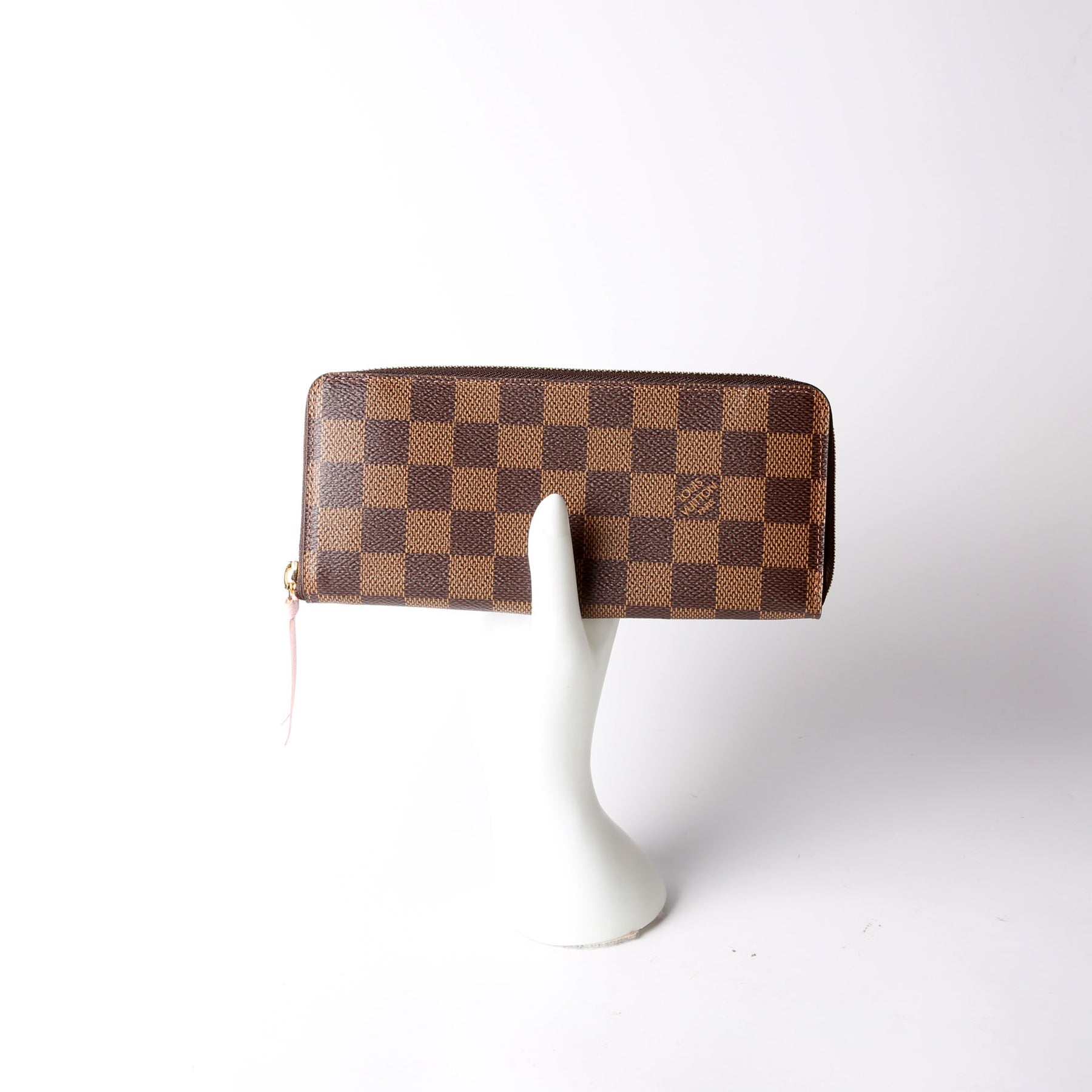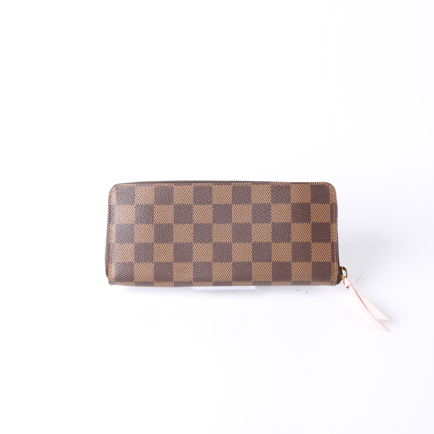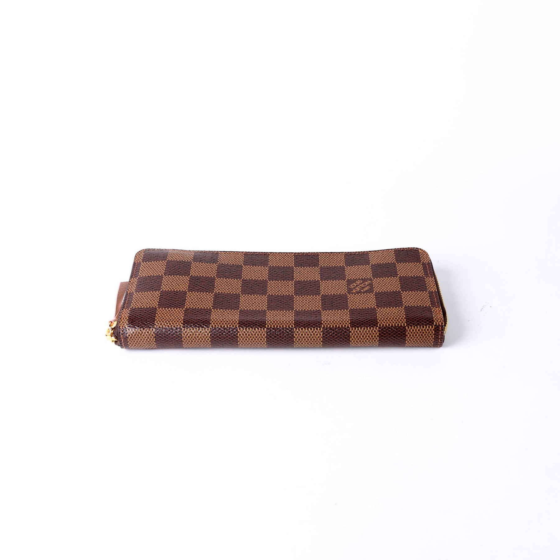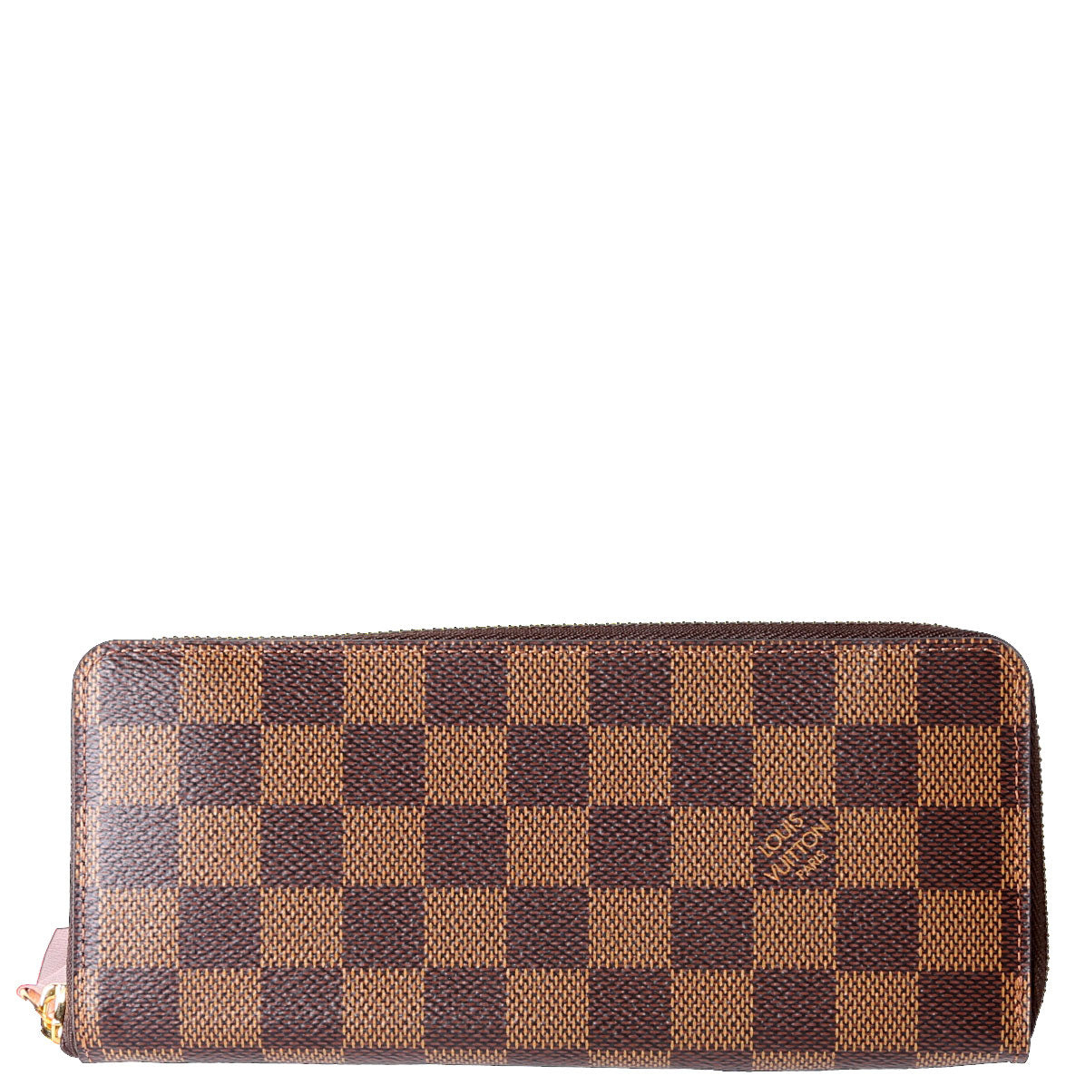 This pre-owned Louis Vuitton Clemence Wallet is guaranteed 100% authentic. The exterior is in the classic Louis Vuitton Damier Ebene coated canvas.