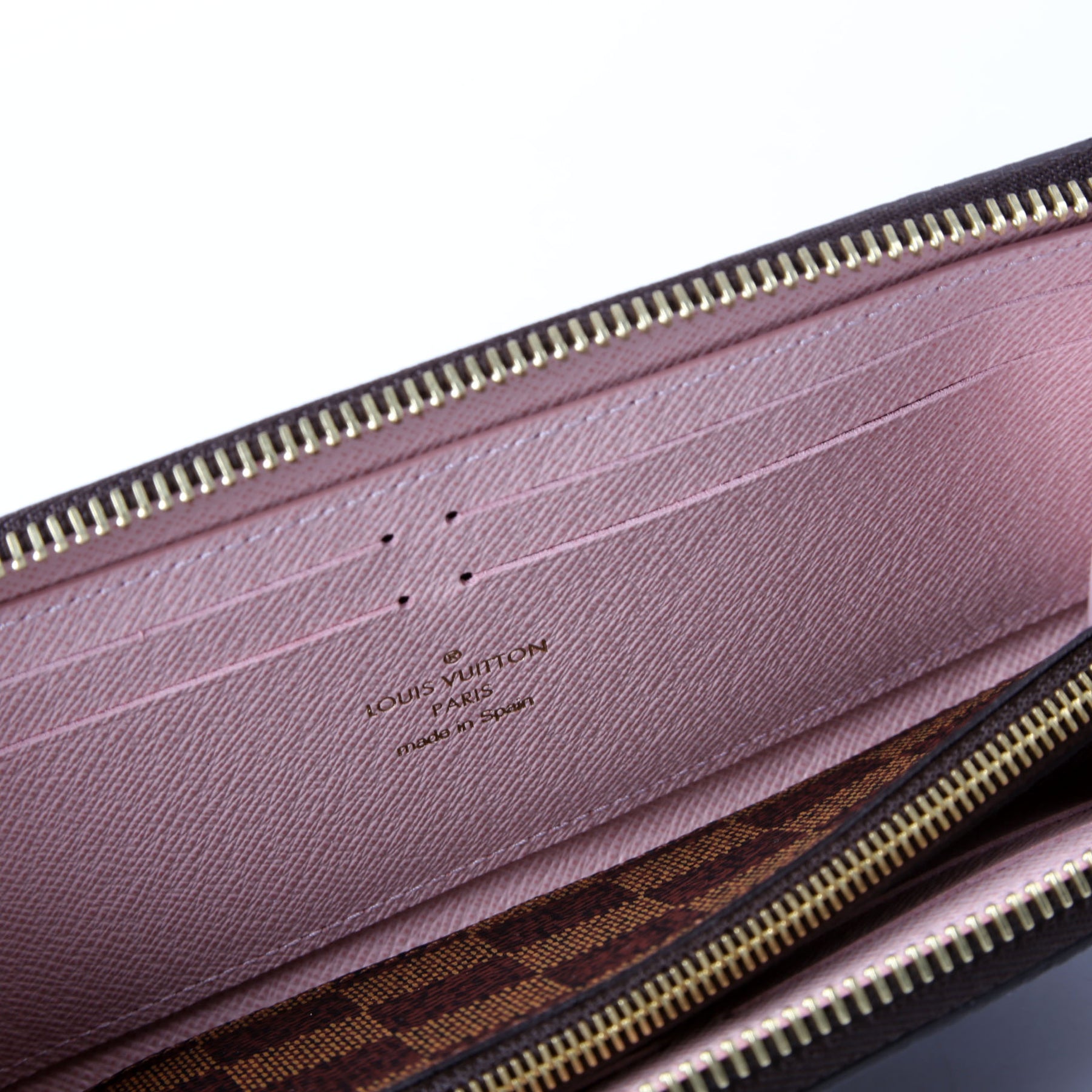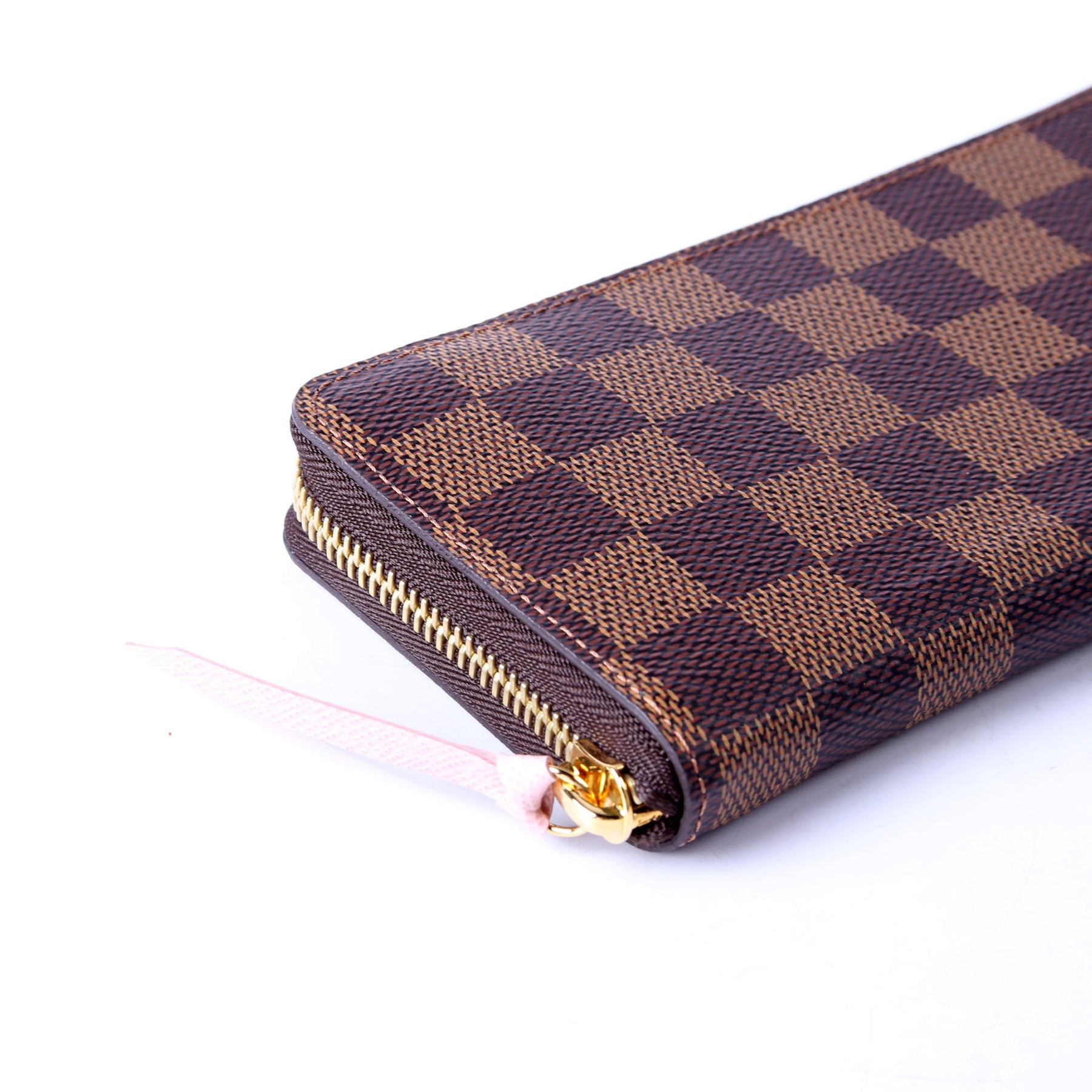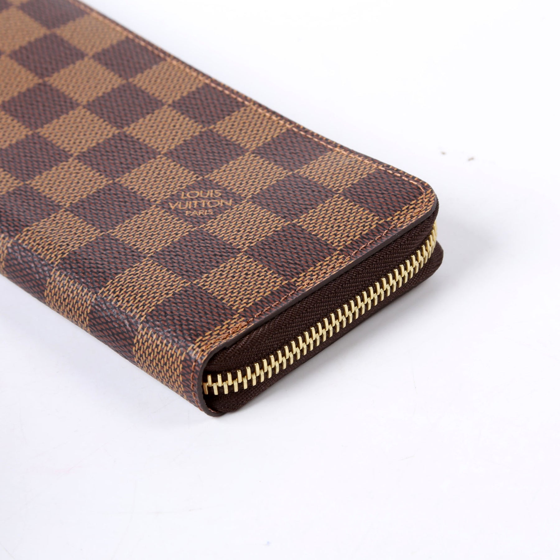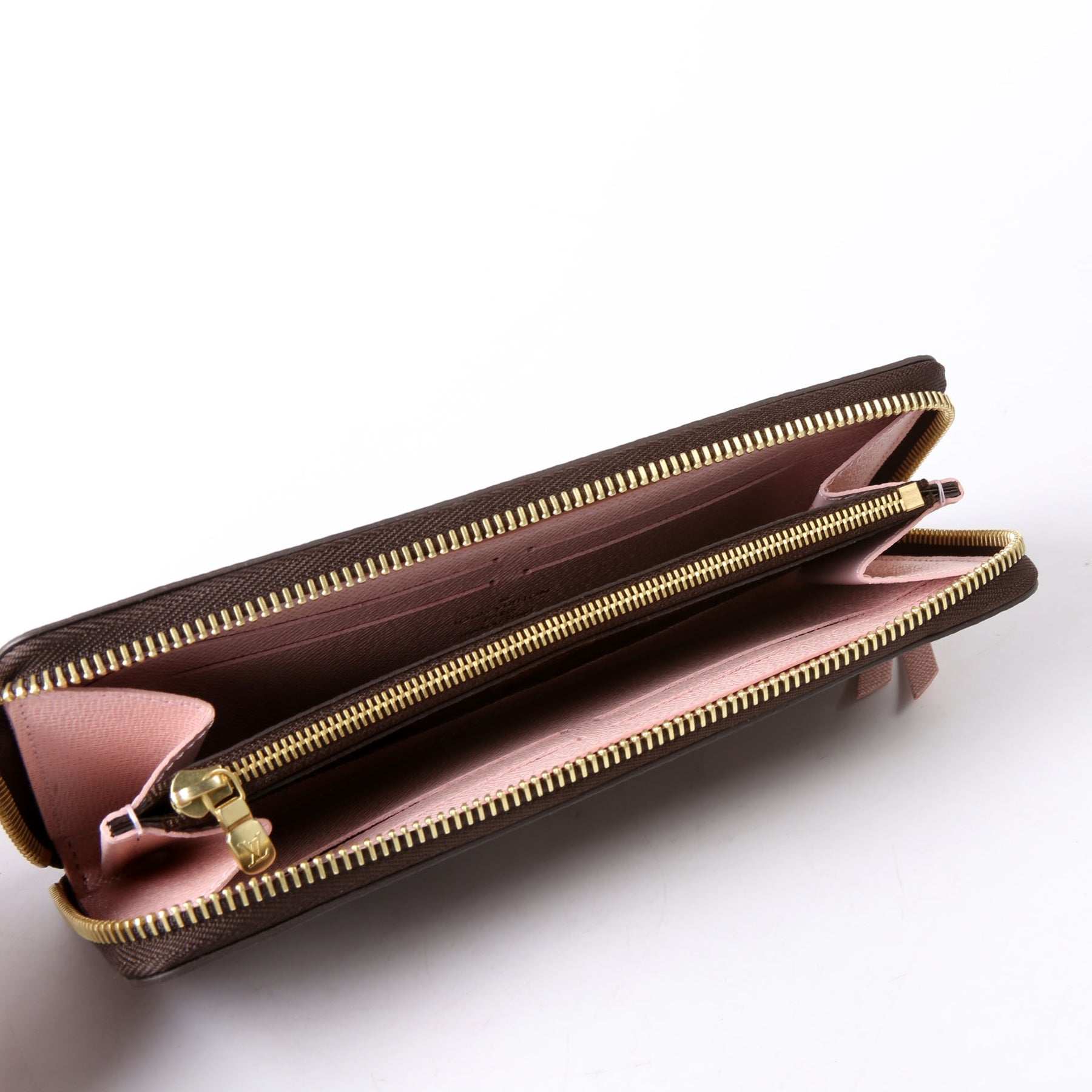 This pre-owned Louis Vuitton Clemence Wallet is guaranteed 100% authentic. The exterior is in the classic Louis Vuitton Damier Ebene coated canvas.