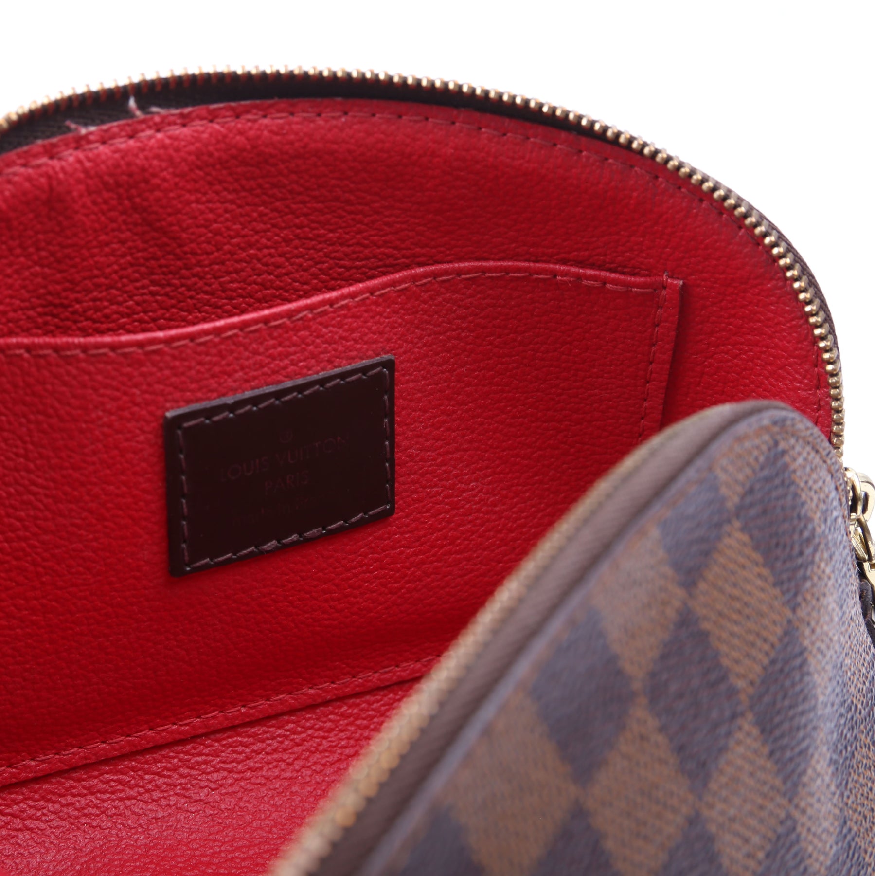 This pre-owned Louis Vuitton Cosmetic Pouch PM is guaranteed 100% authentic. The exterior is in the classic Louis Vuitton Damier Ebene coated canvas.