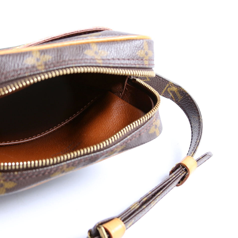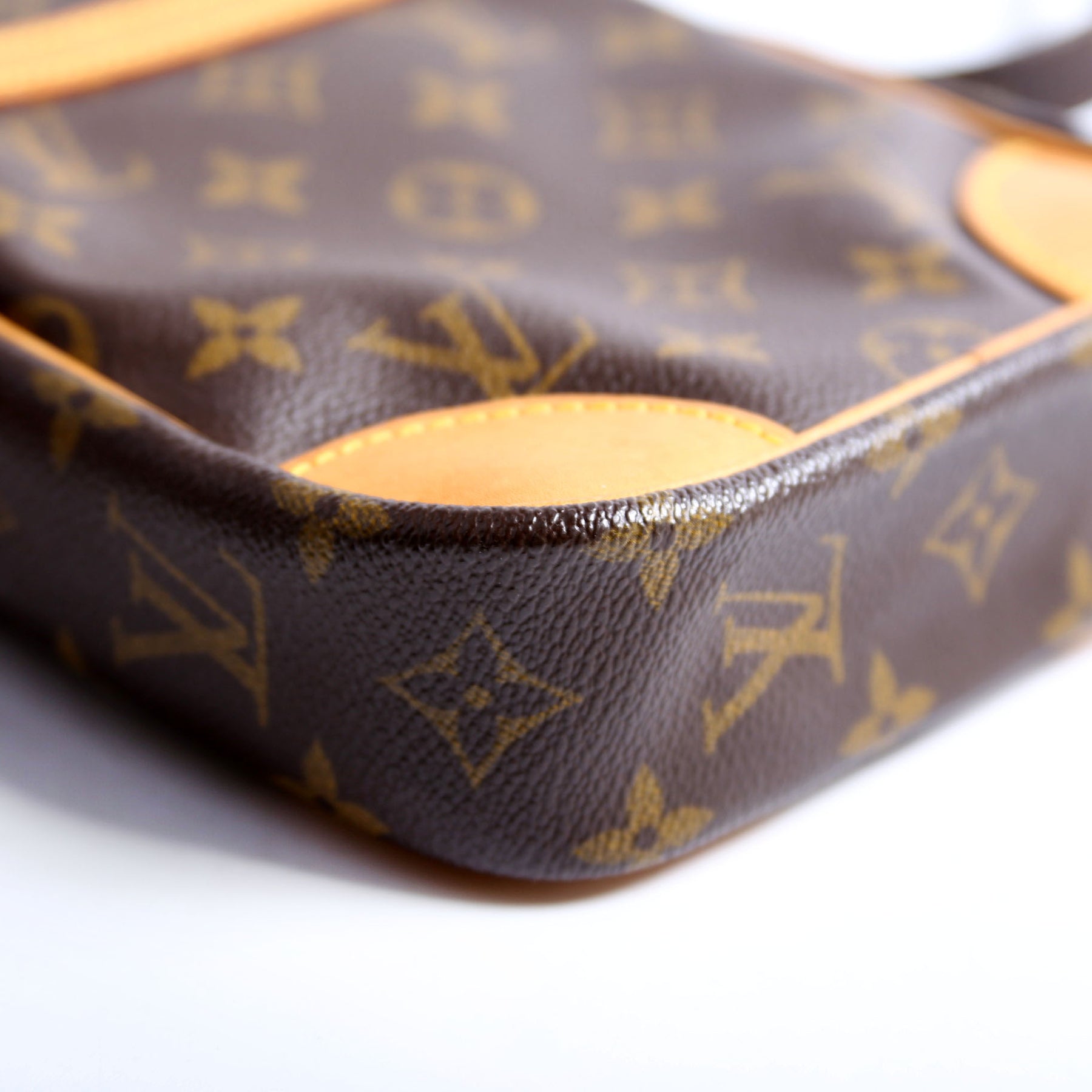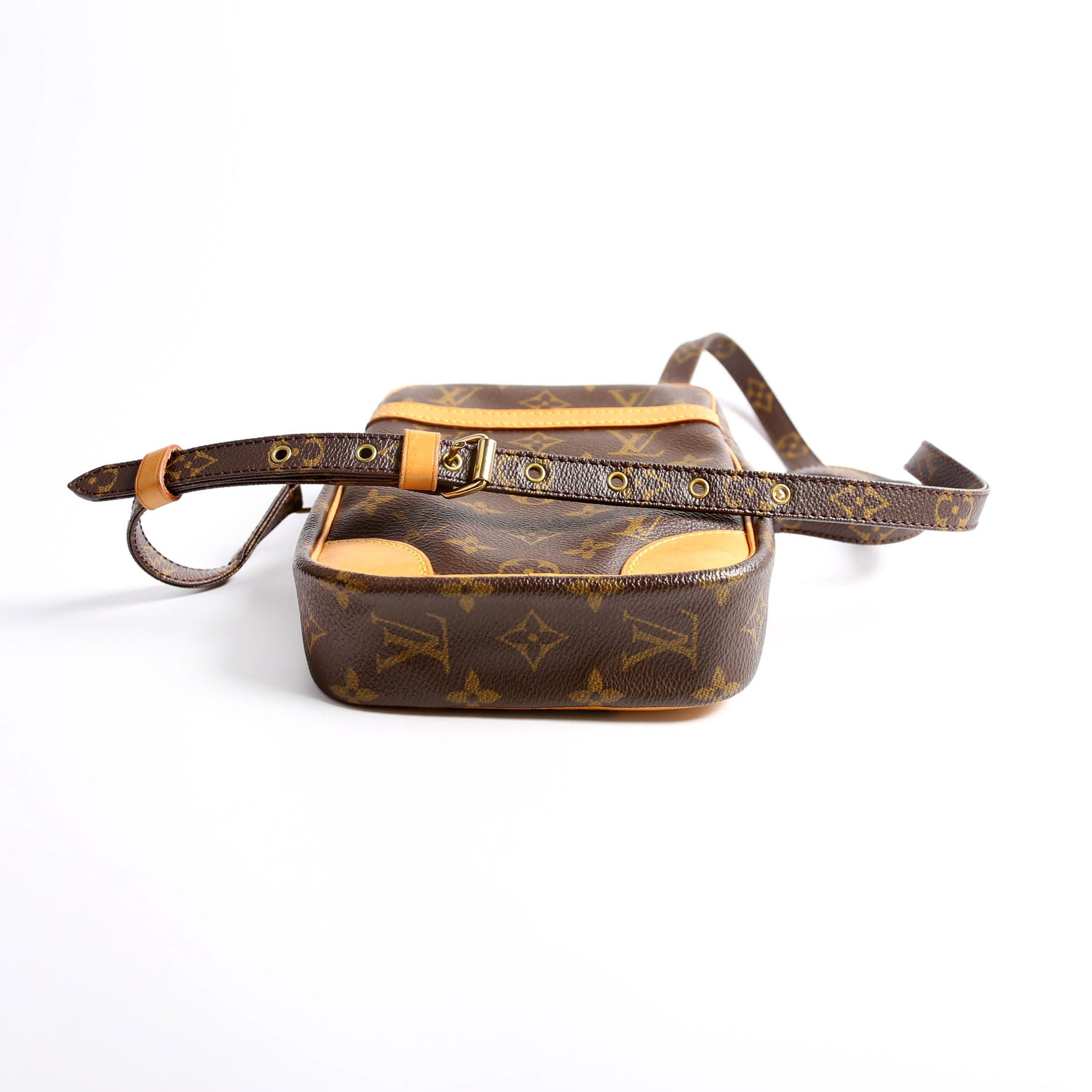This pre-owned Louis Vuitton Danube is guaranteed 100% authentic. The exterior is in the classic Louis Vuitton Monogram Coated Canvas.