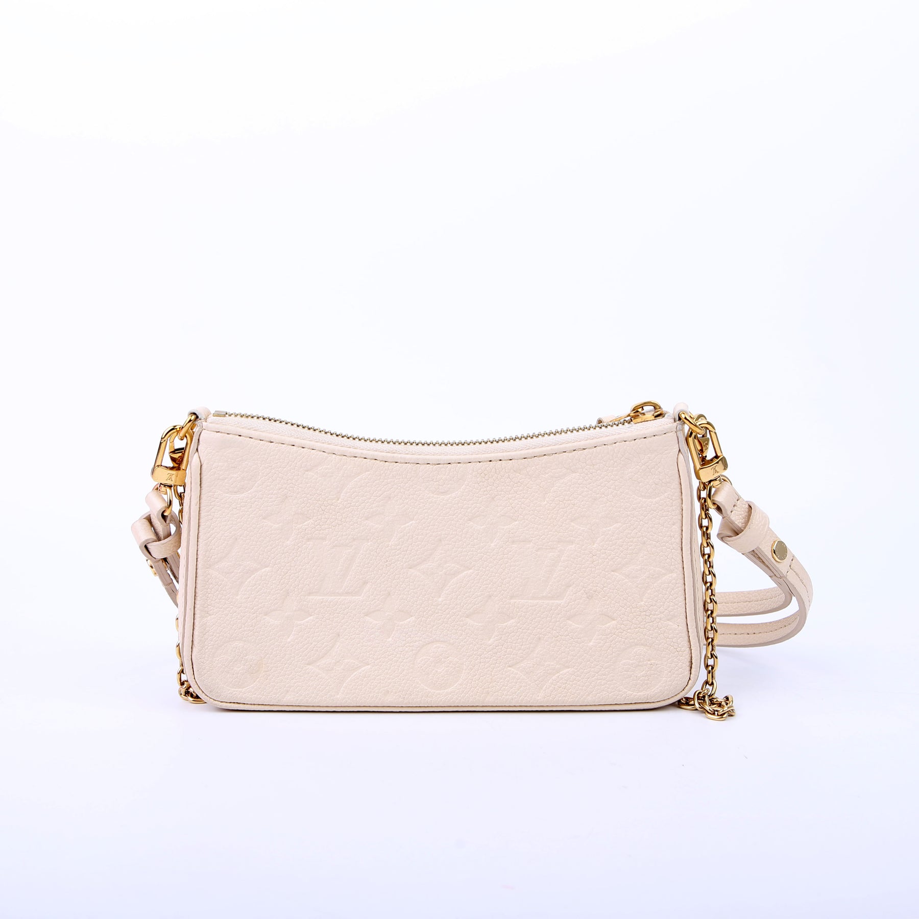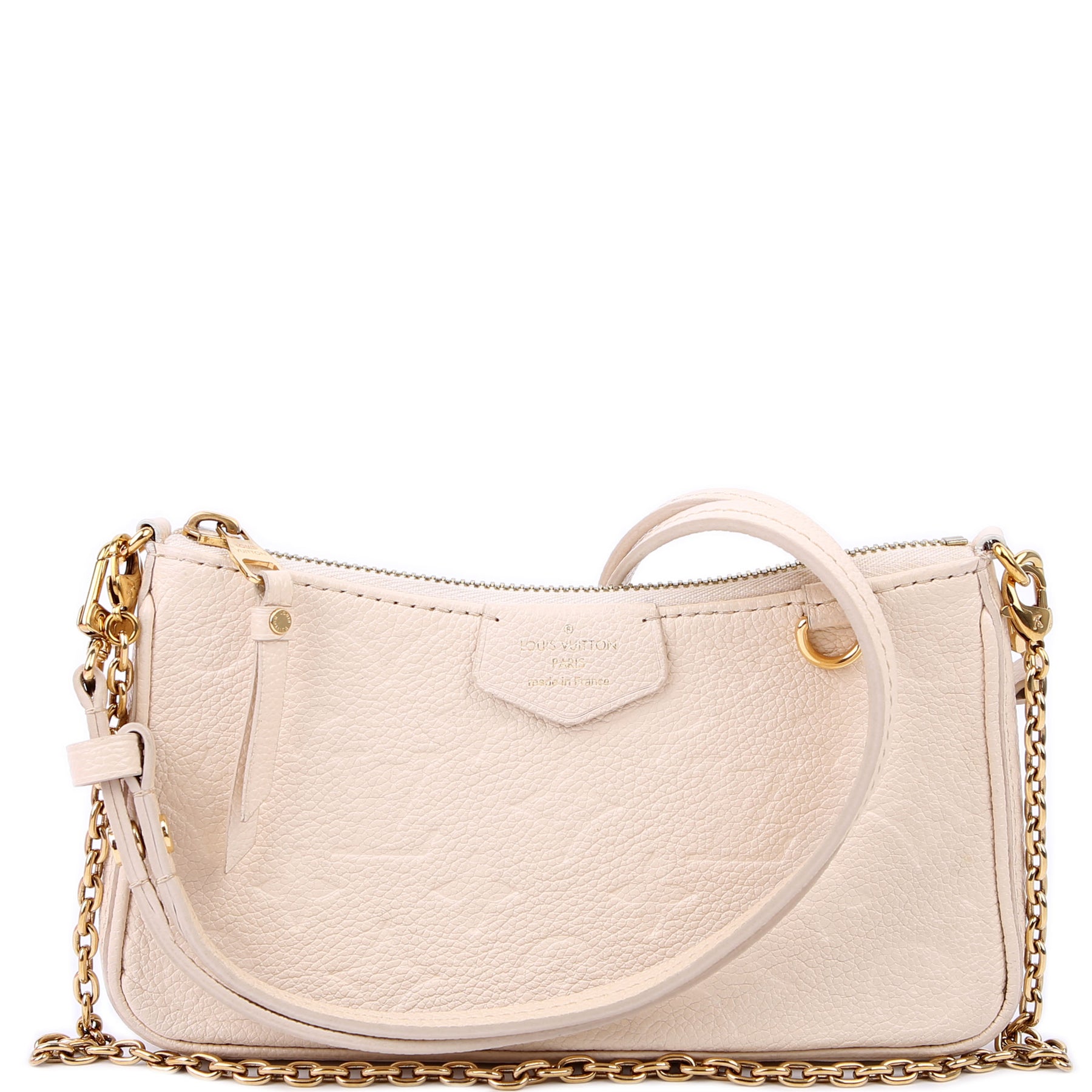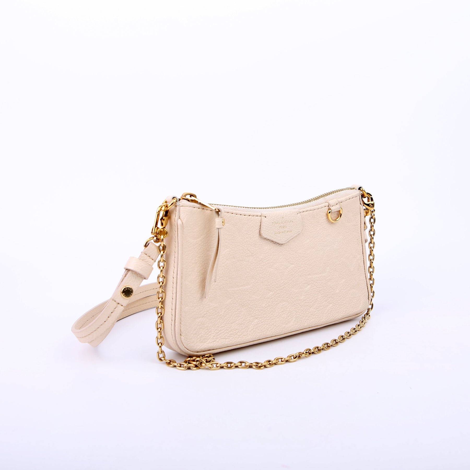 This pre-owned Louis Vuitton Easy Pouch On Strap is guaranteed 100% authentic. The exterior is in the classic Louis Vuitton Empreinte Leather.