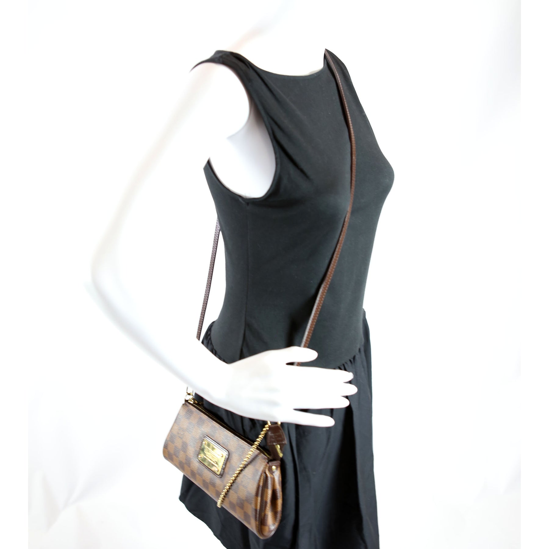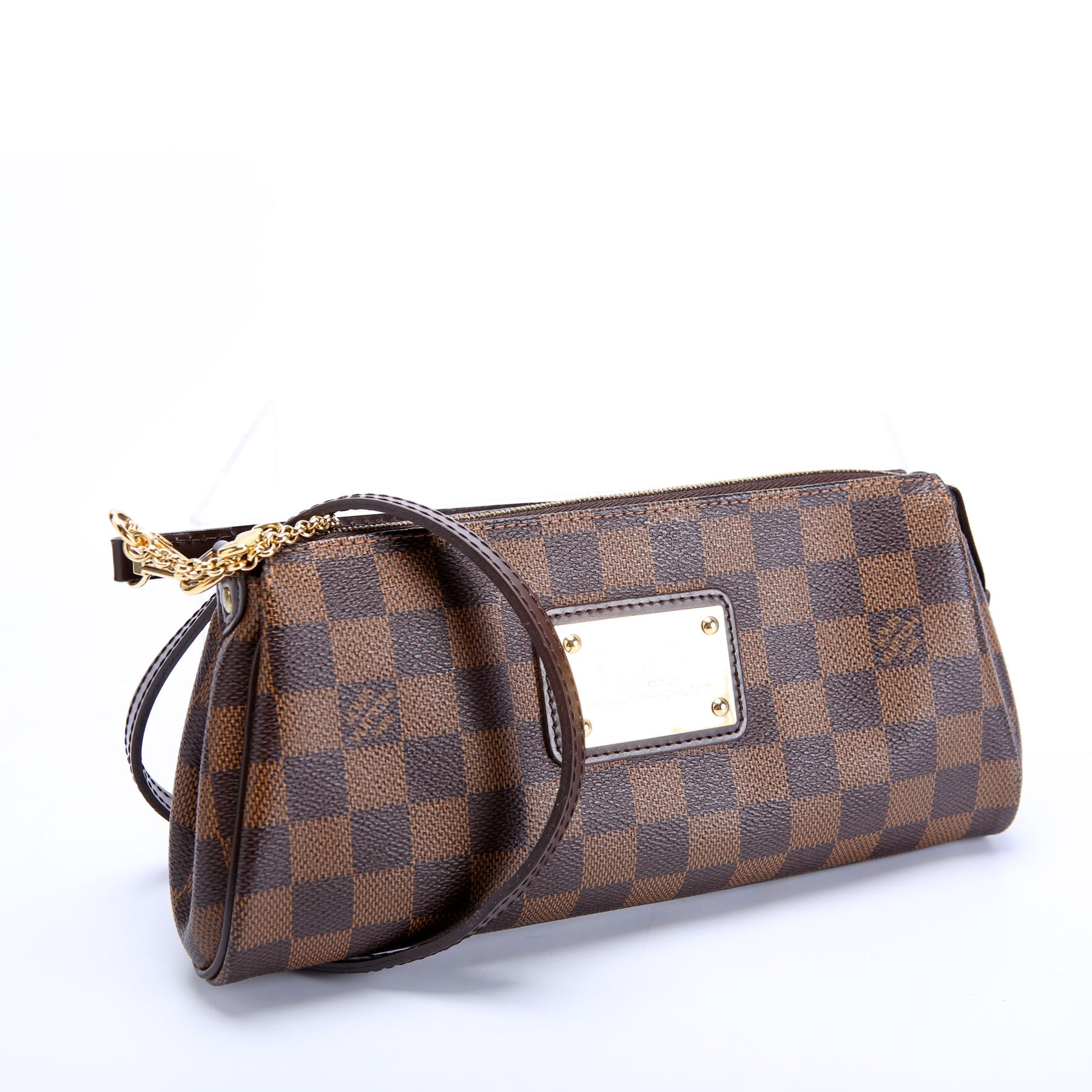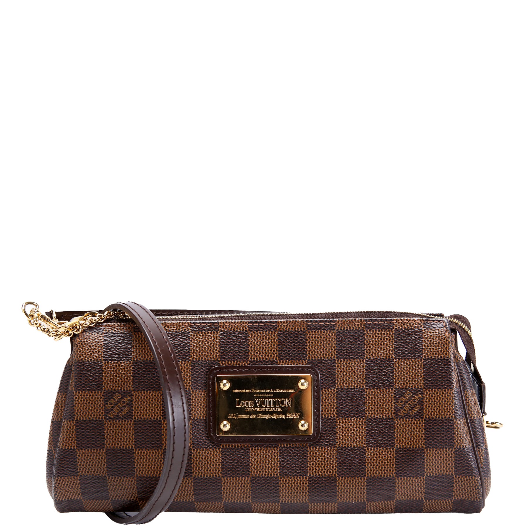 This pre-owned Louis Vuitton Eva Clutch is guaranteed 100% authentic. The exterior is in the classic Louis Vuitton coated canvas.