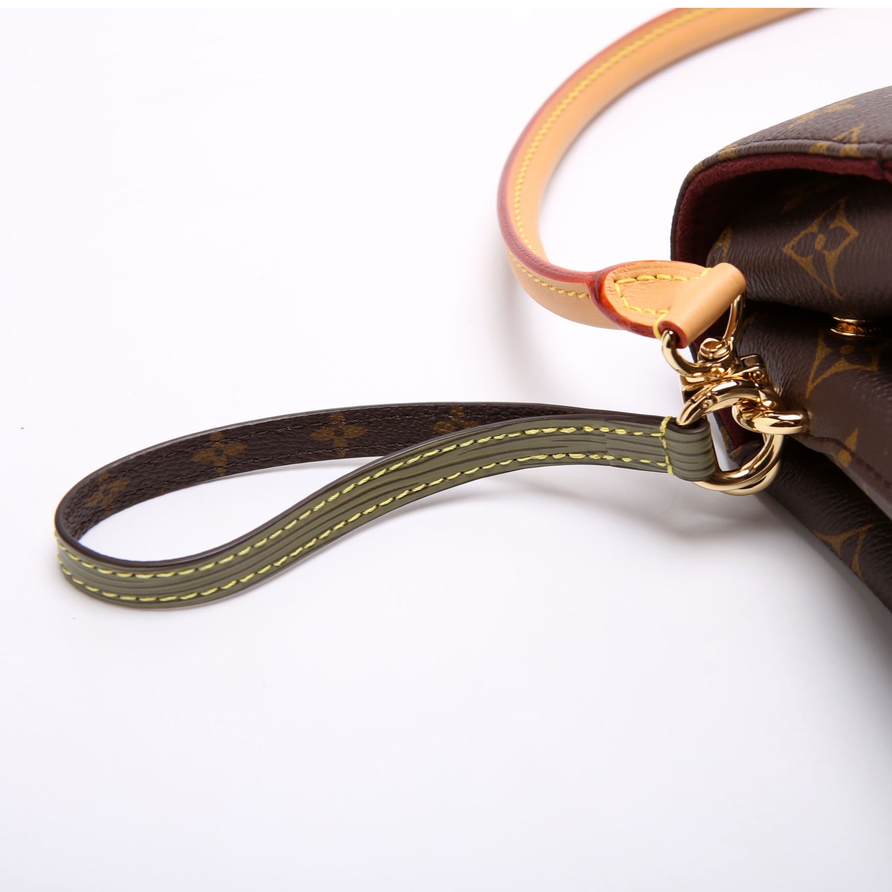 Exterior: The exterior coated canvas and leather is free from wear. The exterior feature wristlet accessory.