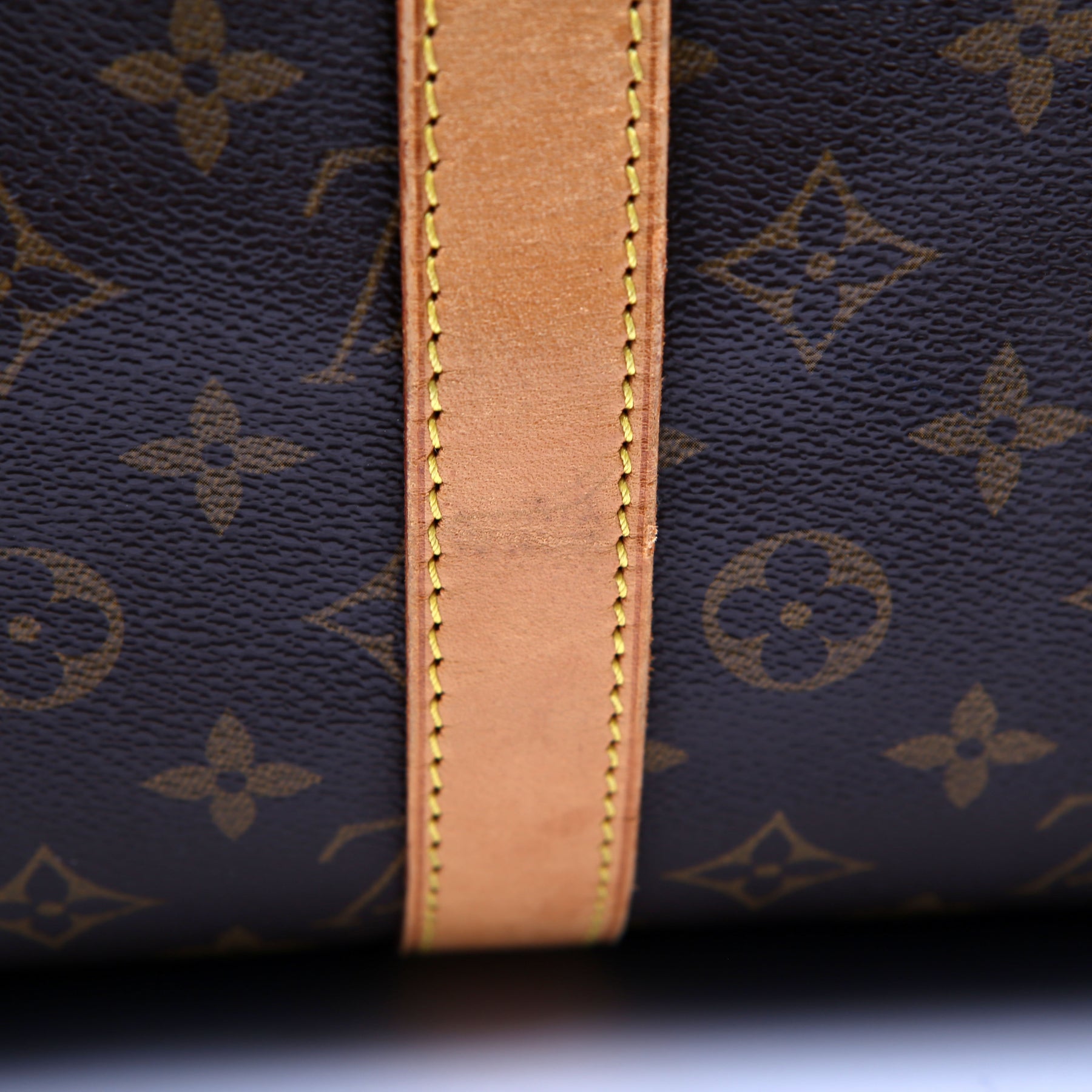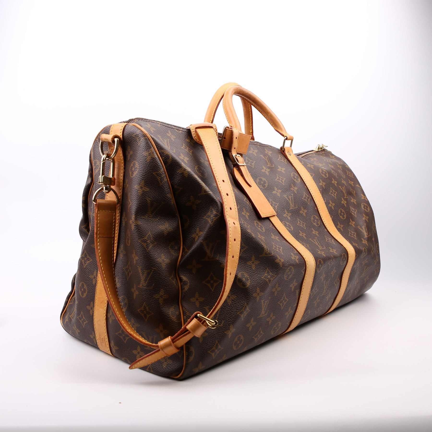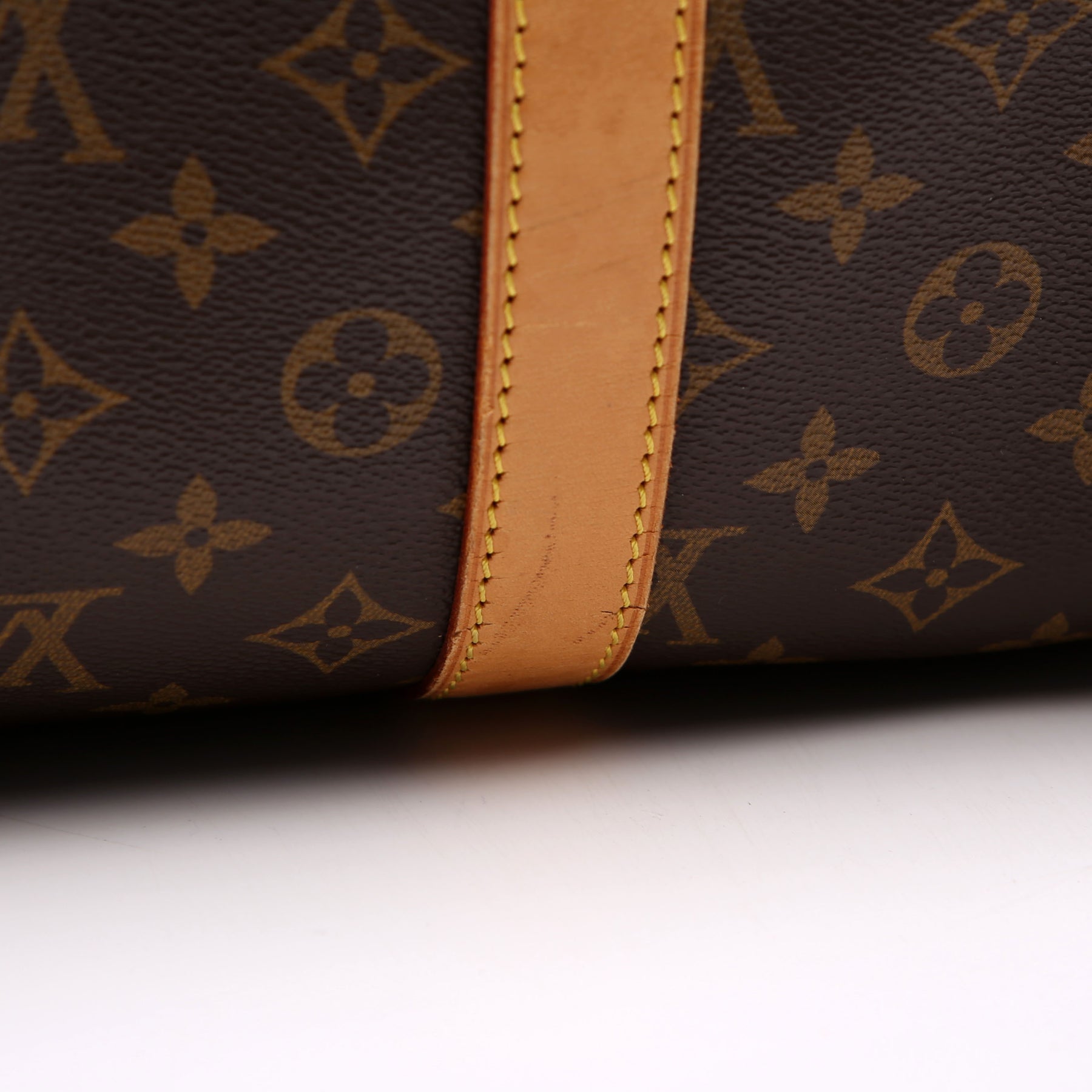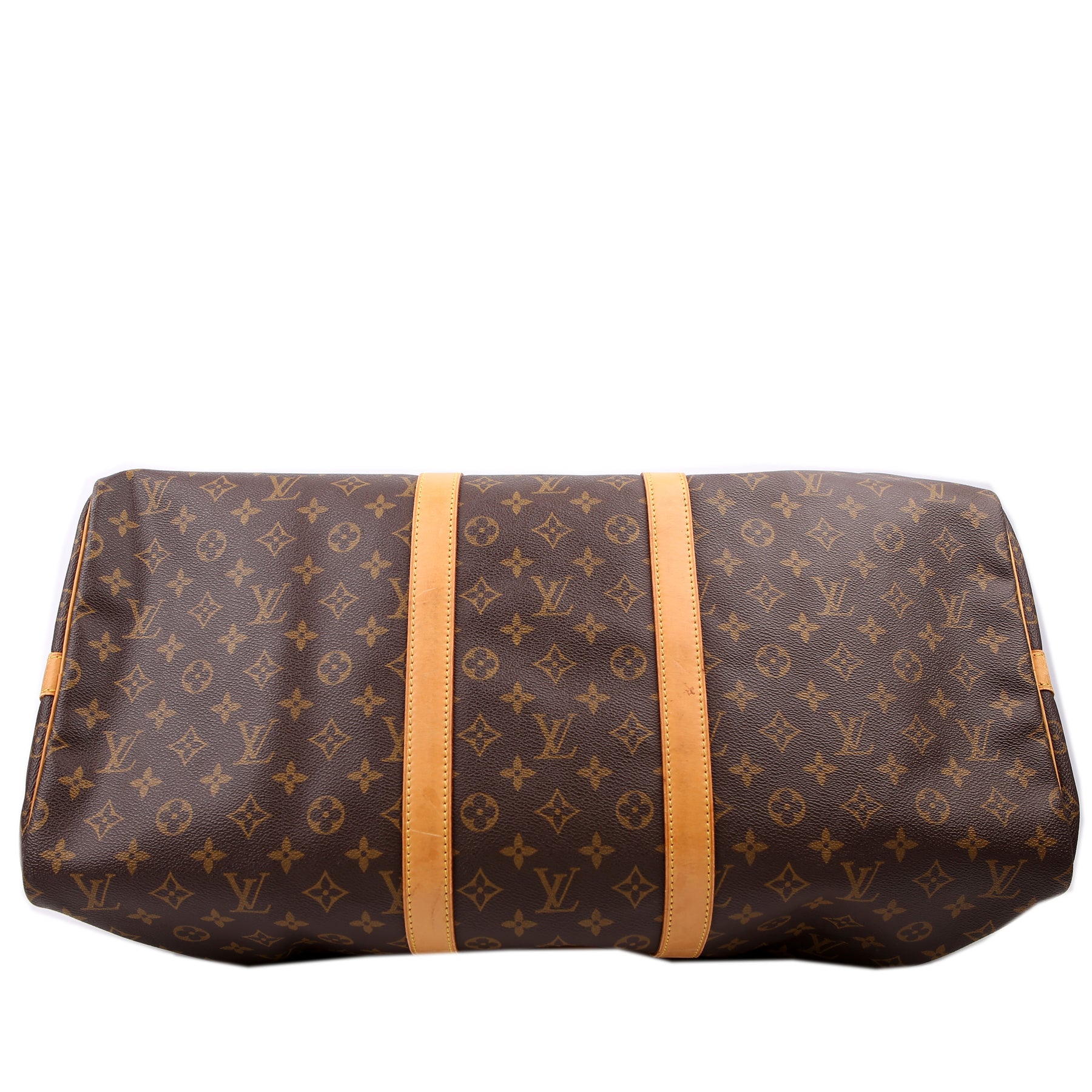 This pre-owned Louis Vuitton Keepall 55 Bandouliere is guaranteed 100% authentic. The exterior is in the classic Louis Vuitton Monogram coated canvas.