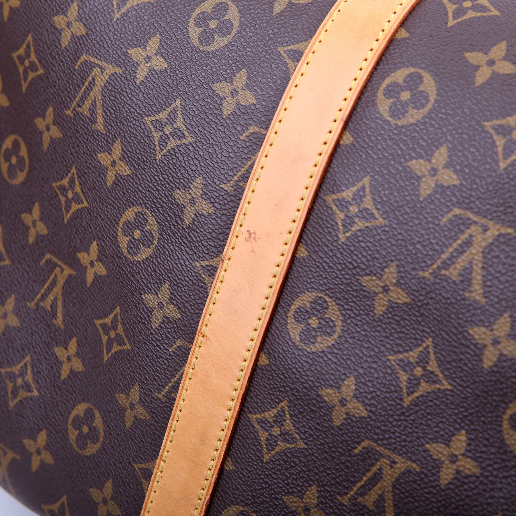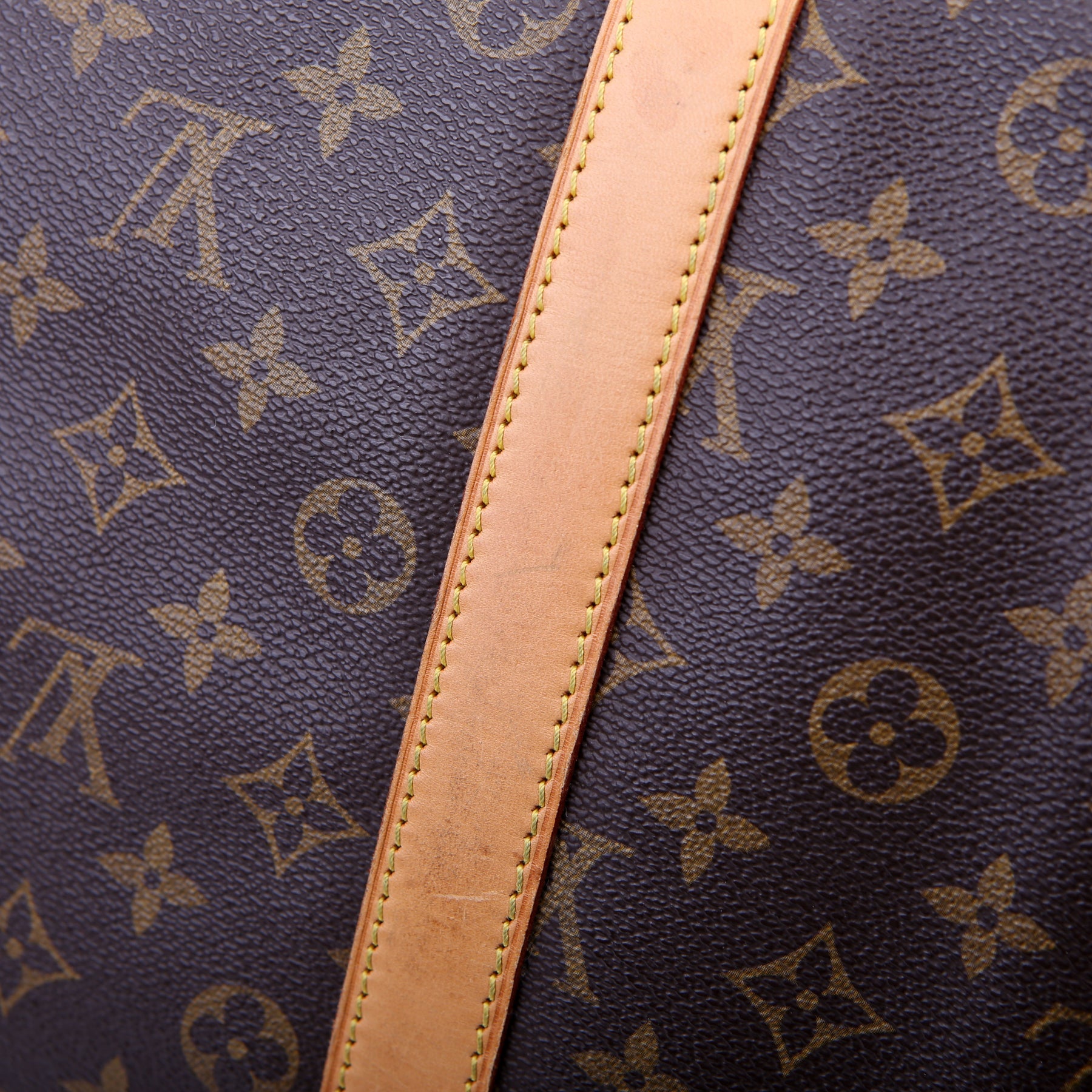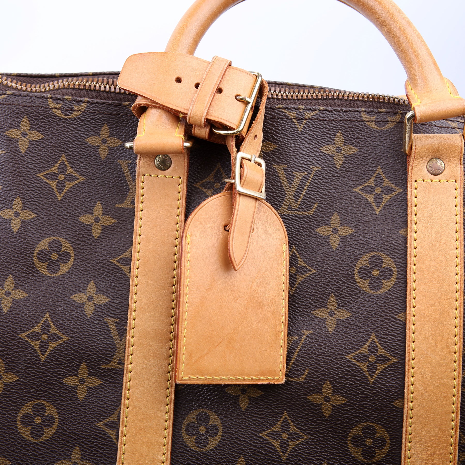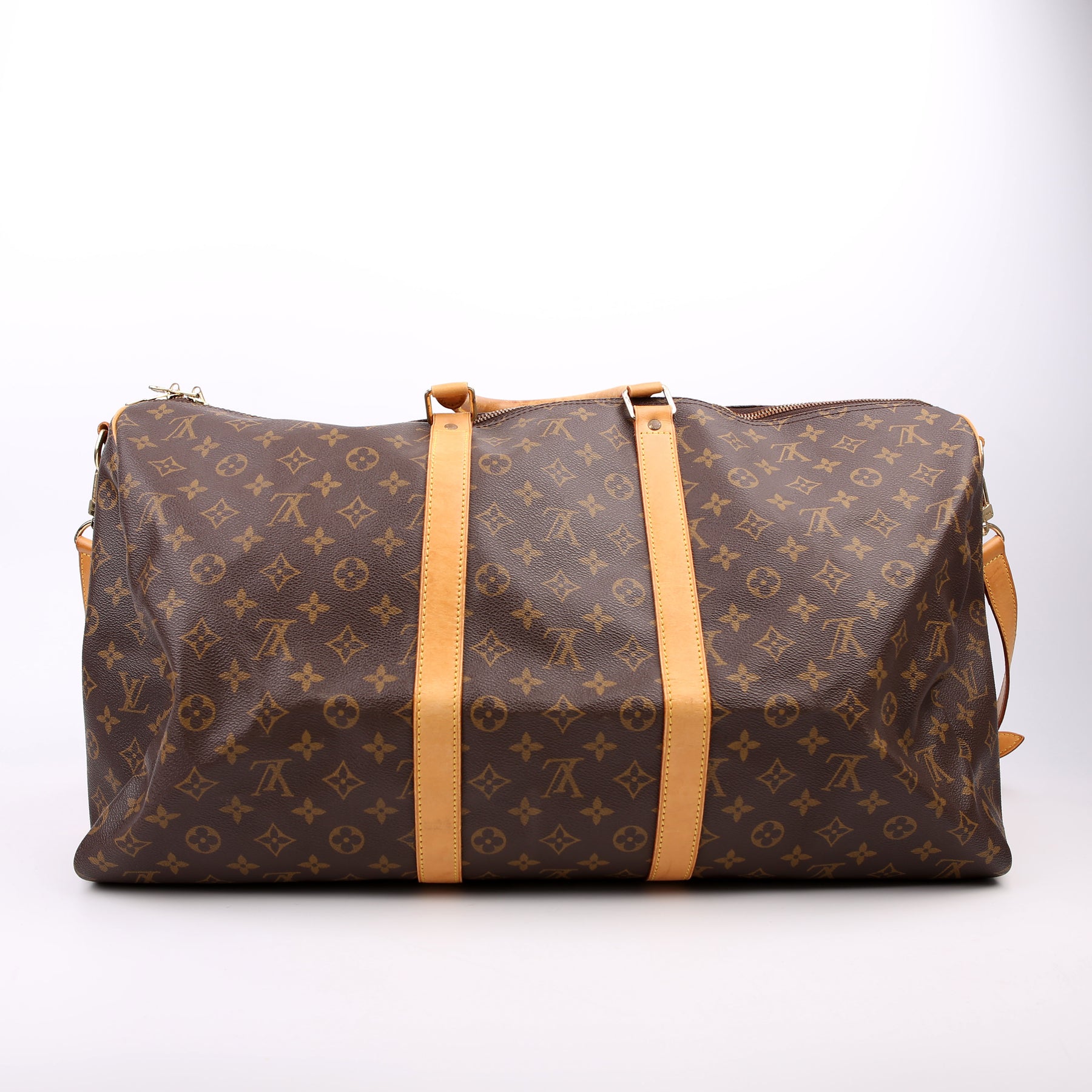 This pre-owned Louis Vuitton Keepall 55 Bandouliere is guaranteed 100% authentic. The exterior is in the classic Louis Vuitton Monogram coated canvas.