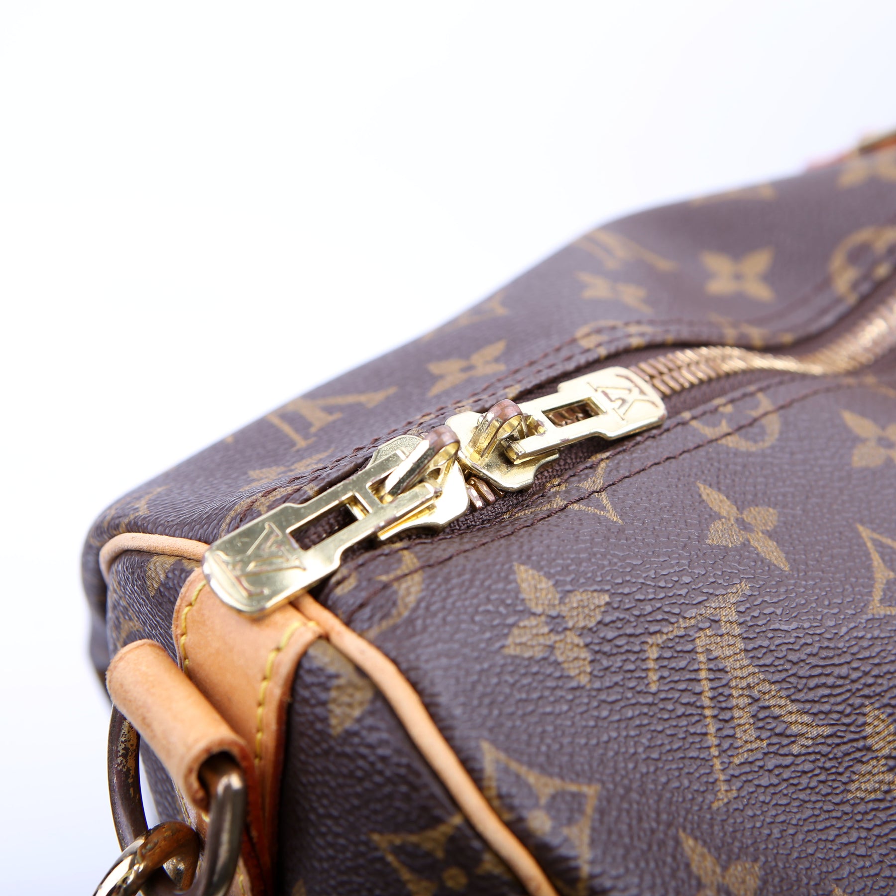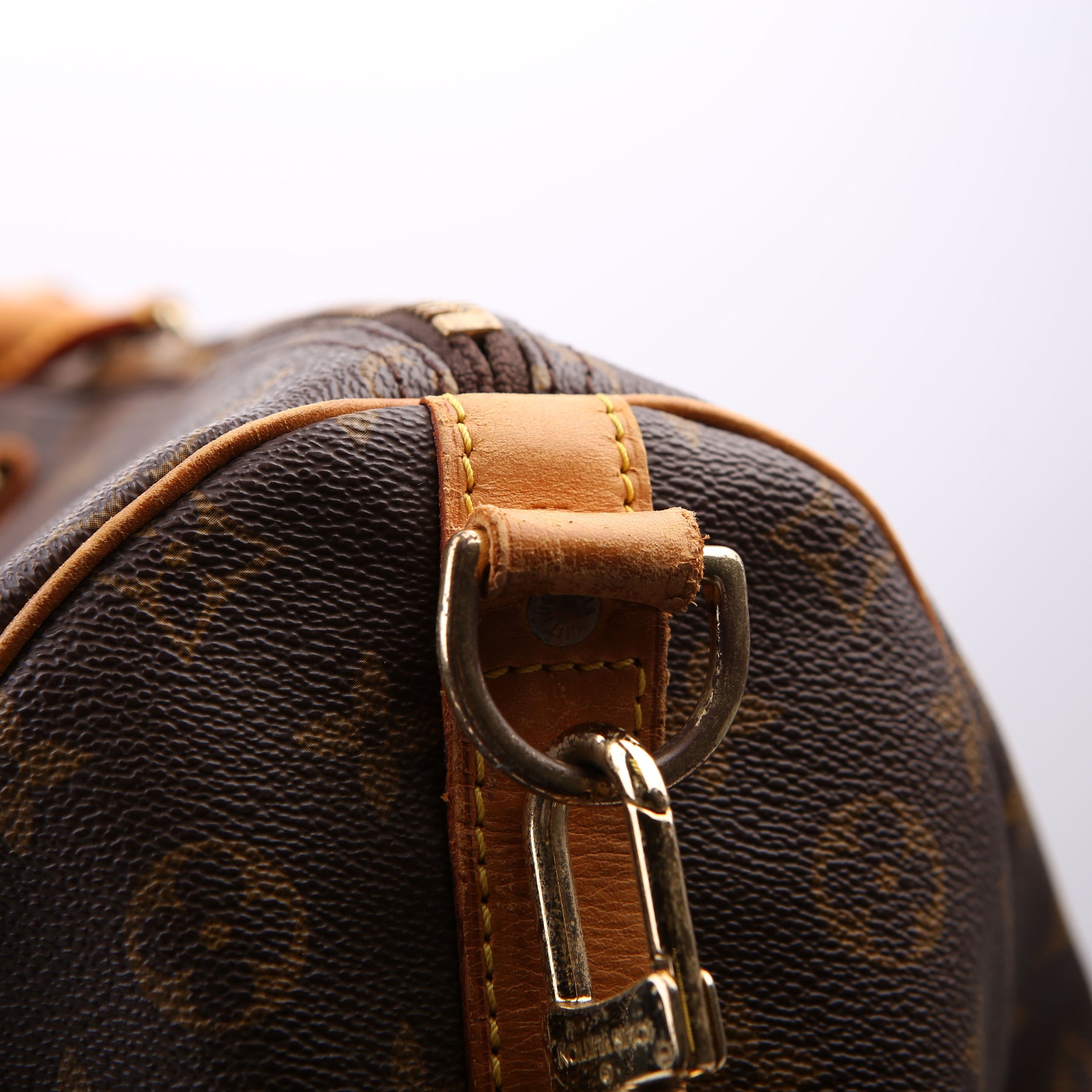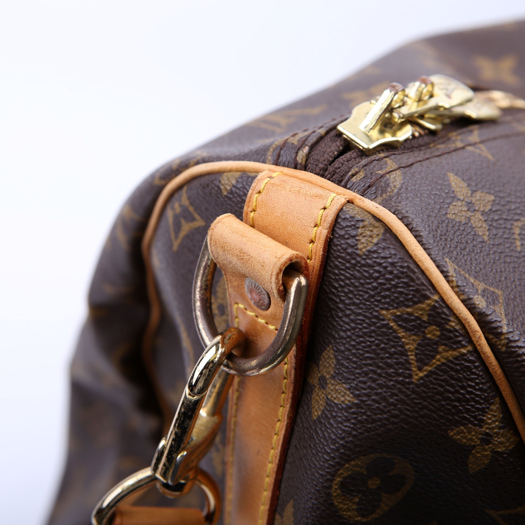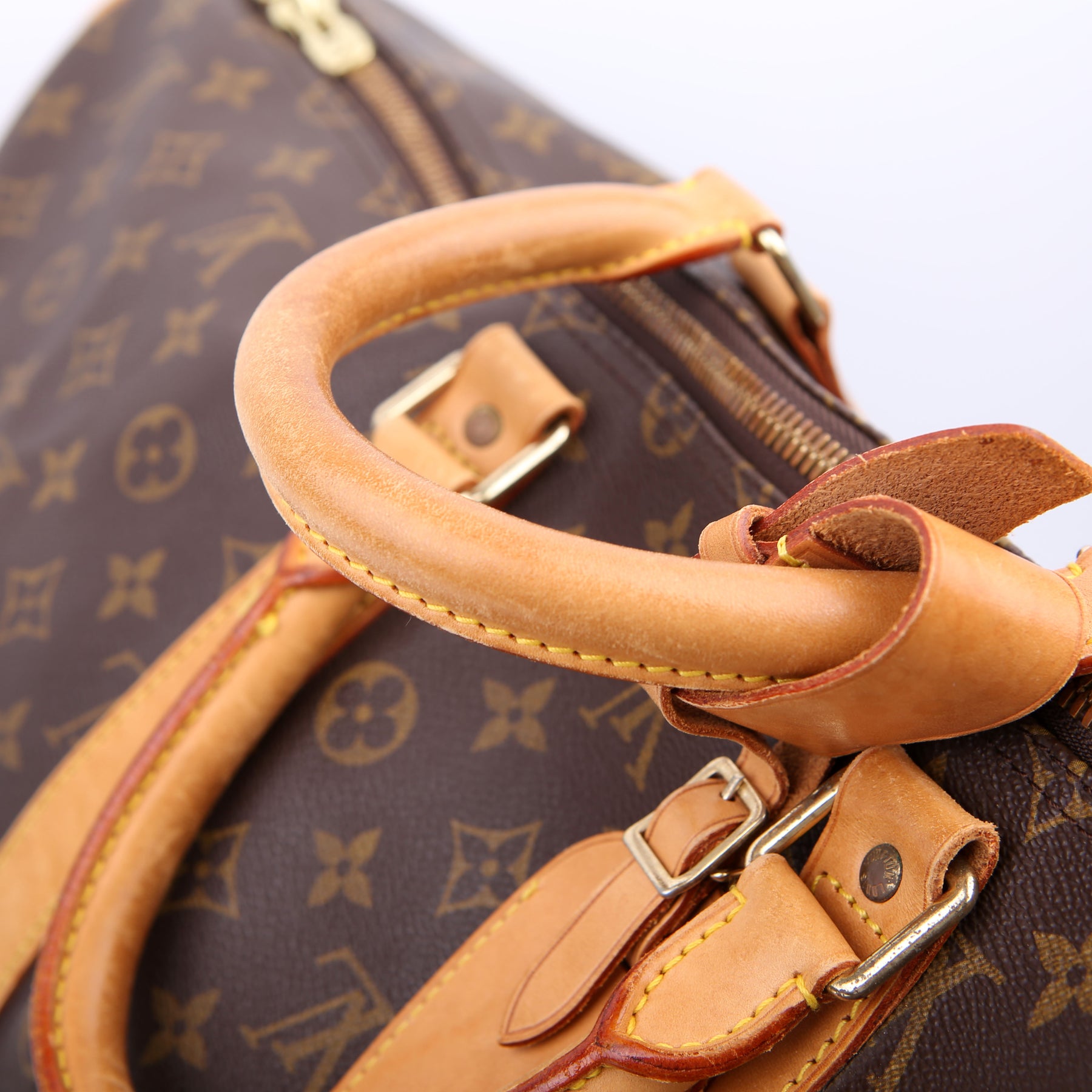 This pre-owned Louis Vuitton Keepall 55 Bandouliere is guaranteed 100% authentic. The exterior is in the classic Louis Vuitton Monogram coated canvas.