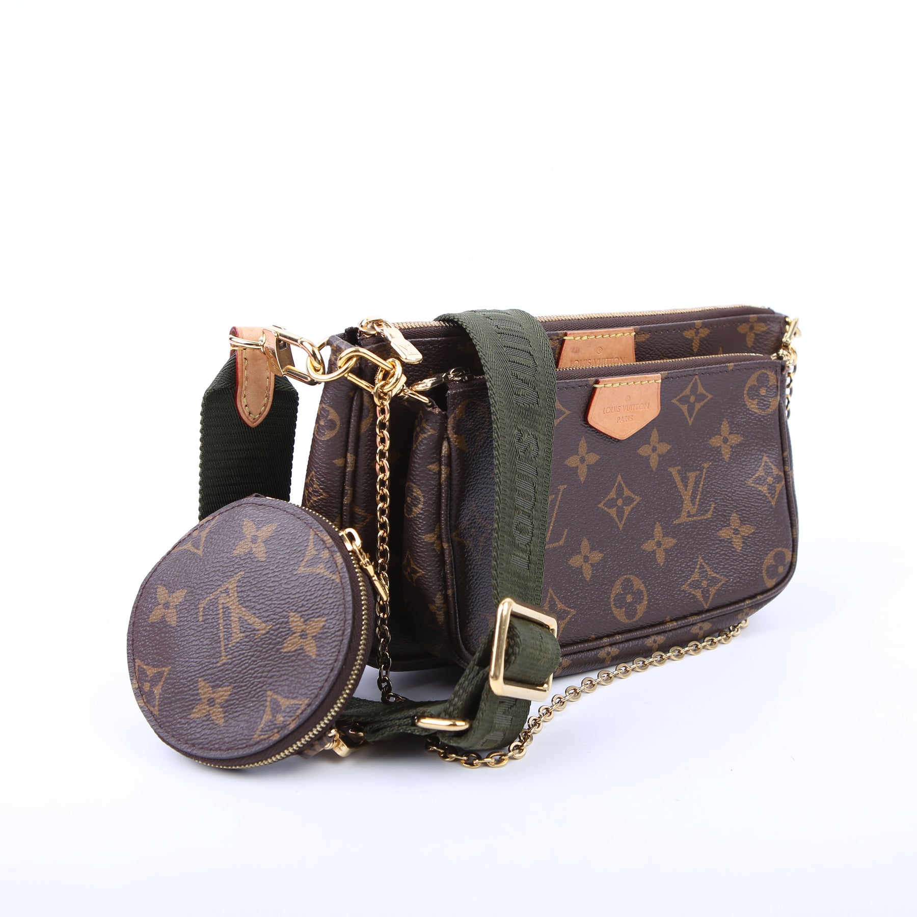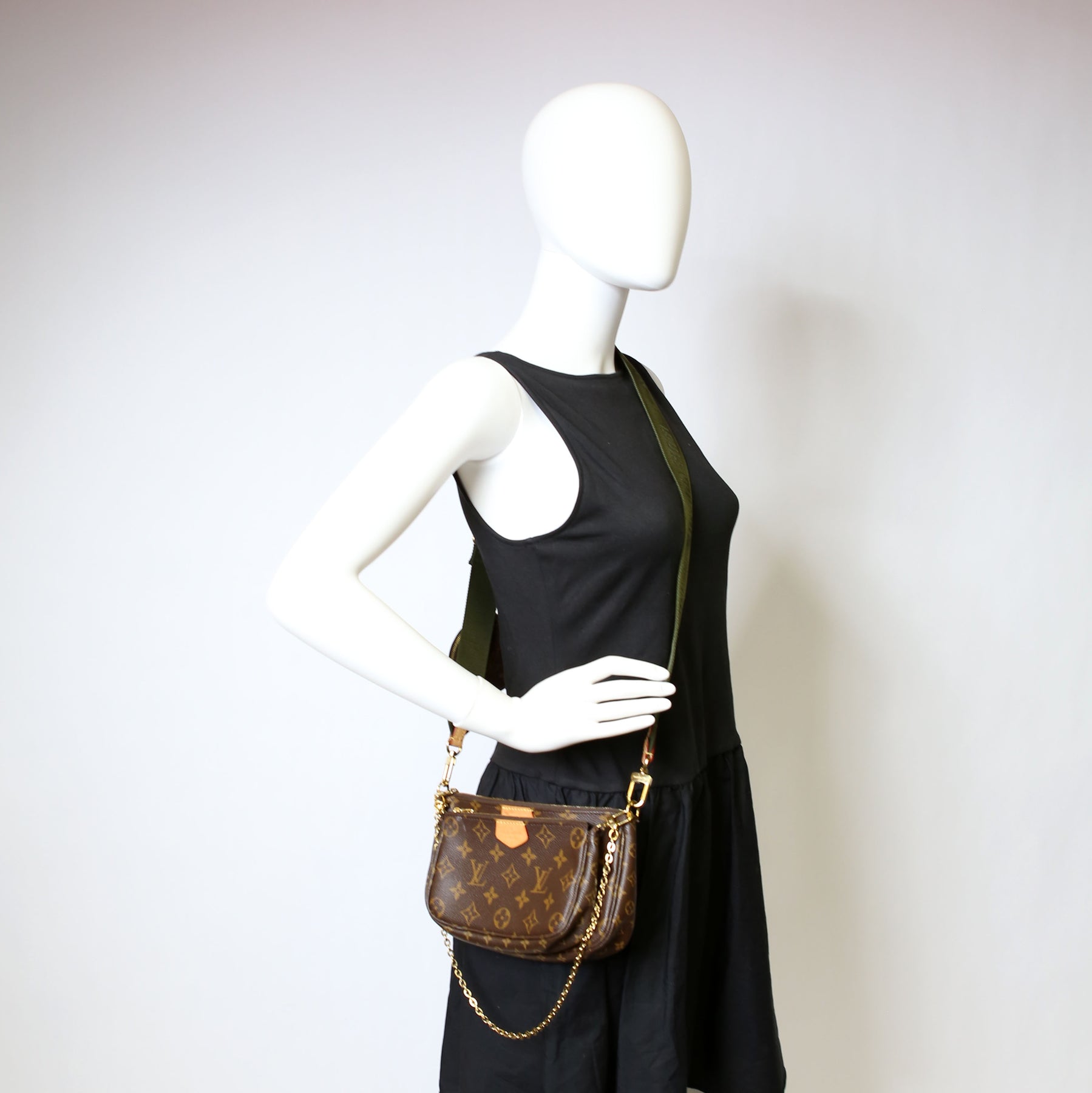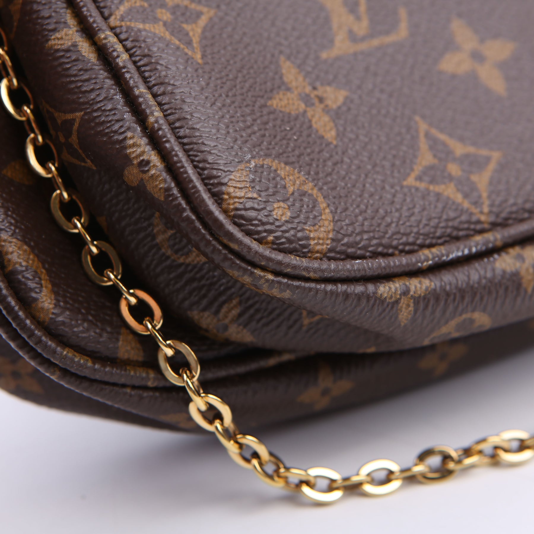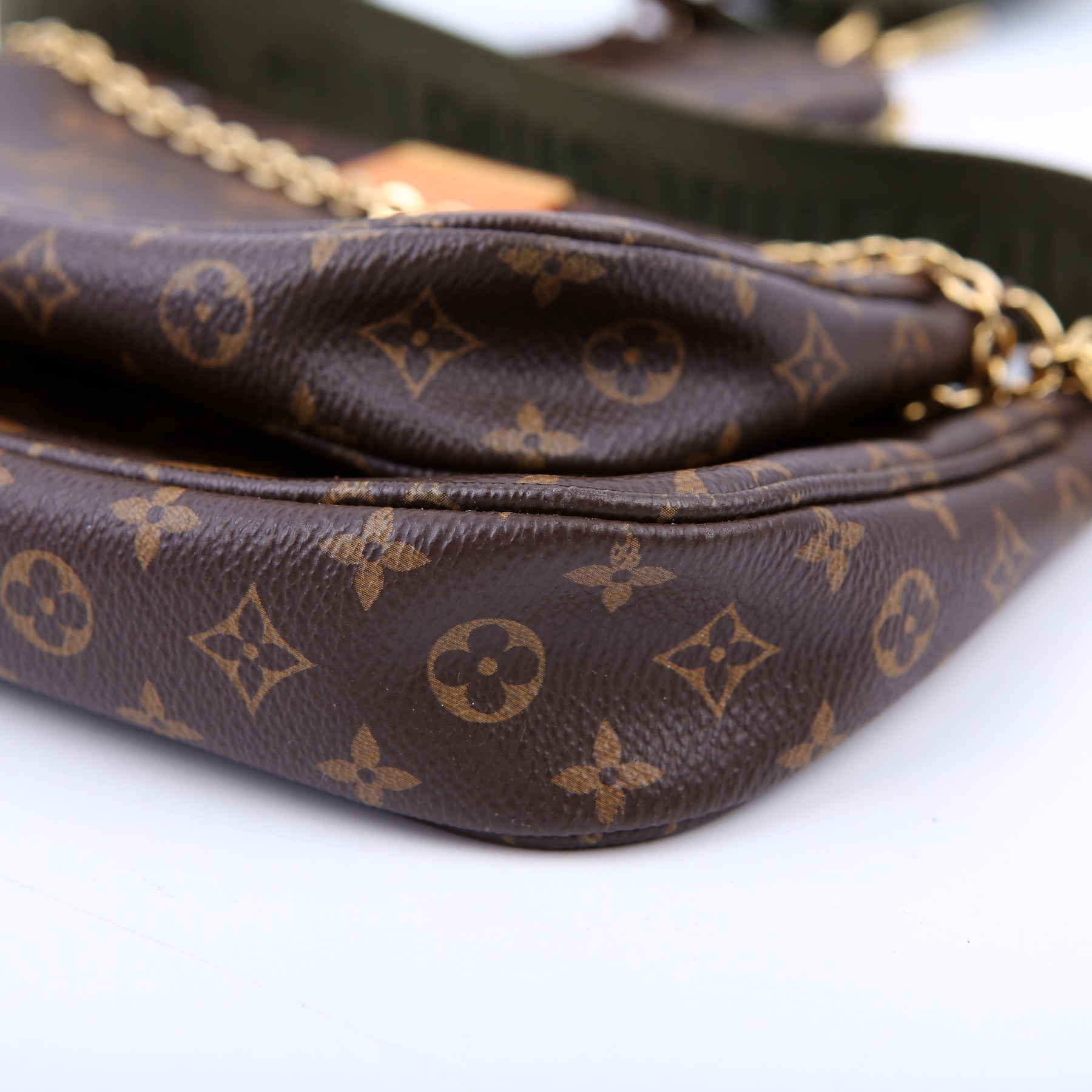This pre-owned Louis Vuitton Multi Pochette is guaranteed 100% authentic. The exterior is in the classic Louis Vuitton Monogram Coated Canvas.