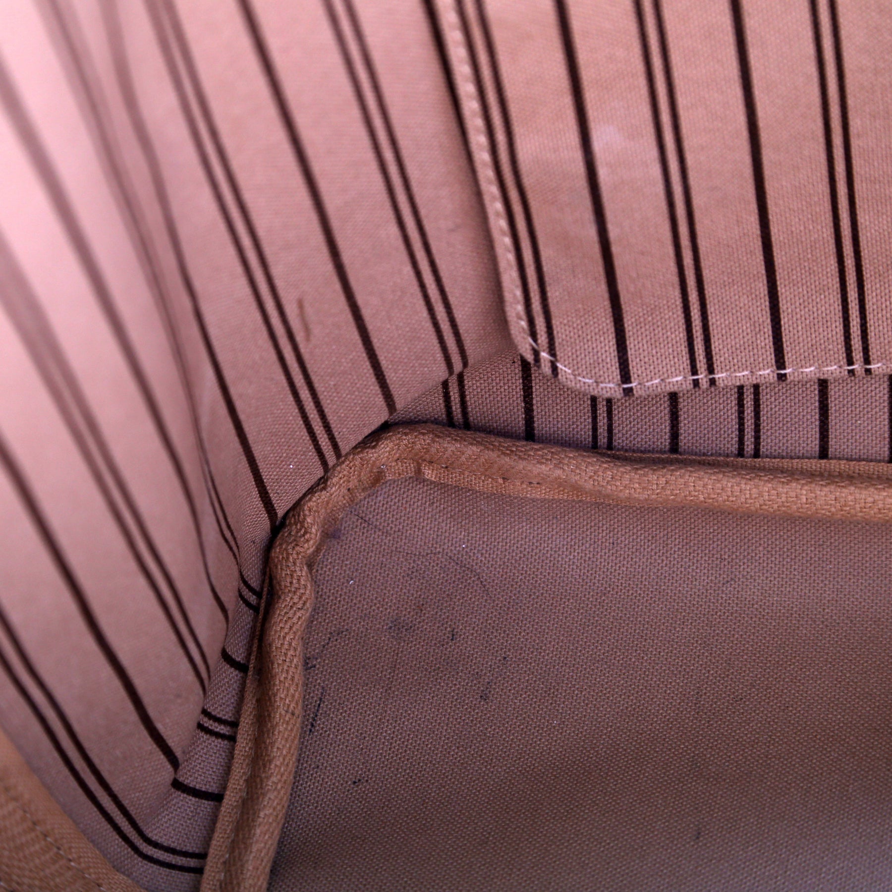 Exterior: The exterior coated canvas is free of any rips or cracks, there are minor scuffs throughout. The corners show minor rubbing. The leather trim shows minor wear and discoloration.