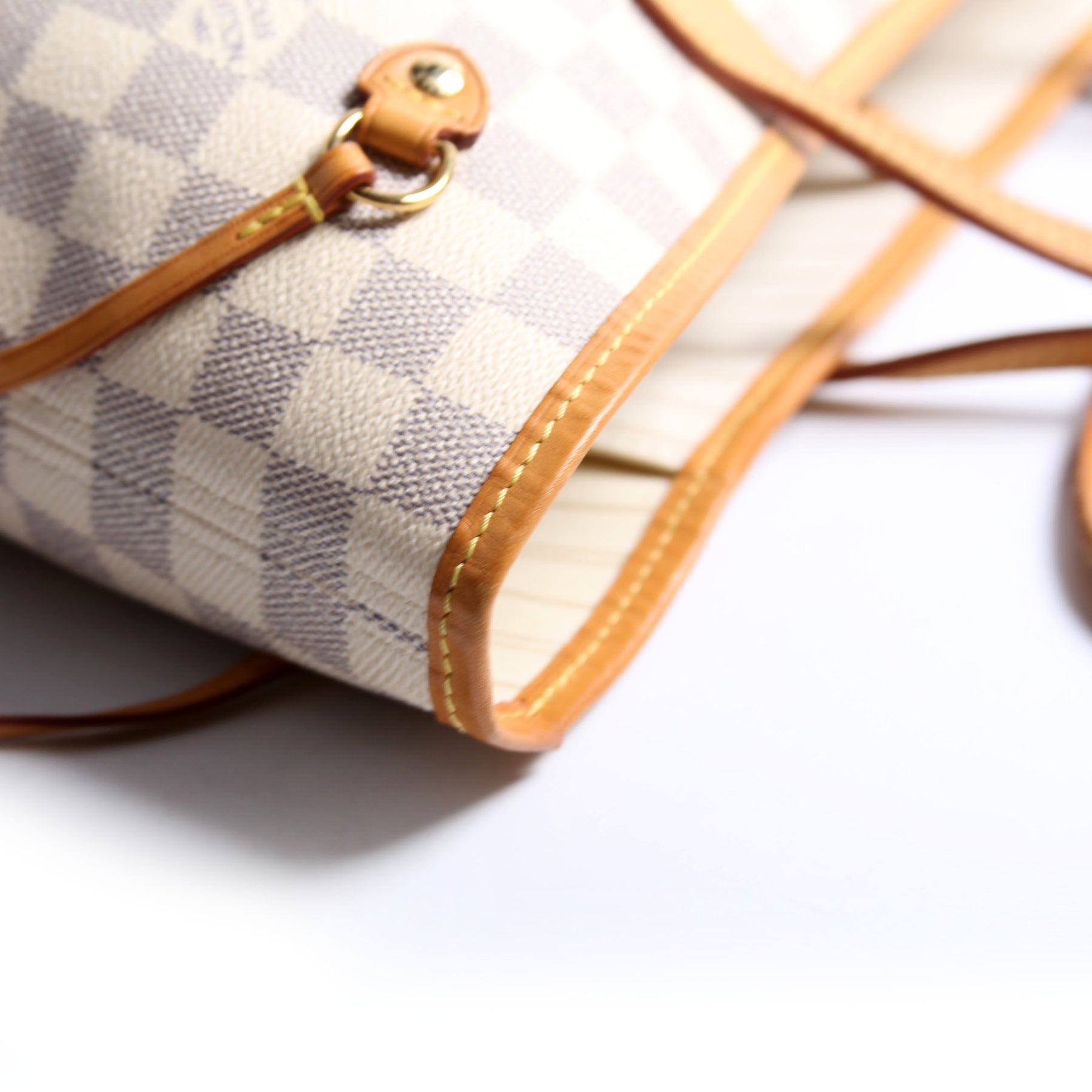 This pre-owned Louis Vuitton Neverfull MM is guaranteed 100% authentic. The exterior is in the classic Louis Vuitton Damier Azur coated canvas.