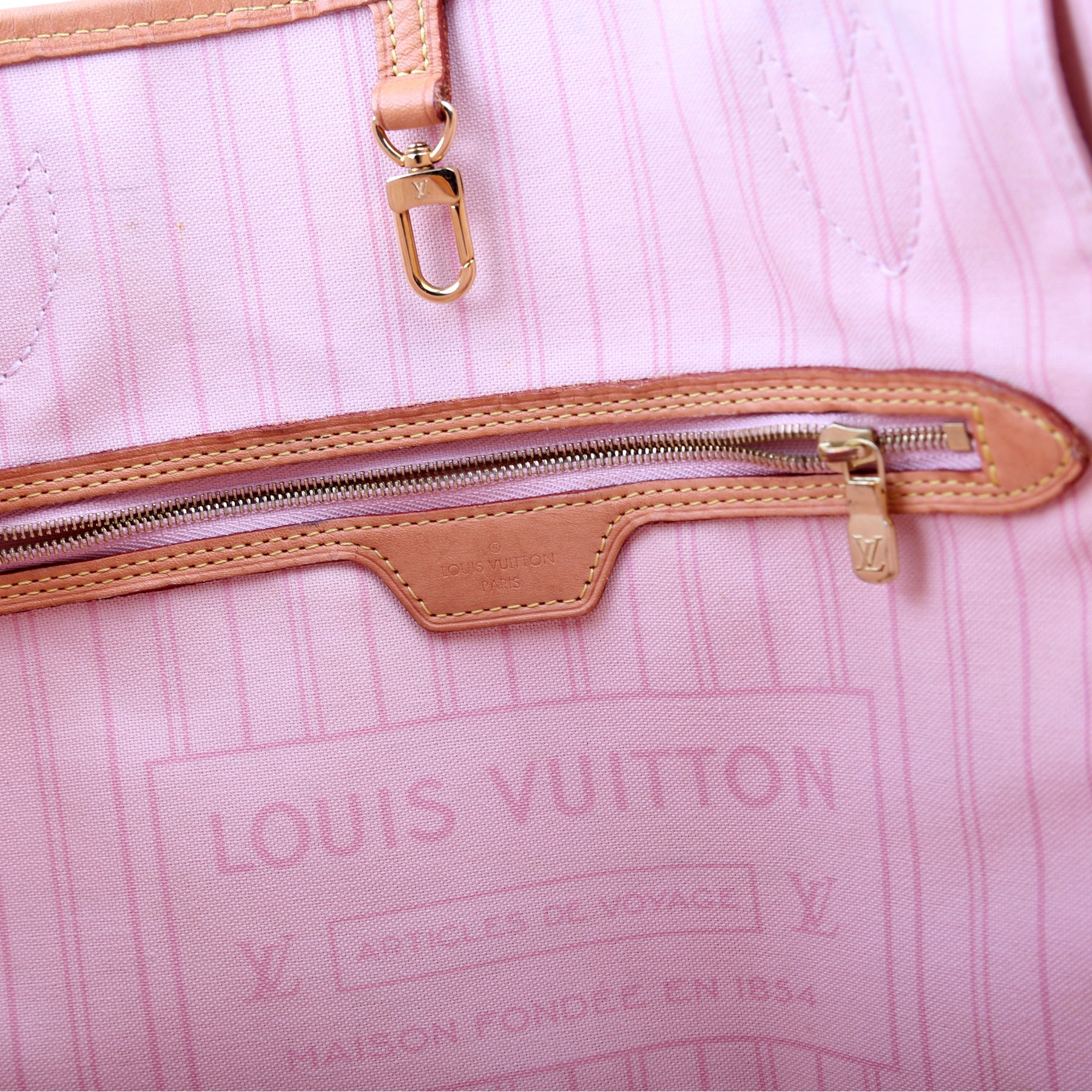 This pre-owned Louis Vuitton Neverfull MM is guaranteed 100% authentic. The exterior is in the classic Louis Vuitton Damier Azur coated canvas.