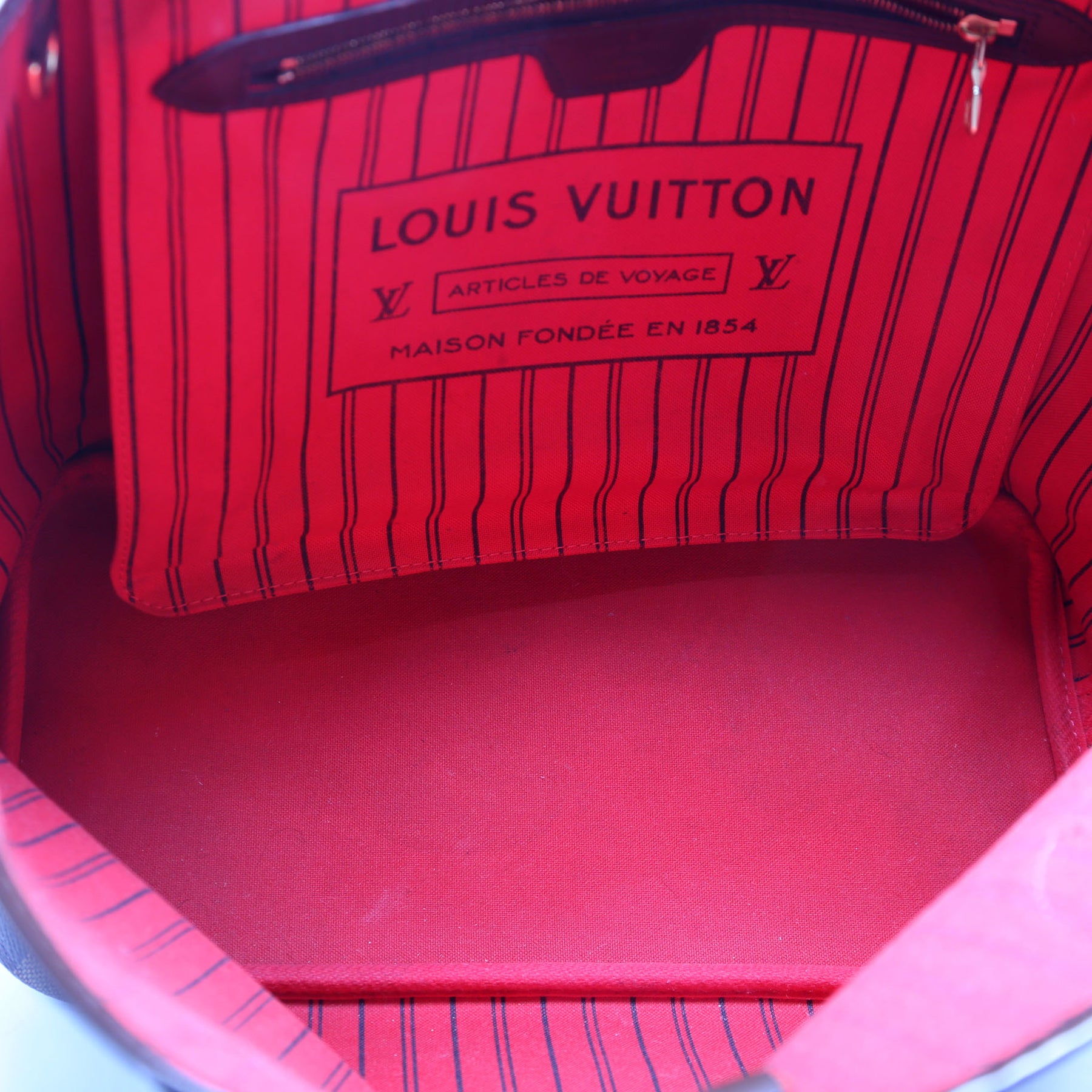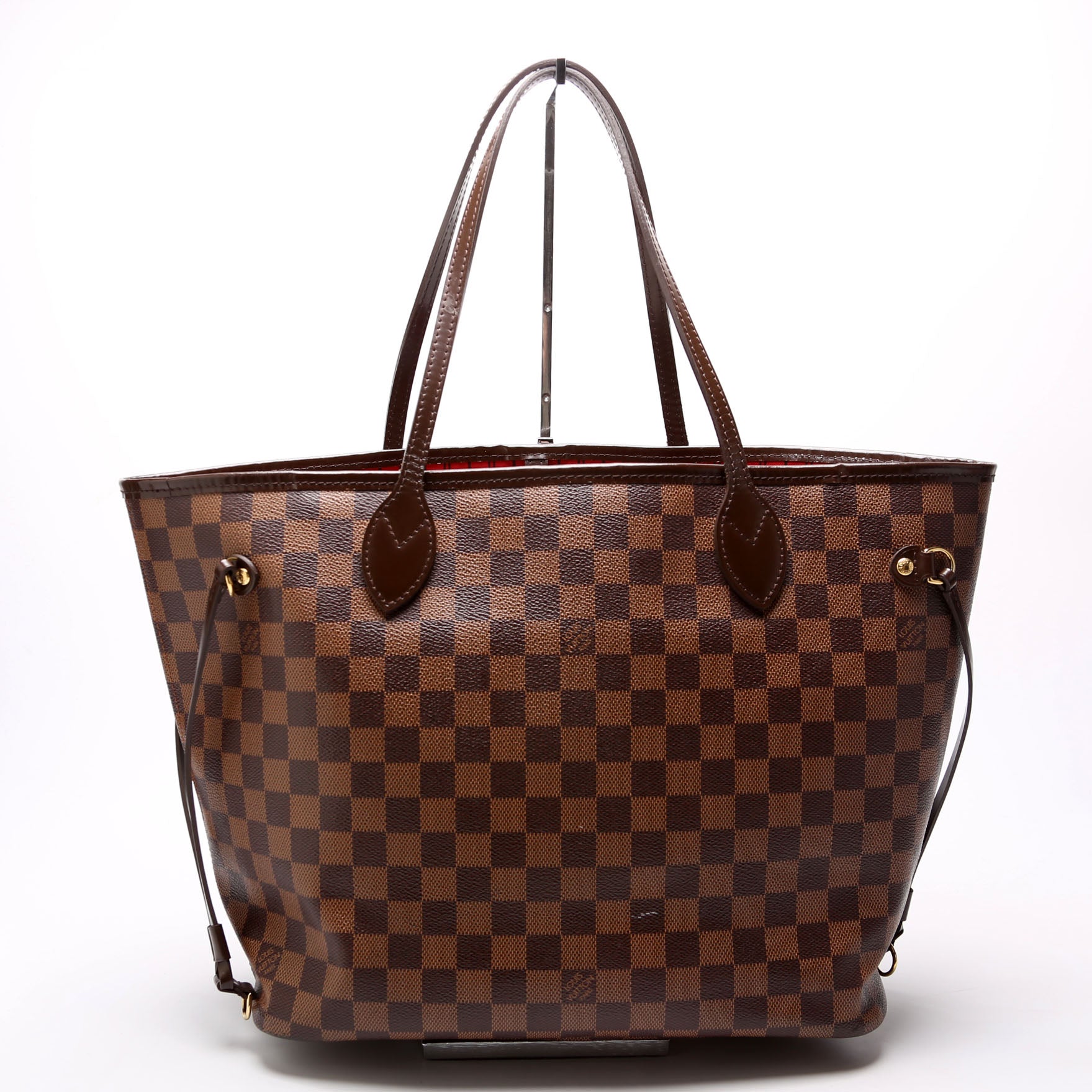 This pre-owned Louis Vuitton Neverfull MM is guaranteed 100% authentic. The exterior is in the classic Louis Vuitton Damier Ebene coated canvas.