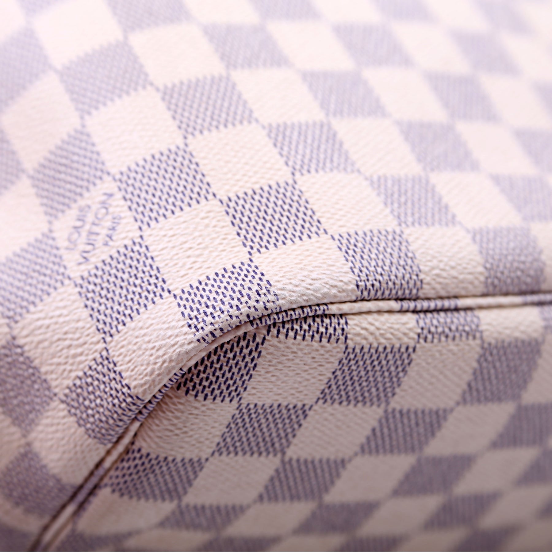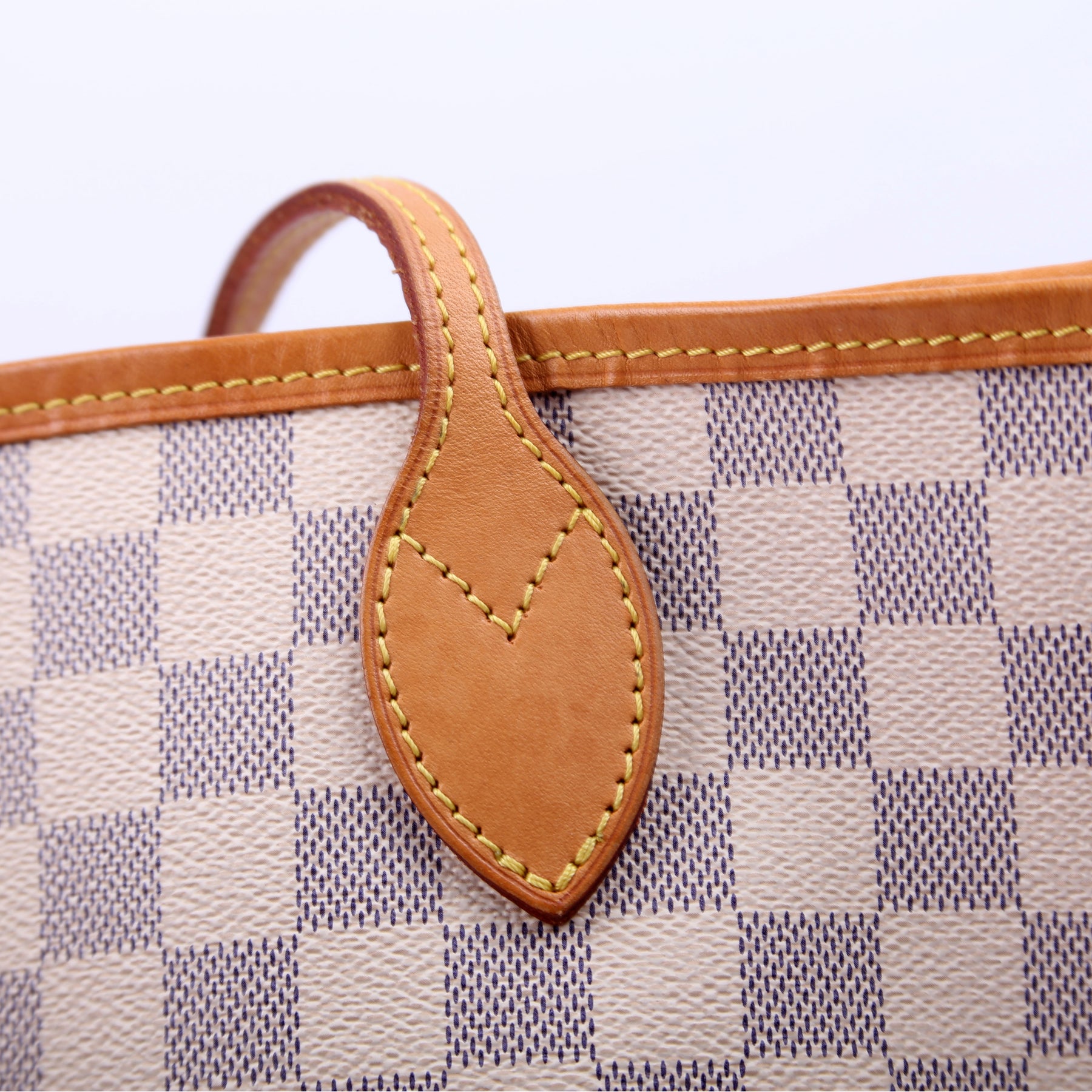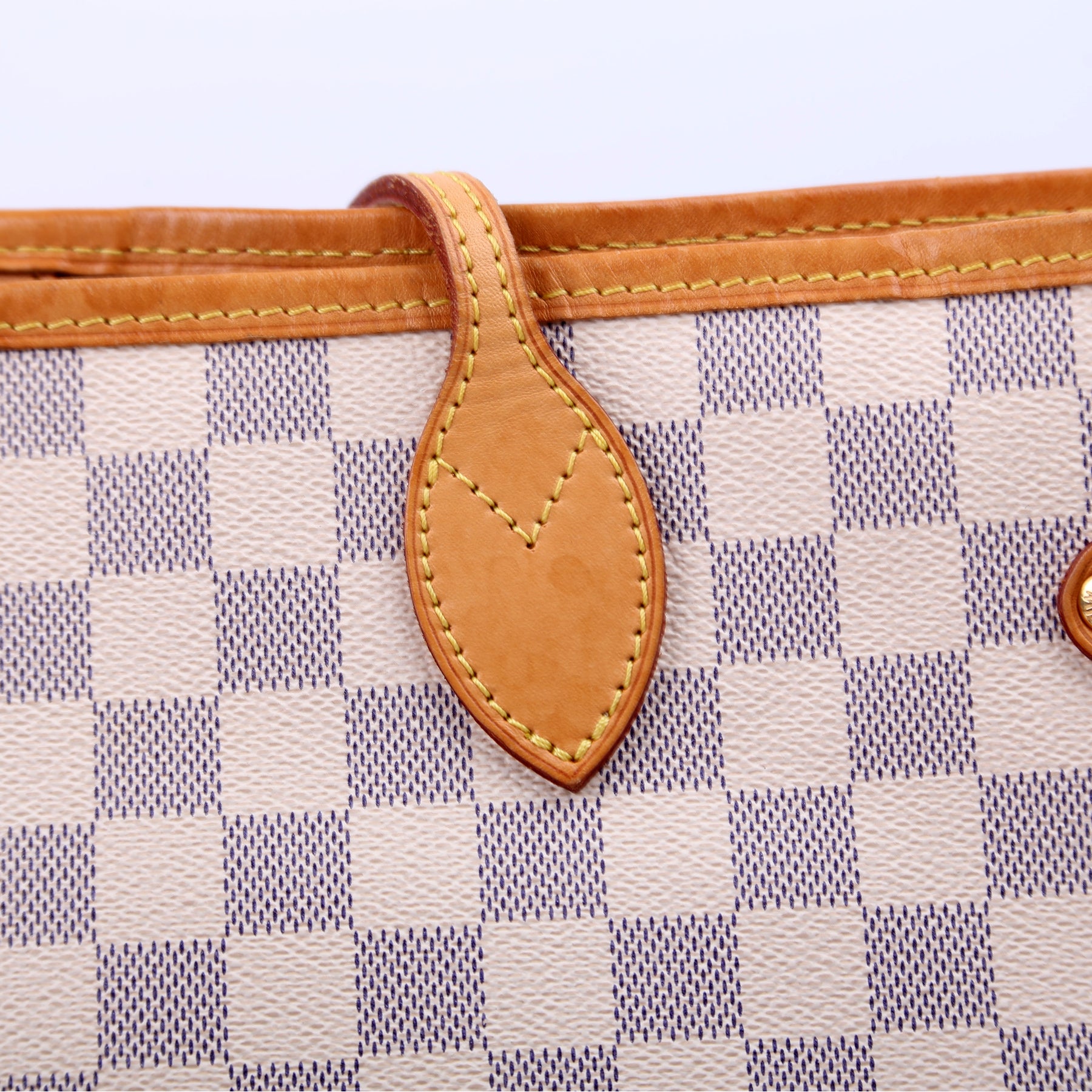 This pre-owned Louis Vuitton Neverfull MM W/Wallet is guaranteed 100% authentic. The exterior is in the classic Louis Vuitton Damier Azur coated canvas.