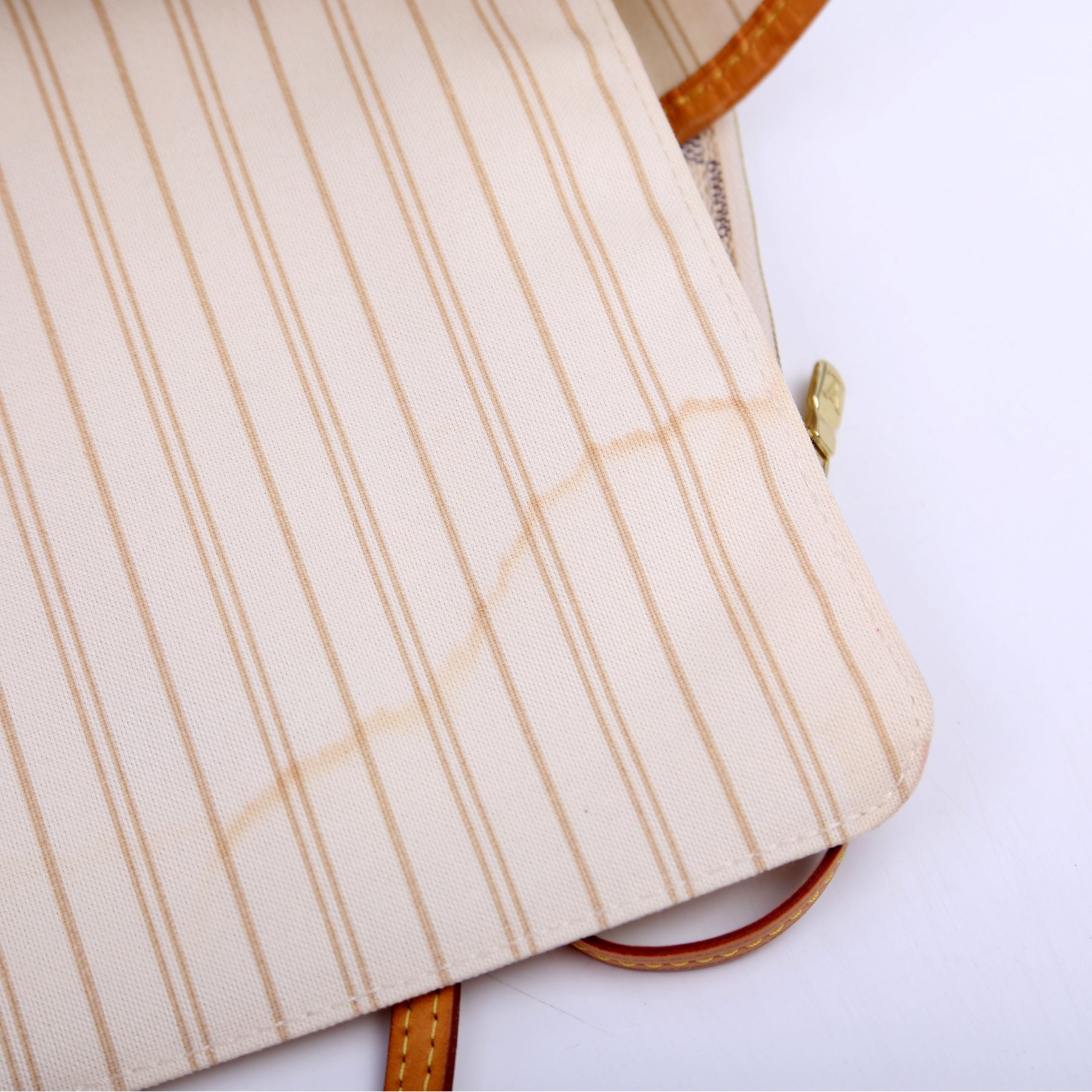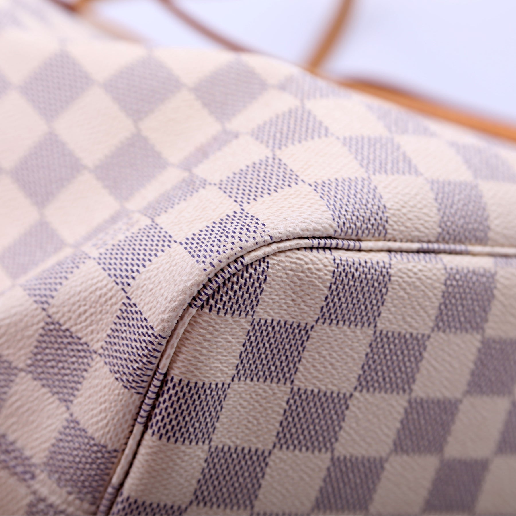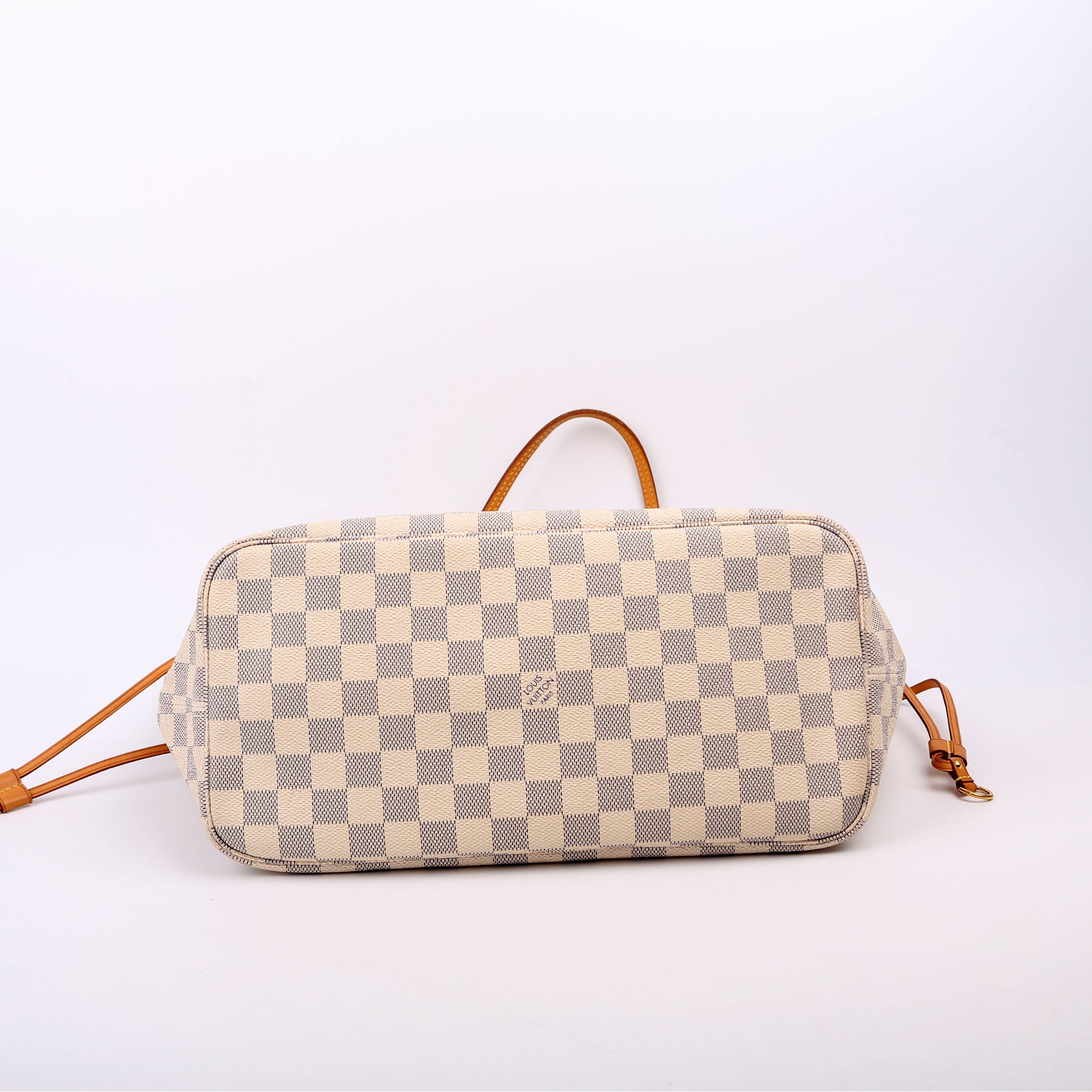 This pre-owned Louis Vuitton Neverfull MM W/Wallet is guaranteed 100% authentic. The exterior is in the classic Louis Vuitton Damier Azur coated canvas.