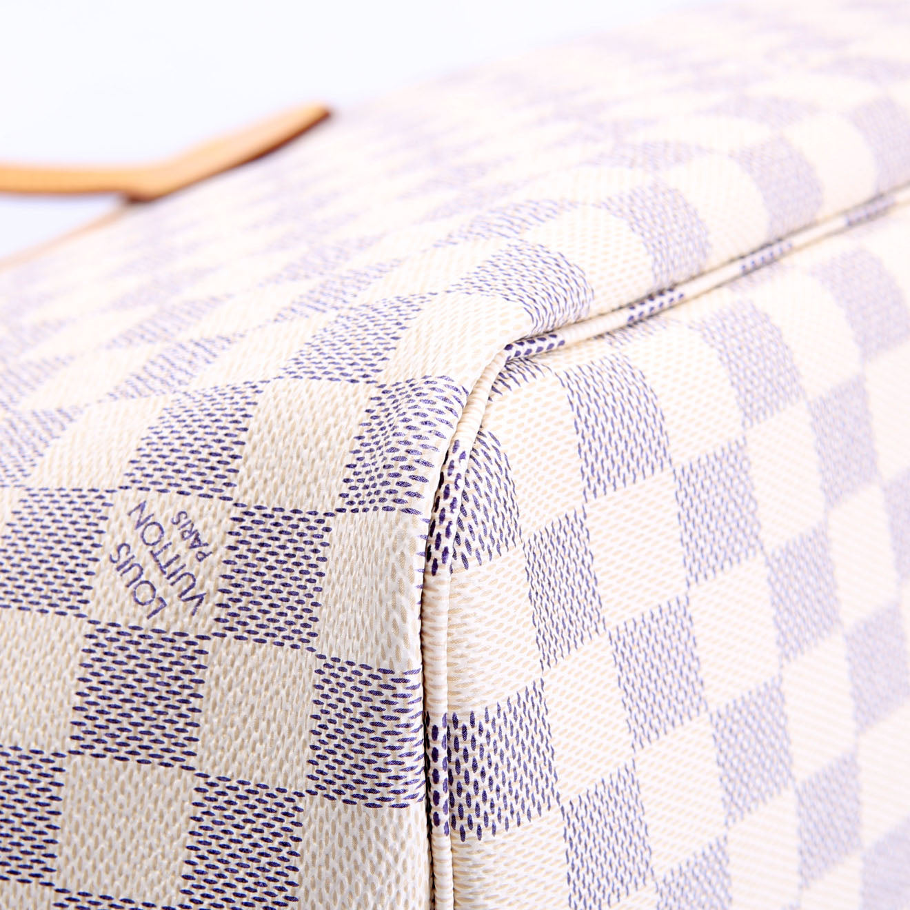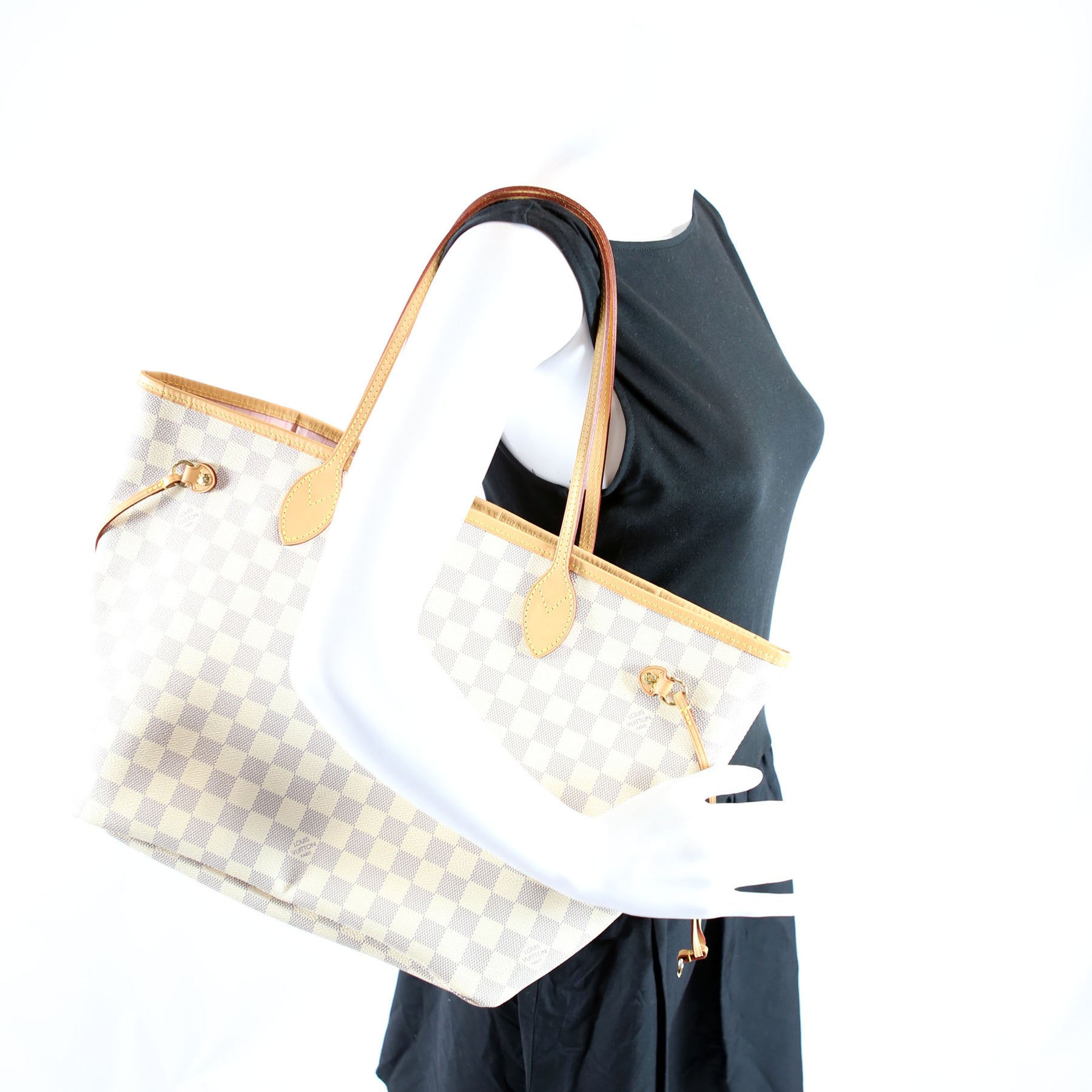 This pre-owned Louis Vuitton Neverfull MM is guaranteed 100% authentic. The exterior is in the classic Louis Vuitton Damier Azur coated canvas.