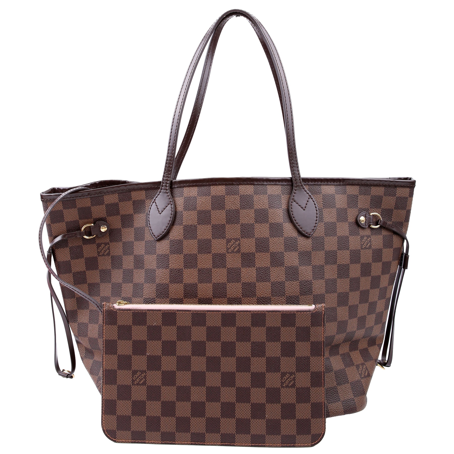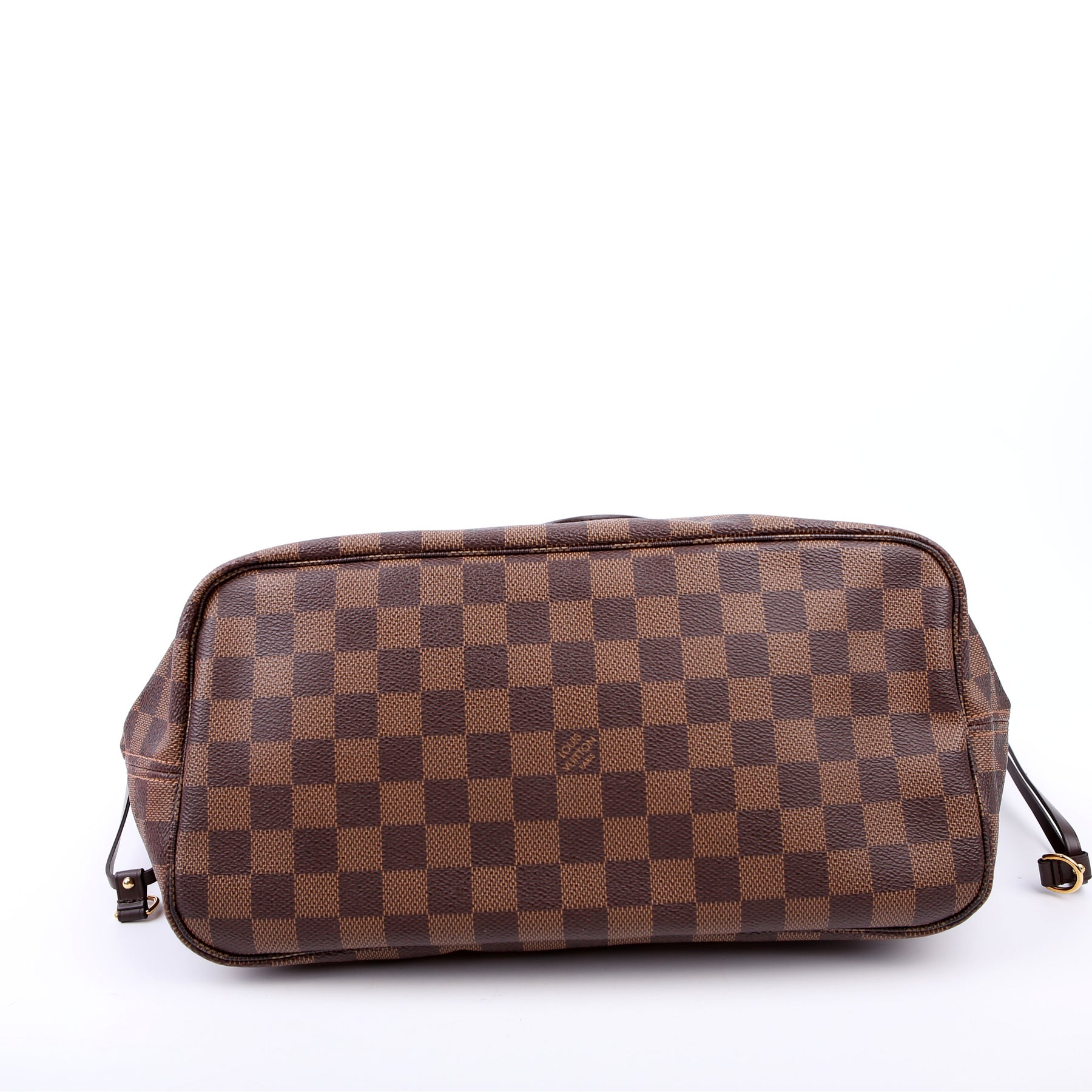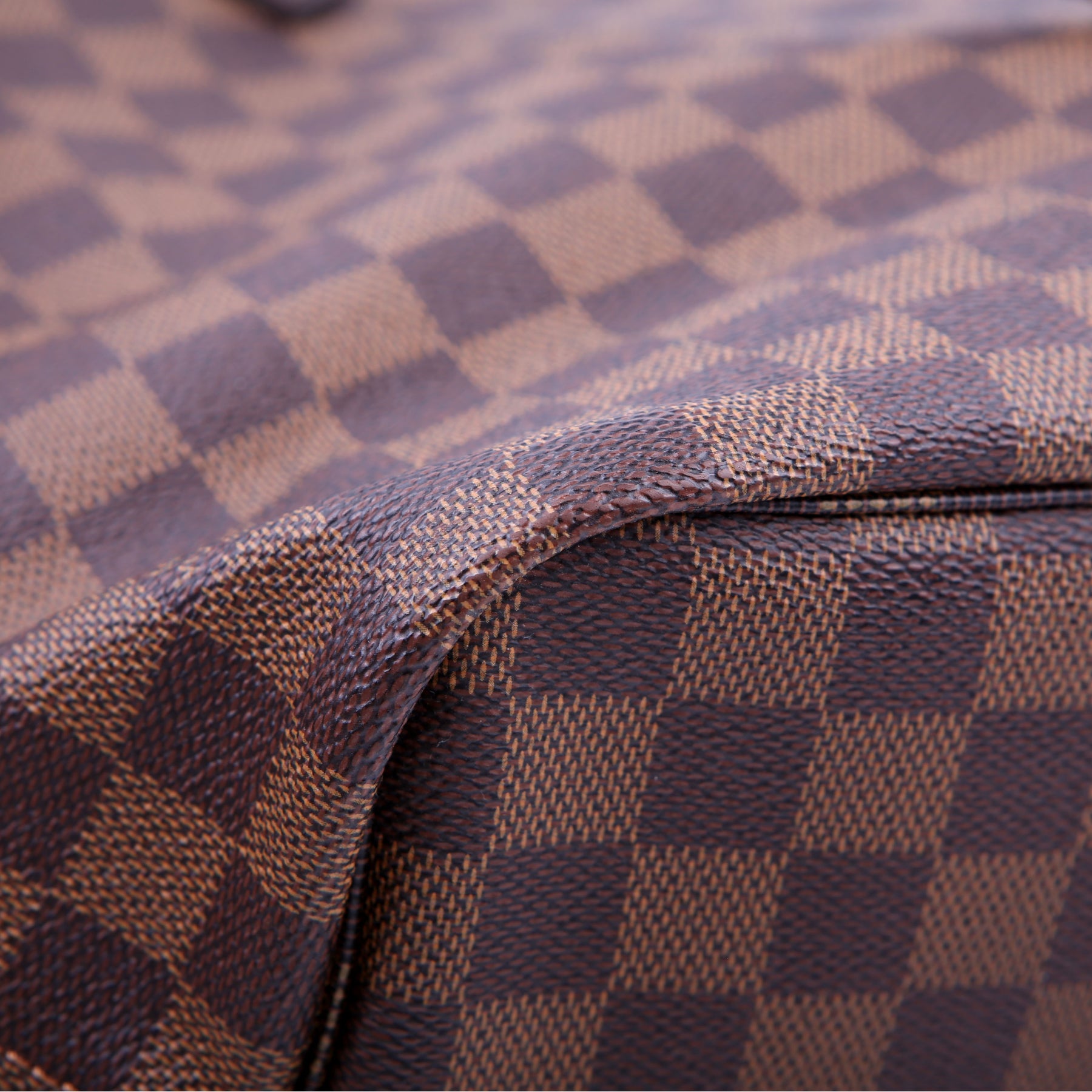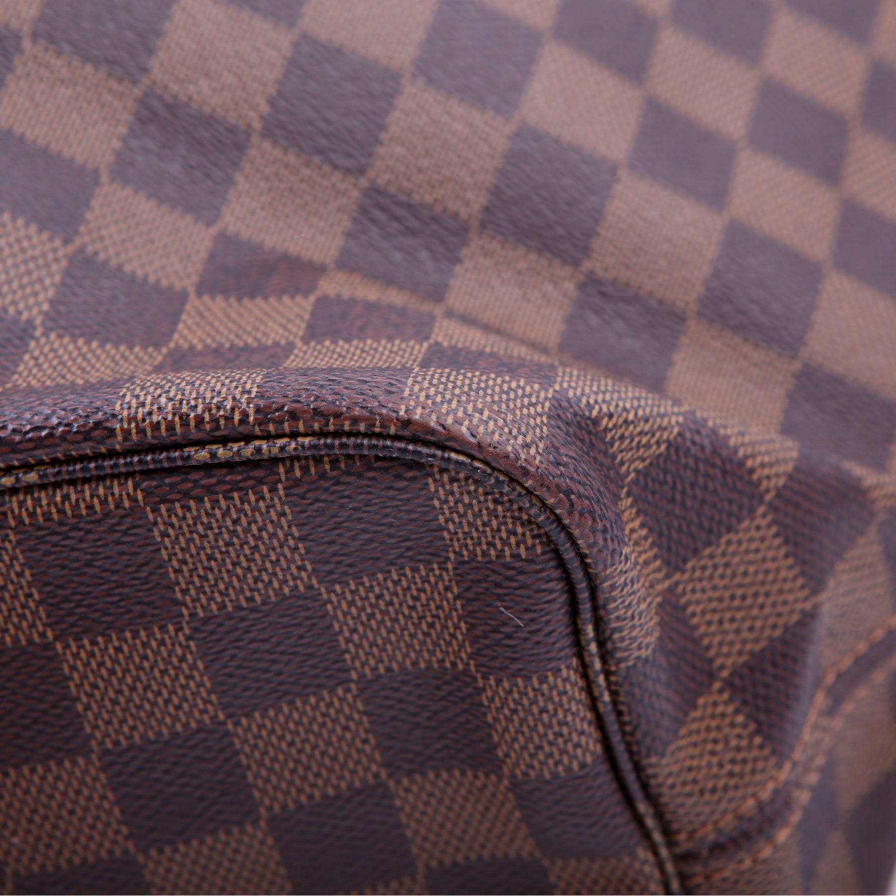 This pre-owned Louis Vuitton Neverfull MM W/Wallet is guaranteed 100% authentic. The exterior is in the classic Louis Vuitton Damier Ebene coated canvas.