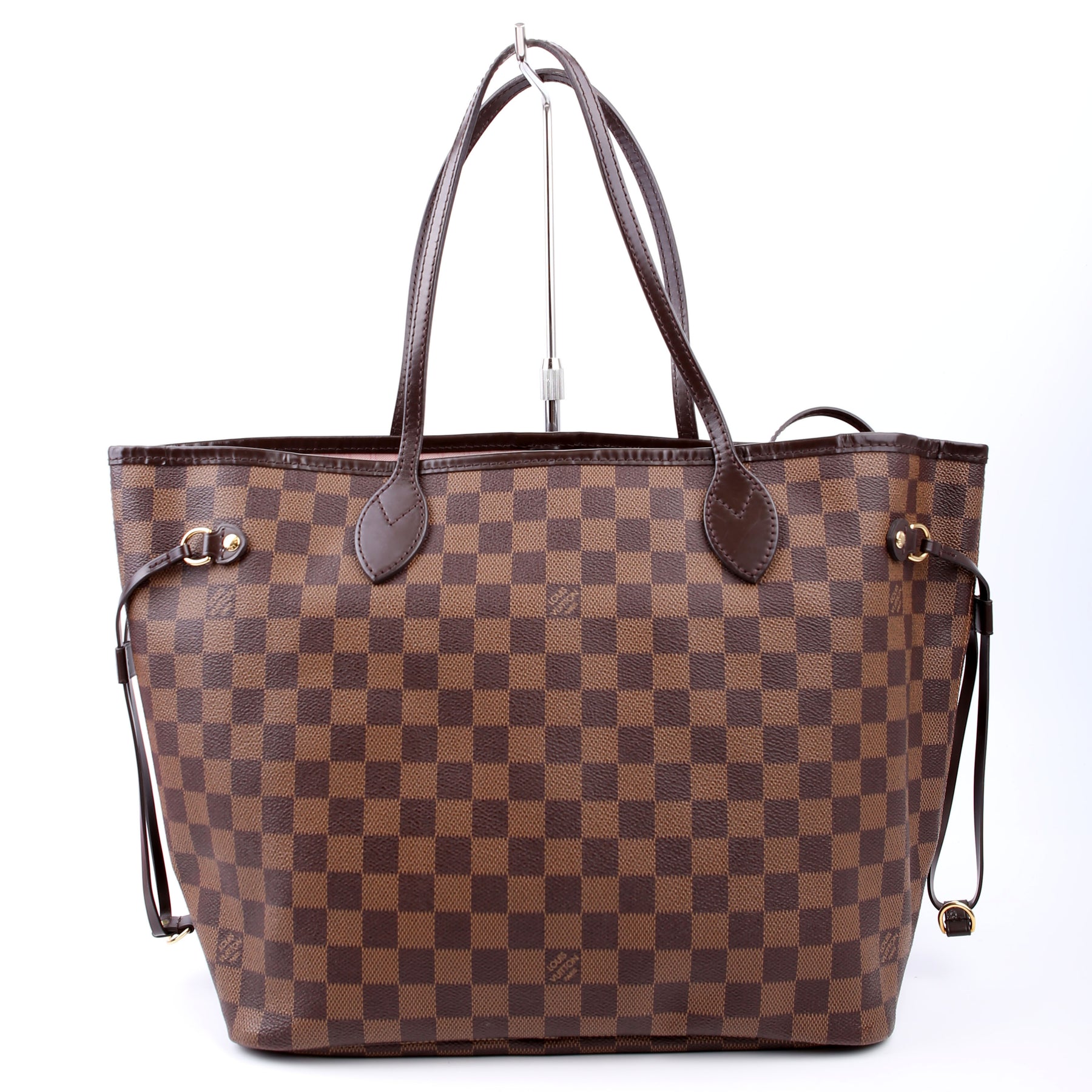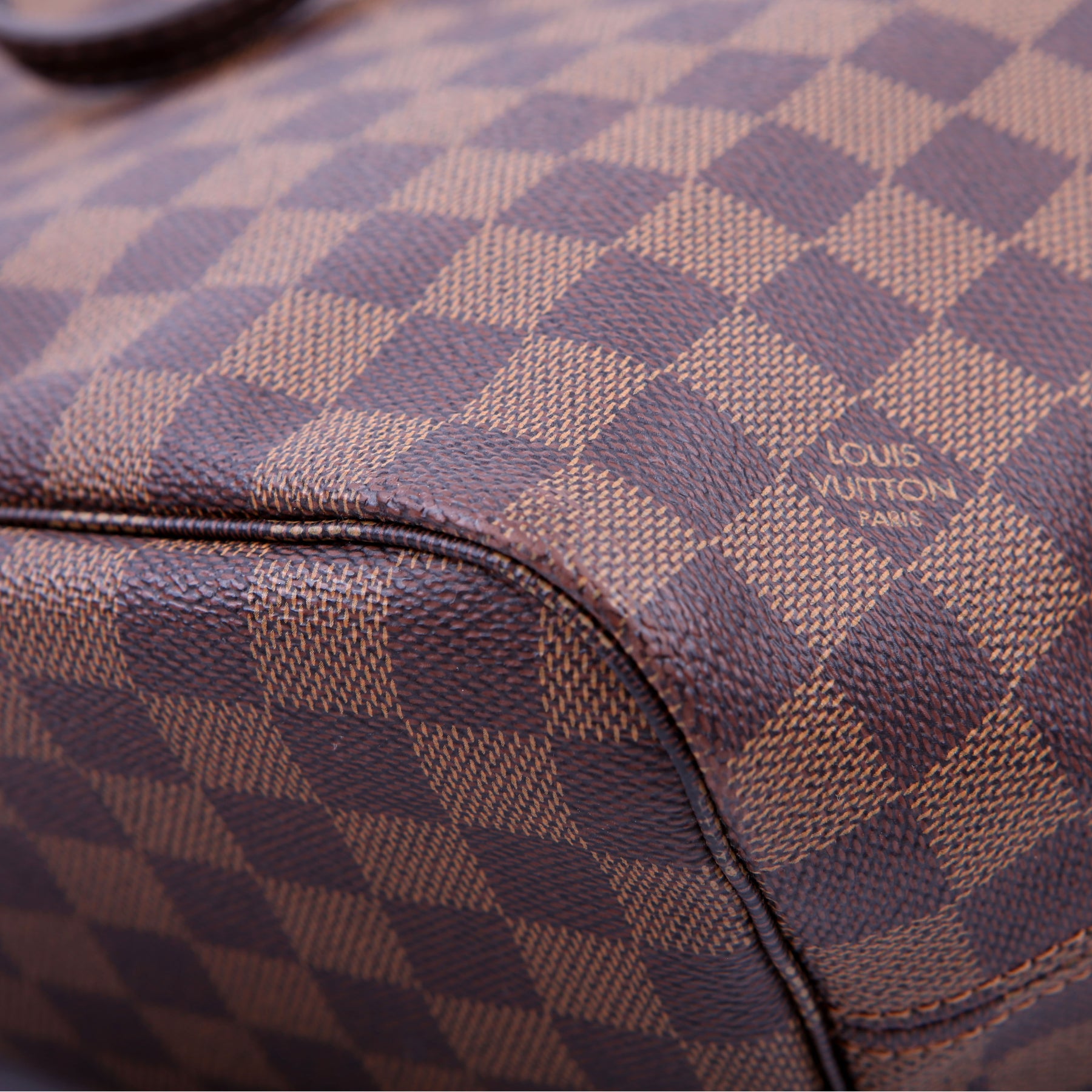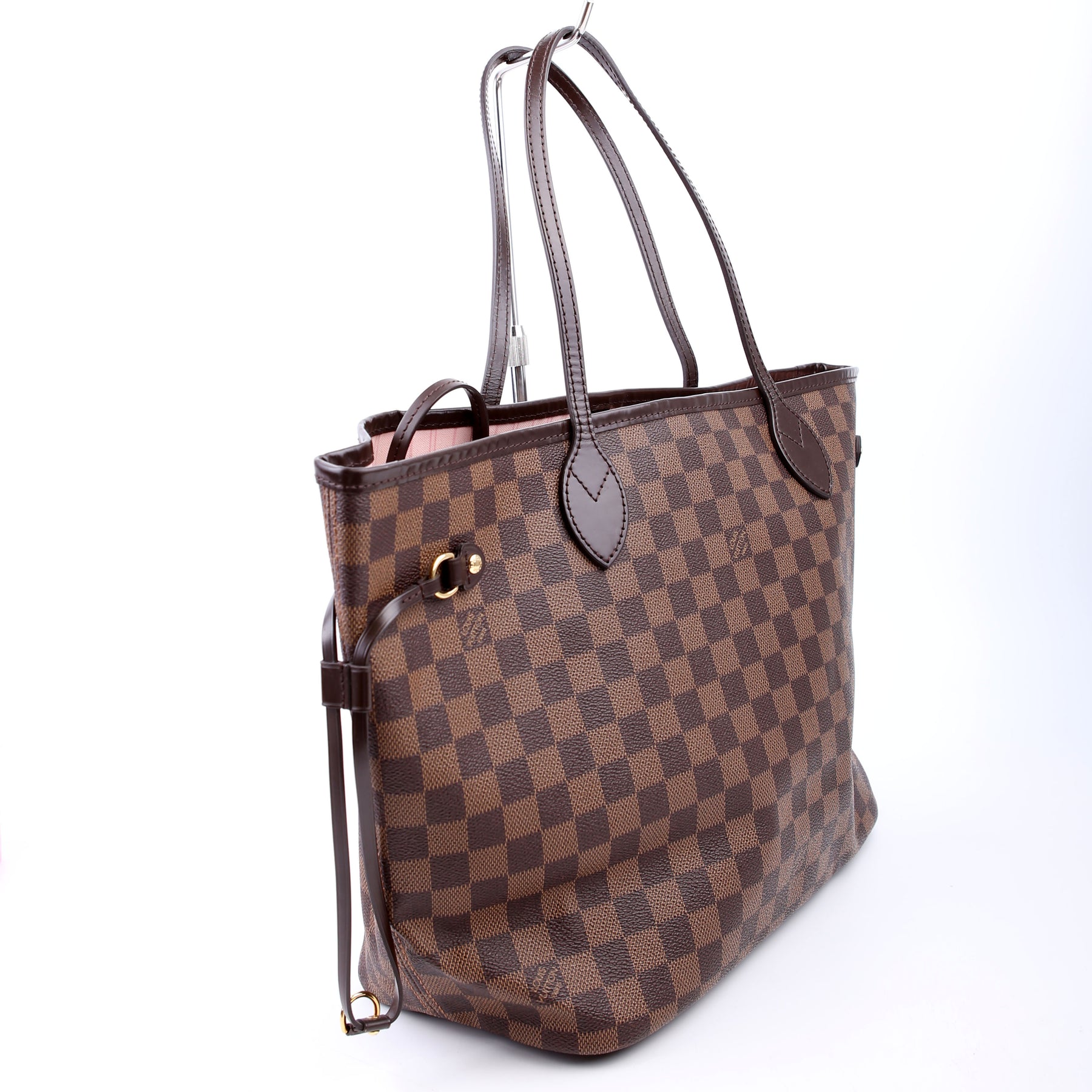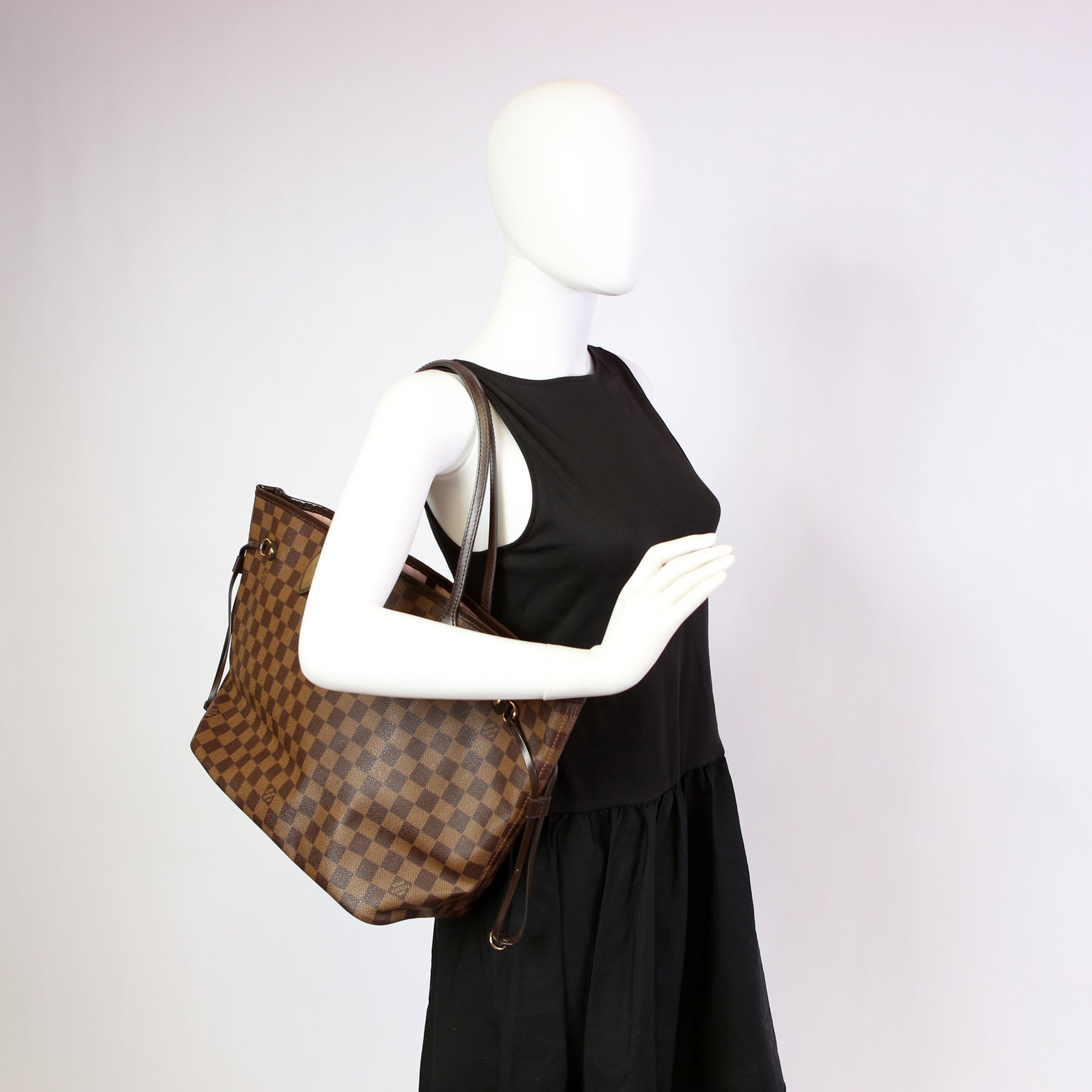 This pre-owned Louis Vuitton Neverfull MM W/Wallet is guaranteed 100% authentic. The exterior is in the classic Louis Vuitton Damier Ebene coated canvas.