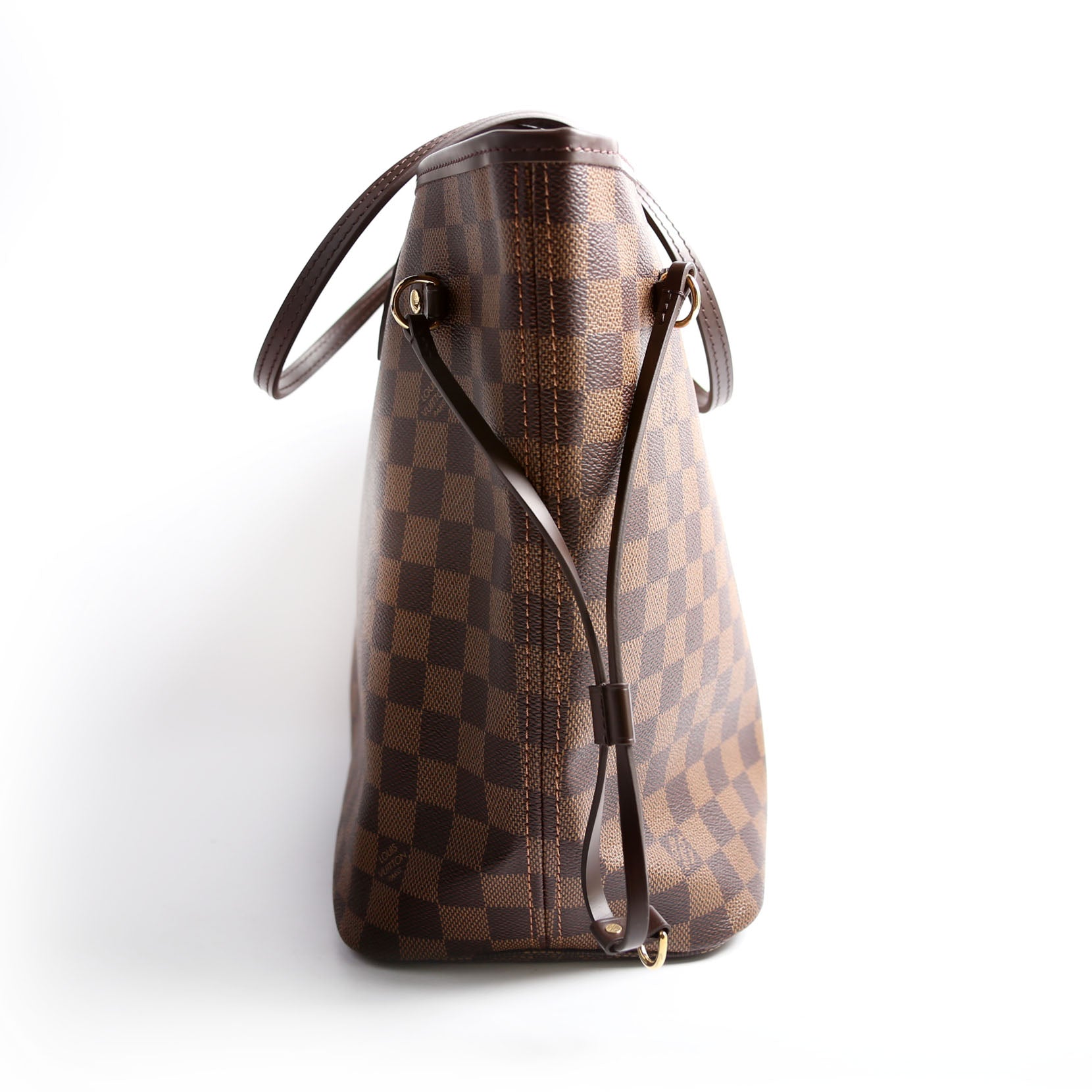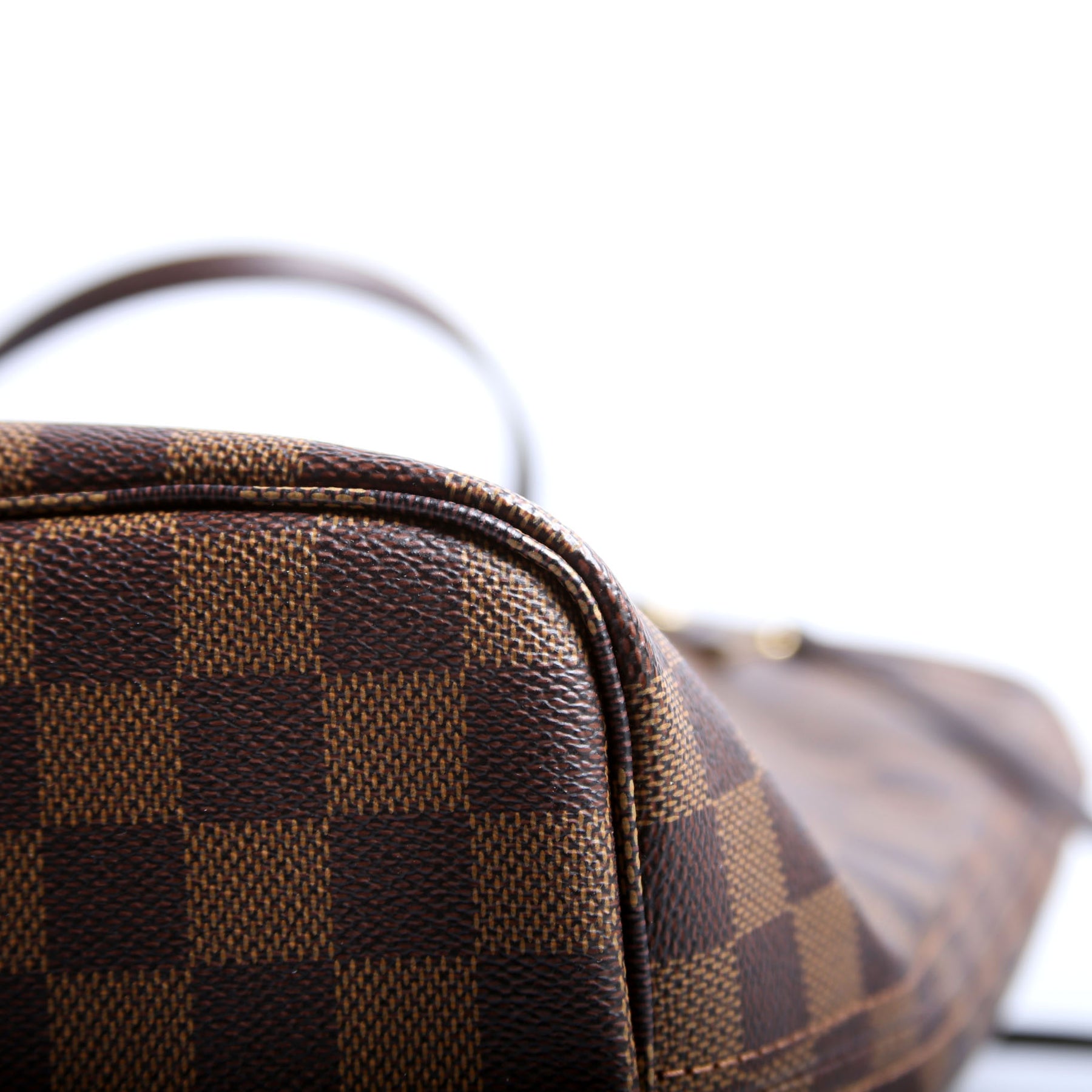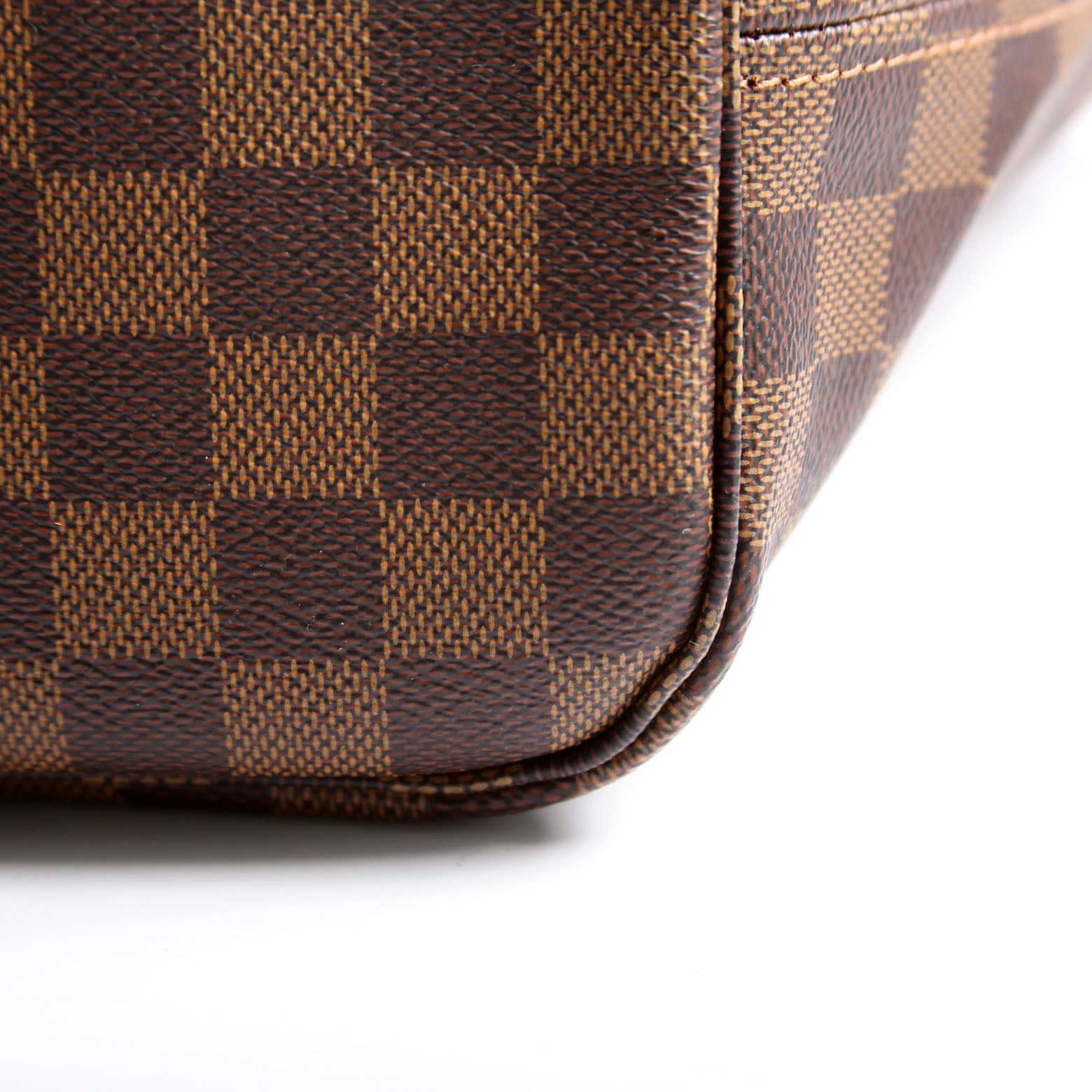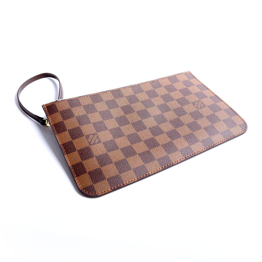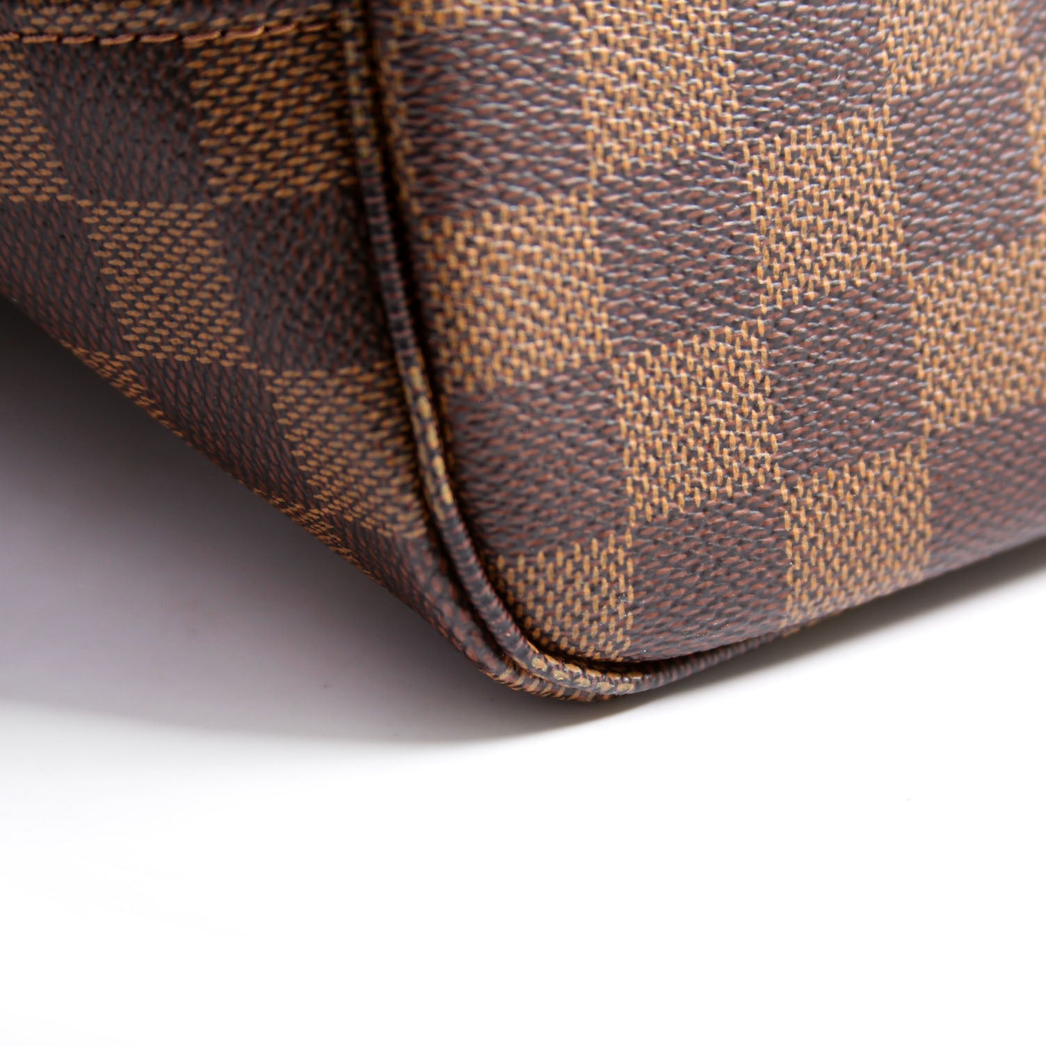 This pre-owned Louis Vuitton Neverfull MM W/Wallet is guaranteed 100% authentic. The exterior is in the classic Louis Vuitton Damier Ebene coated canvas.